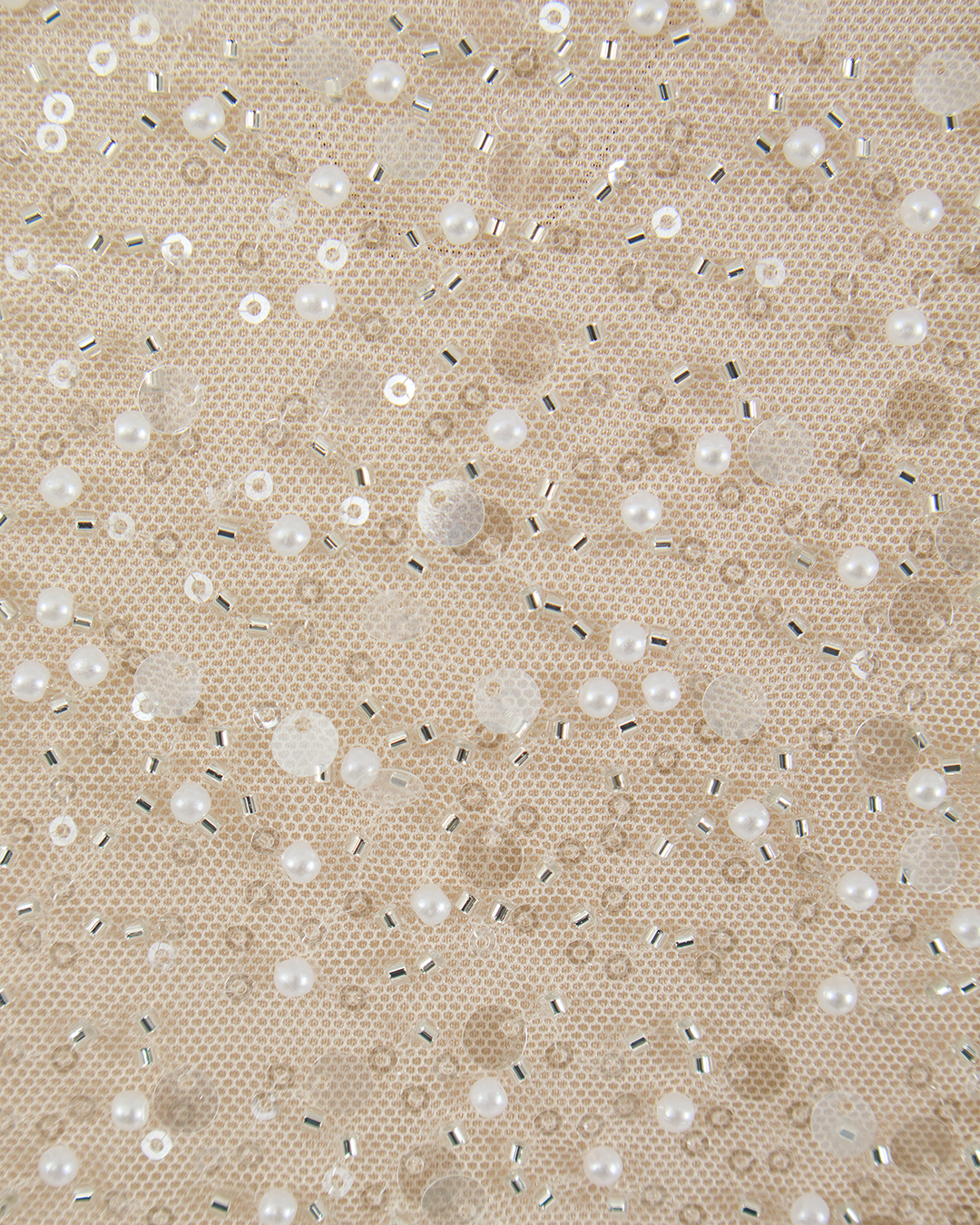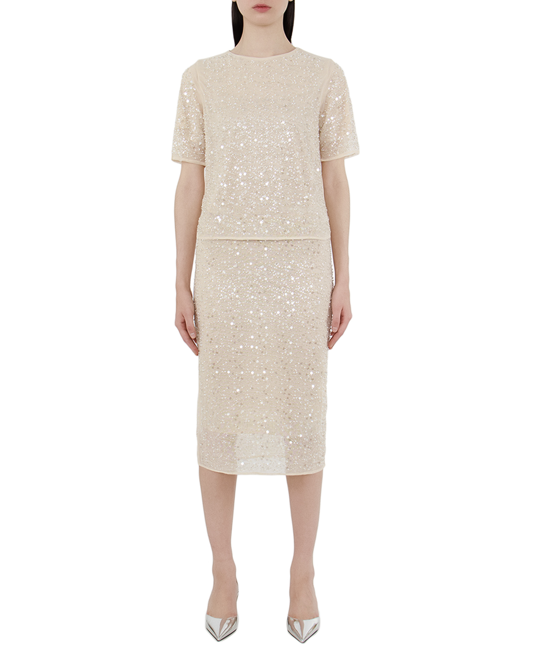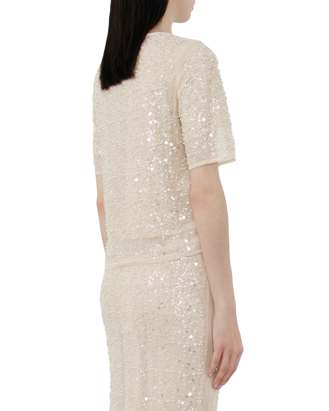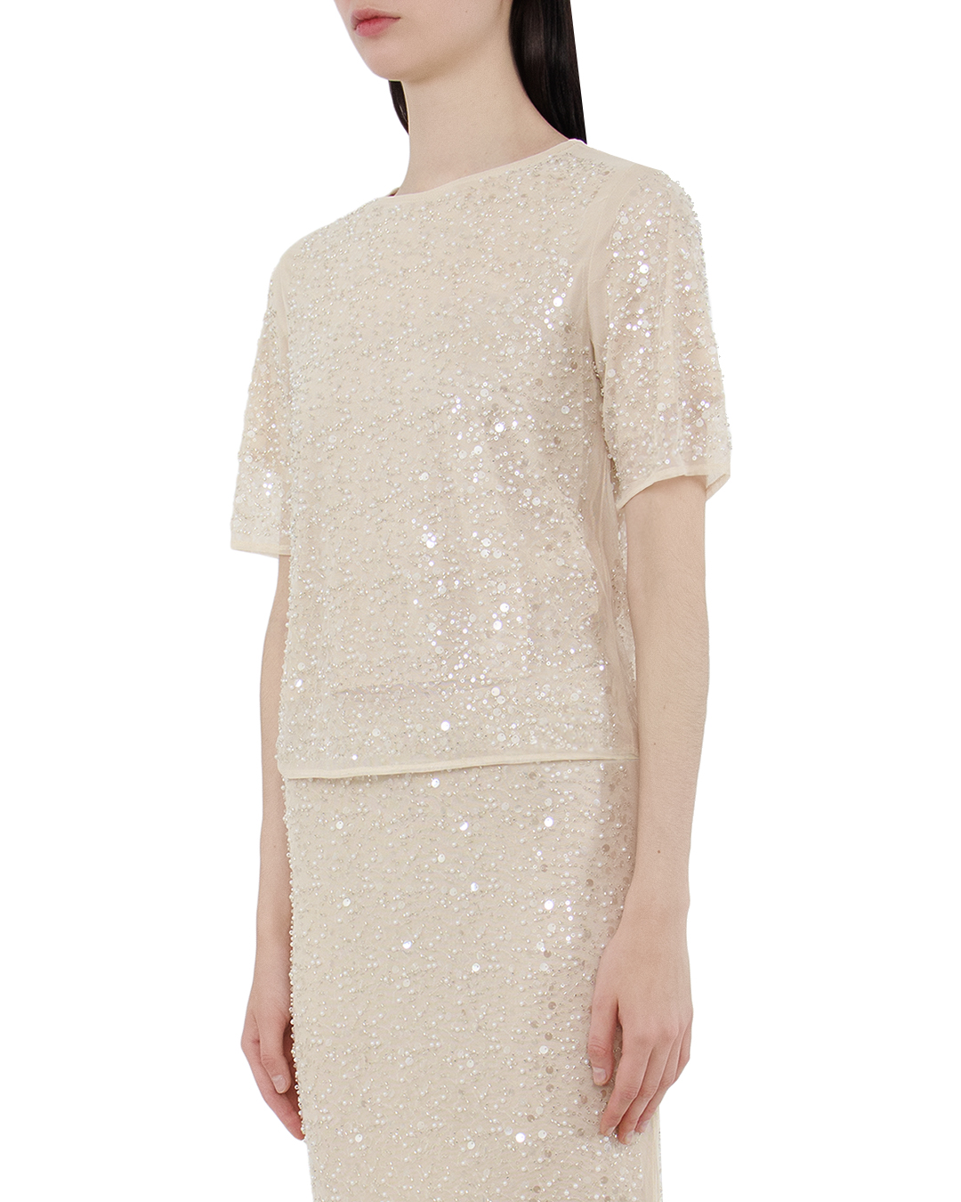 Эта блуза – изысканный пример утонченного стиля и элегантности. Модель, выполненная из деликатной полупрозрачной ткани нежного бежевого оттенка, изумительно расшита сияющими пайетками, создавая эффект нежного свечения и придания роскошного акцента. Круглый вырез подчёркивает линию шеи, а аккуратная обработка края добавляет изделию мягкости и завершенности. Короткие рукава идеально дополняют общий минималистичный дизайн, обеспечивая комфорт и свободу движений. Блуза имеет слегка укороченный крой, что делает её подходящей для создания как вечерних, так и более повседневных, но в то же время стильных образов. Лёгкая текстура ткани и сияние пайеток позволяют легко выделиться в любой обстановке, добавляя образу изюминку и свежесть. Эта блуза будет безупречно сочетаться с юбками и брюками с завышенной талией, позволяя создать как элегантный, так и более расслабленный образ, подчёркивая вашу индивидуальность и тонкое чувство стиля.