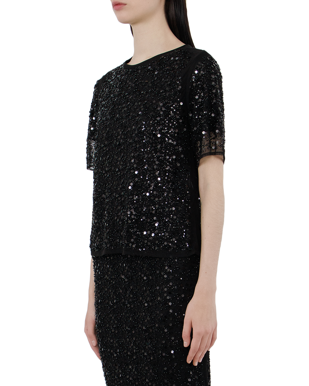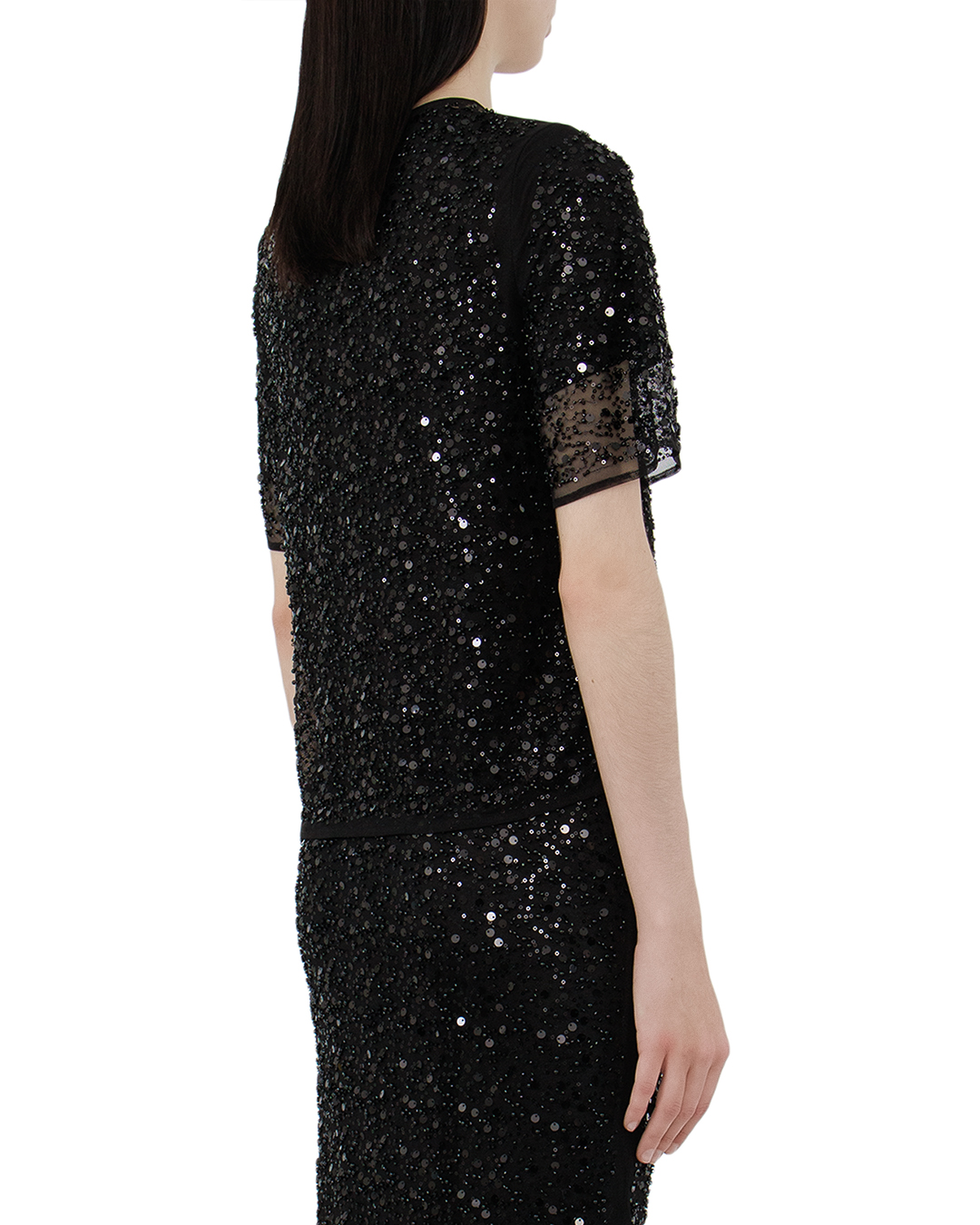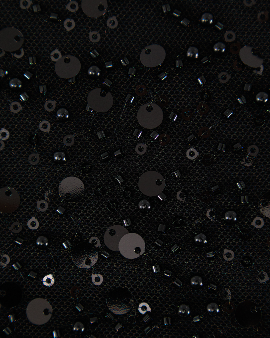Эта блуза – воплощение гламура и утонченной роскоши. Изготовленная из полупрозрачной ткани с вышивкой из пайеток, она эффектно играет светом, создавая чарующее мерцание. Глубокий черный оттенок добавляет загадочности и делает модель идеальной для вечернего выхода. Округлый вырез и слегка укороченный крой придают образу стильную легкость и современность. Рукава короткой длины обеспечивают комфорт и демонстрируют внимание к деталям, а аккуратная окантовка по краю добавляет завершённости общему виду. Изысканная отделка пайетками создает сложную текстуру и придает изделию праздничность, делая его центром внимания любого образа. Эта блуза идеально сочетается с узкими брюками или юбкой-карандаш, позволяя создать гармоничный и выразительный образ. Она будет отличным выбором для особых мероприятий или стильных вечеринок, подчеркивая вашу индивидуальность и утончённый вкус.