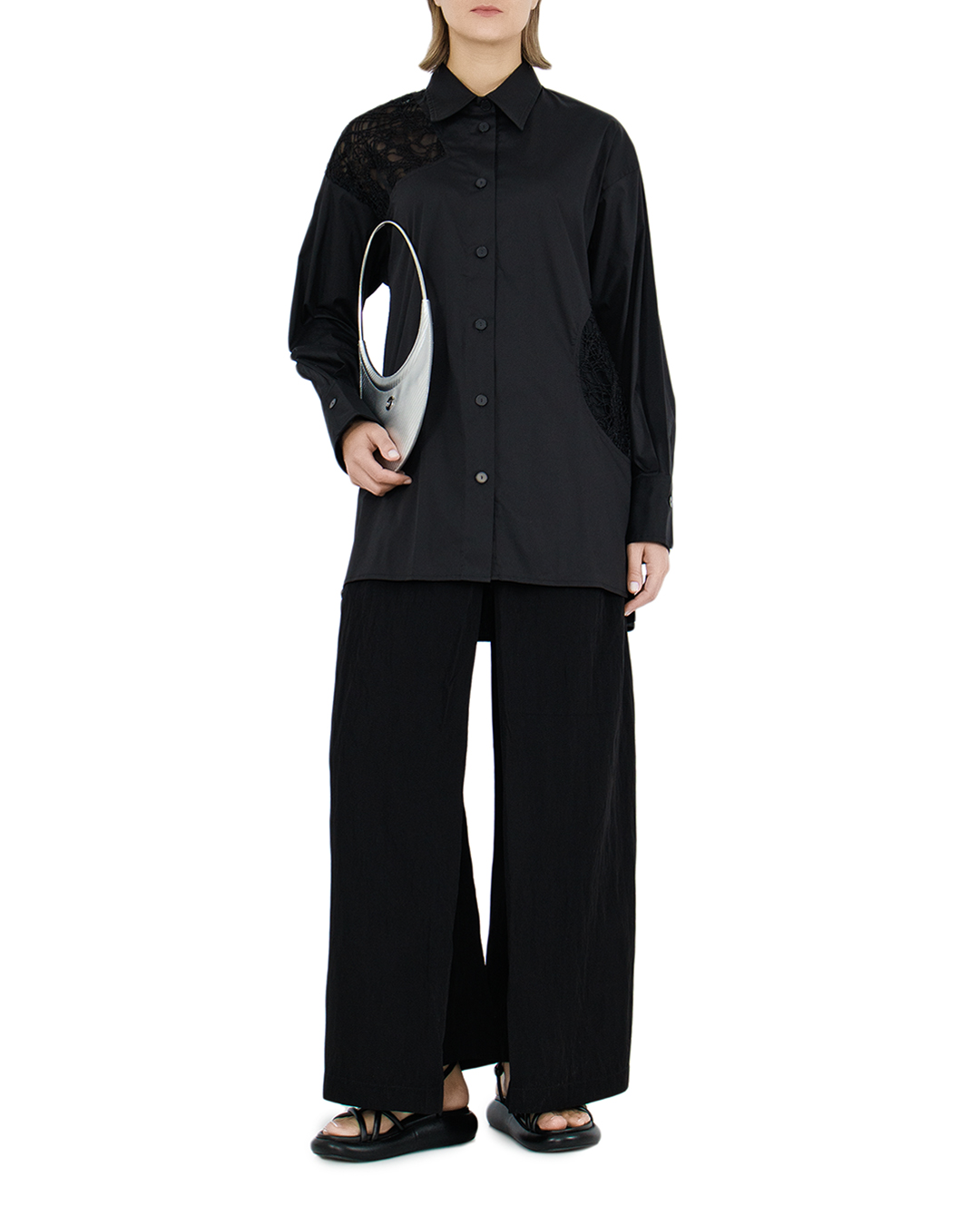 Блуза Malloni — это настоящее произведение искусства, в котором сочетается классическая элегантность и современный креатив. Глубокий черный цвет создает драматический фон, который усиливает восприятие уникальных деталей. Изюминкой этой блузы является асимметричная кружевная вставка на плече, добавляющая женственности и изысканности. Этот деликатный элемент создает интригующий контраст с чистотой линий ткани. Классический отложной воротник и аккуратная застежка на пуговицы делают образ структурированным и утонченным. Свободные манжеты придают модели современный силуэт, обеспечивая комфорт и свободу движений. Эта блуза идеально подходит как для офисных ансамблей, так и для вечерних выходов, добавляя в ваш гардероб нотки артистизма и изысканности.
