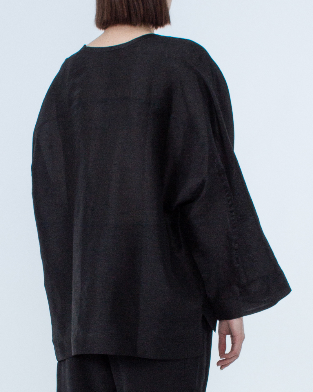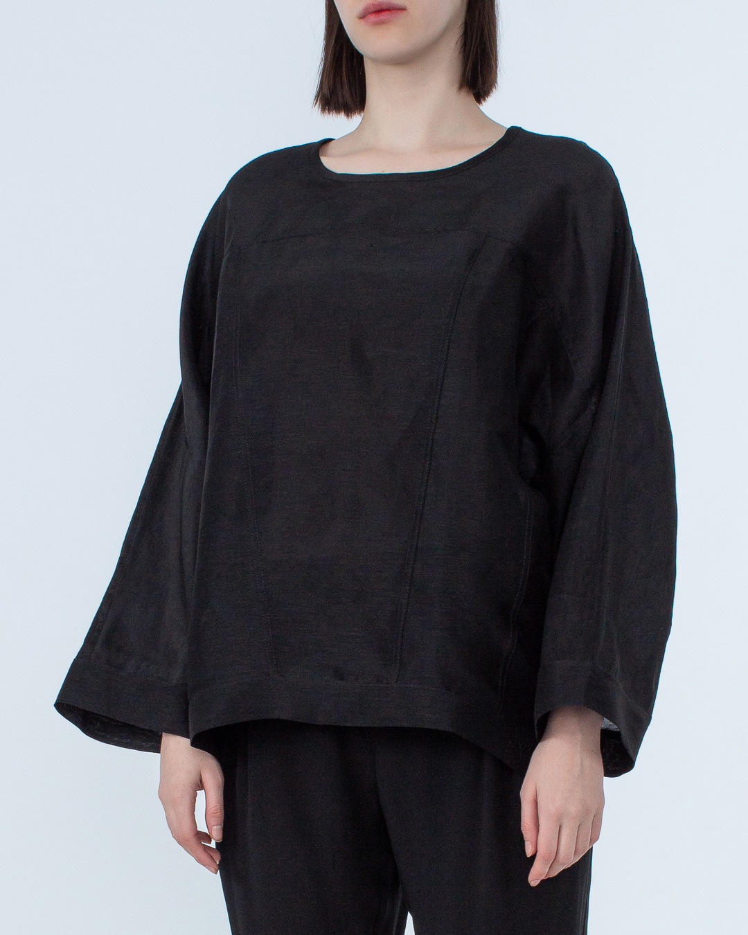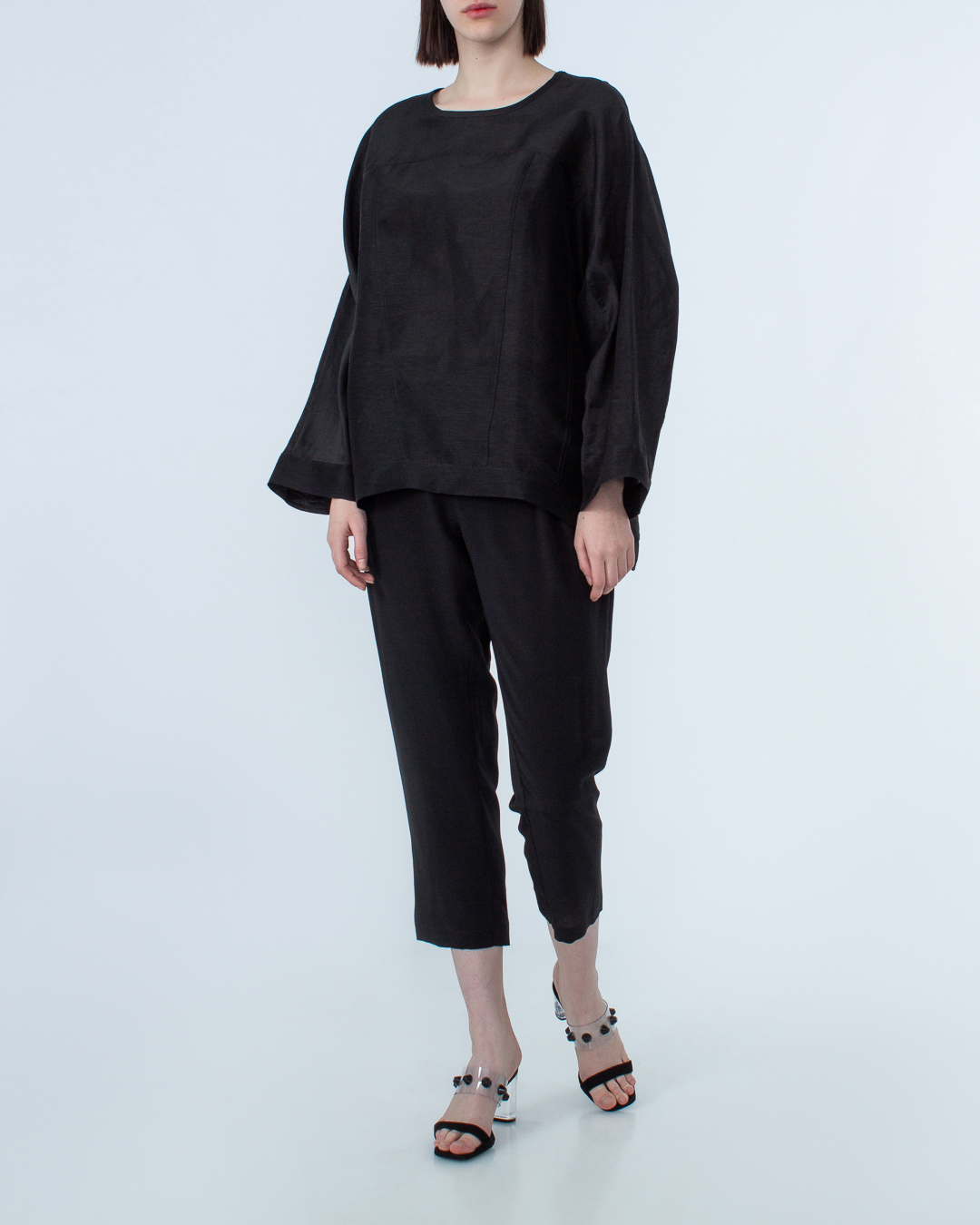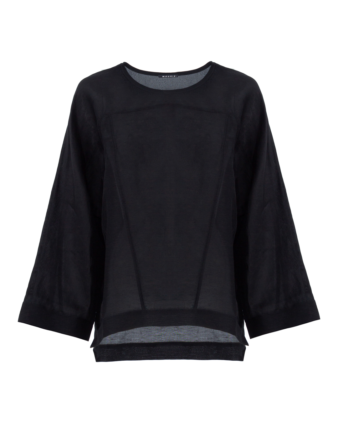 Блуза MAURIZIO сшита из шелка с добавлением льна черного цвета. Модель прямого свободного силуэта с широкими и объемными рукавами.