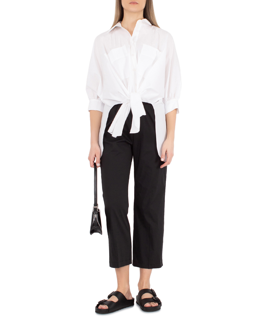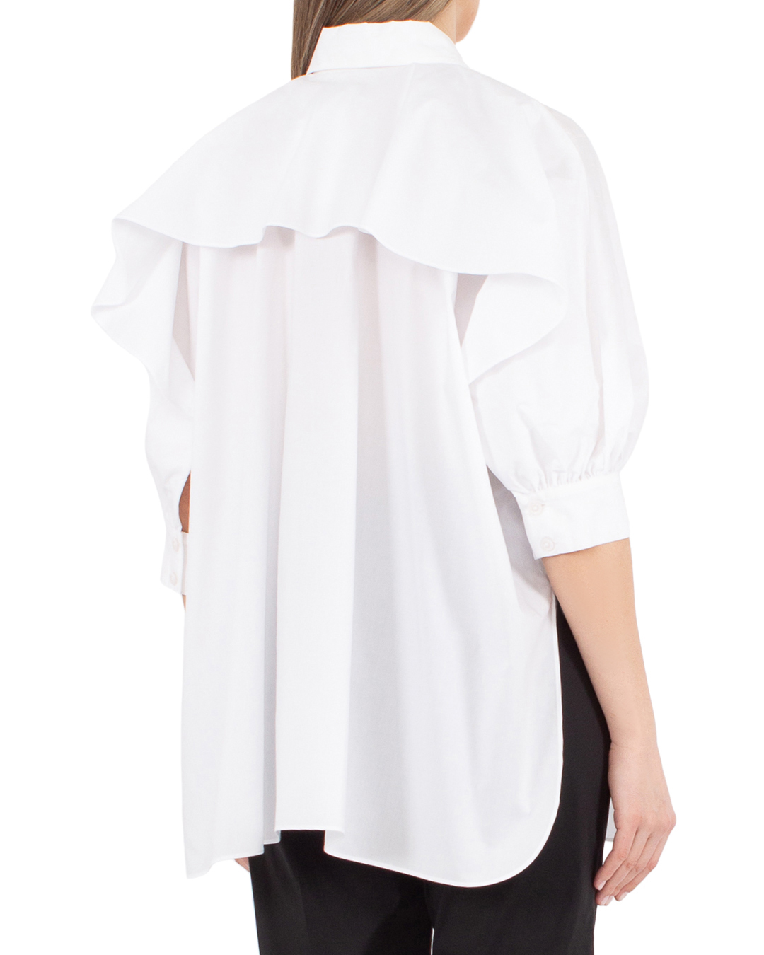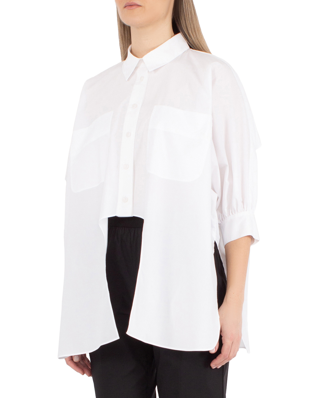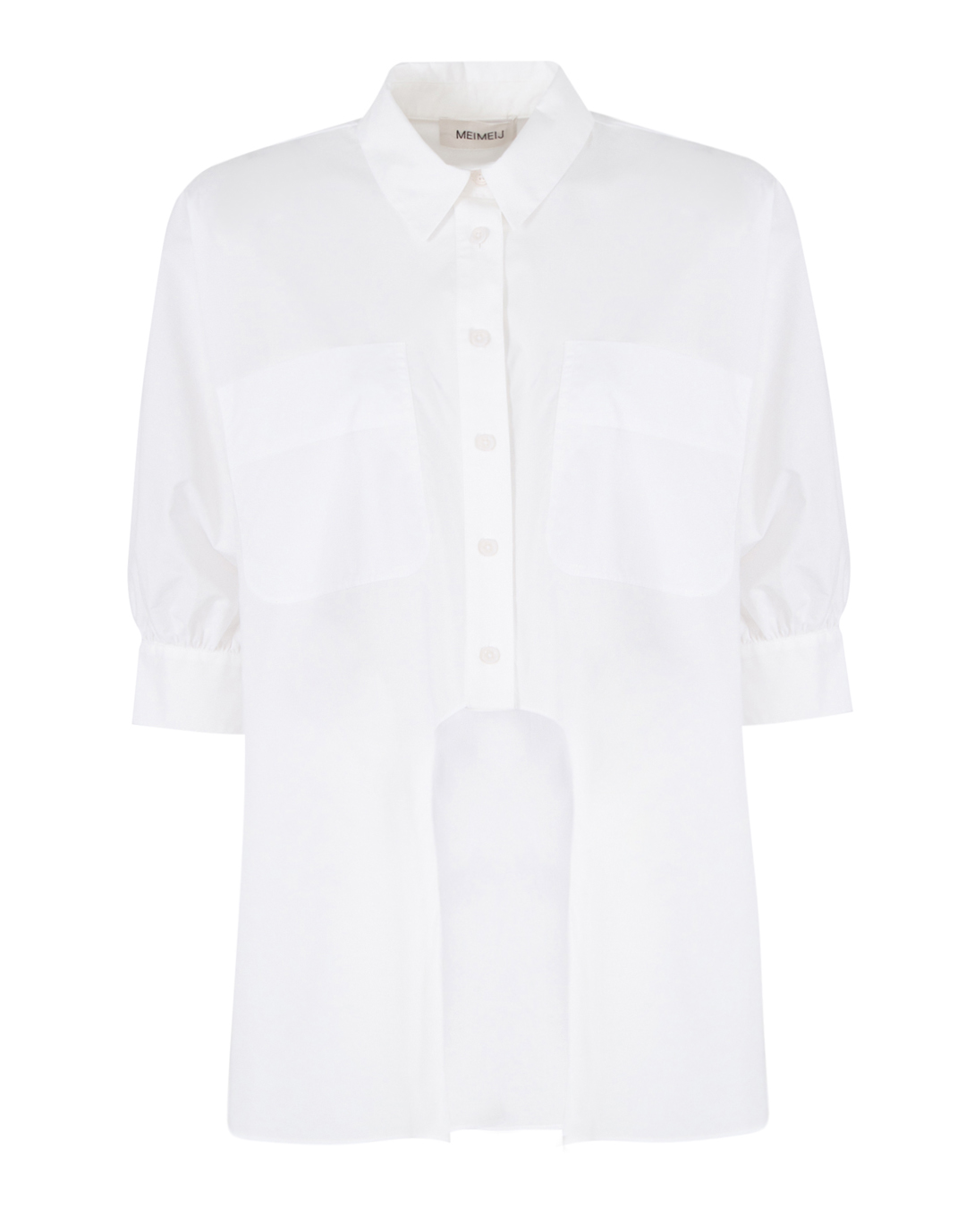 Рубашка MEIMEIJ сшита из хлопка белого цвета. Модель прямого свободного силуэта с застежкой на пуговицы и удлиненной линией спины.