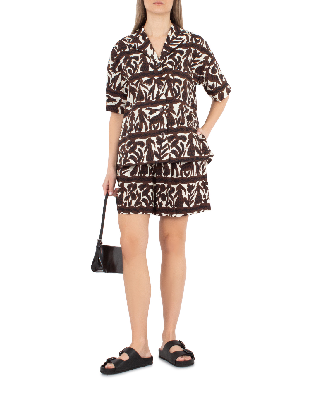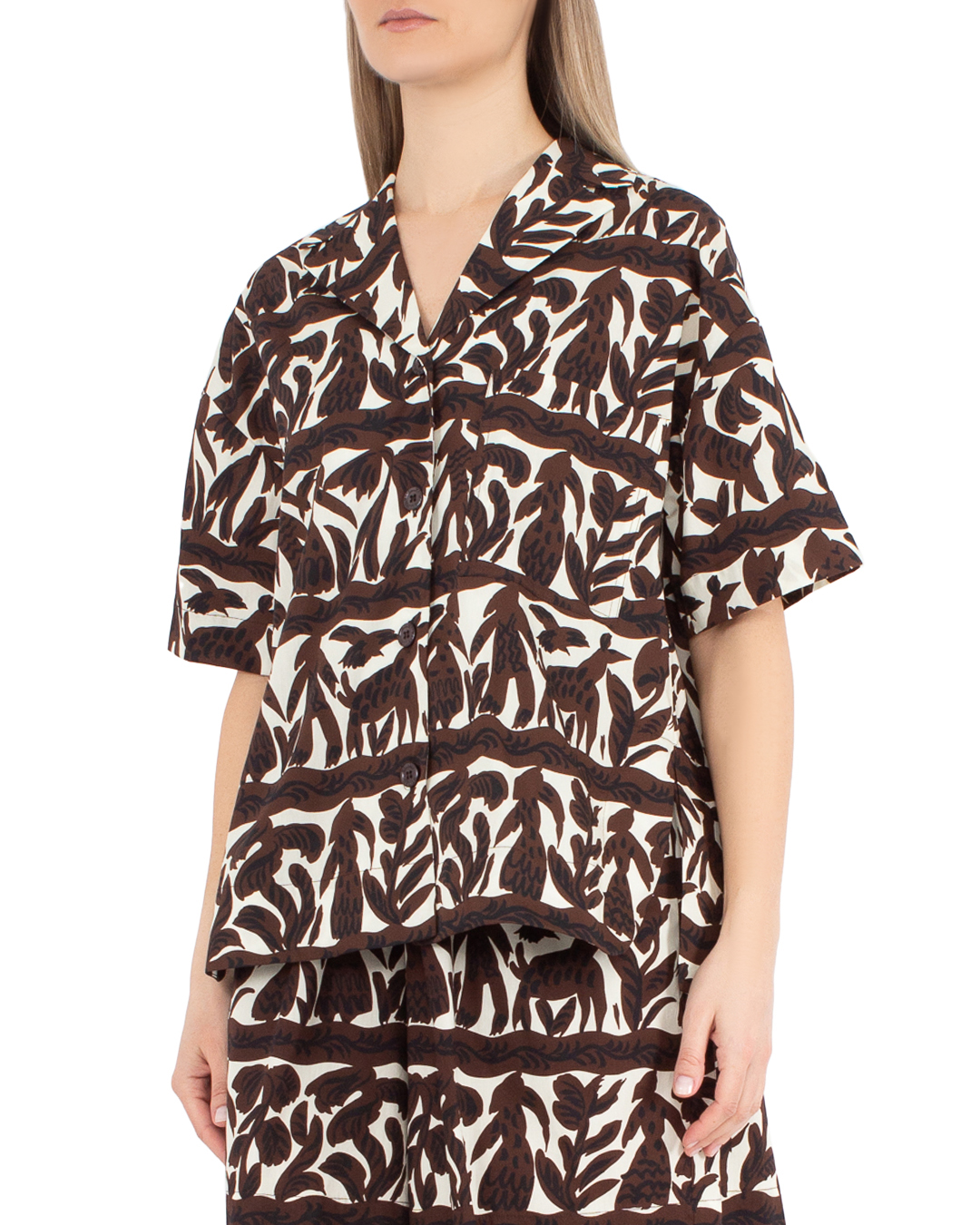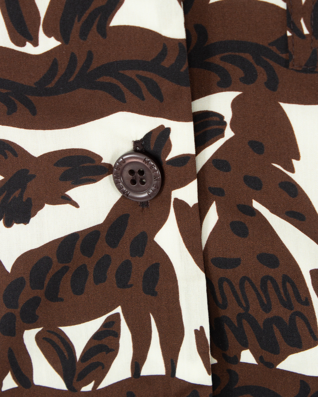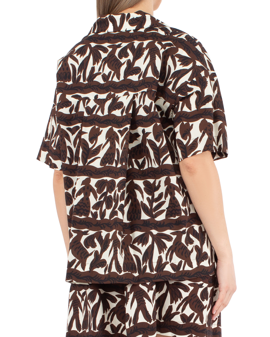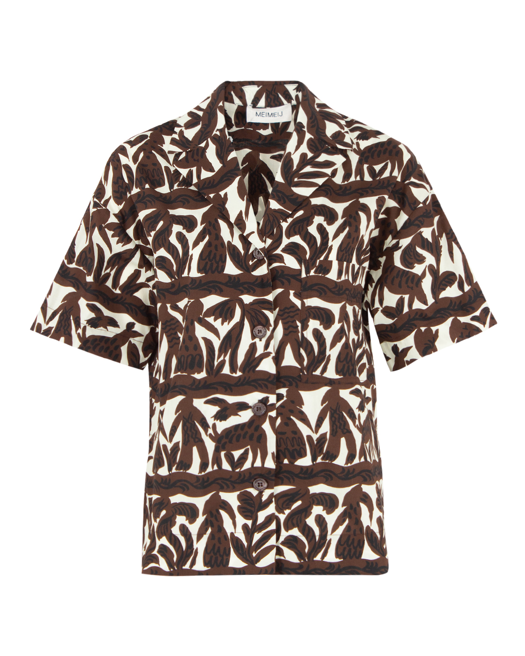 Рубашка MEIMEIJ сшита из хлопка с принтом. Модель прямого силуэта с застежкой на пуговицы и отложным воротником дополнена складками на спине.