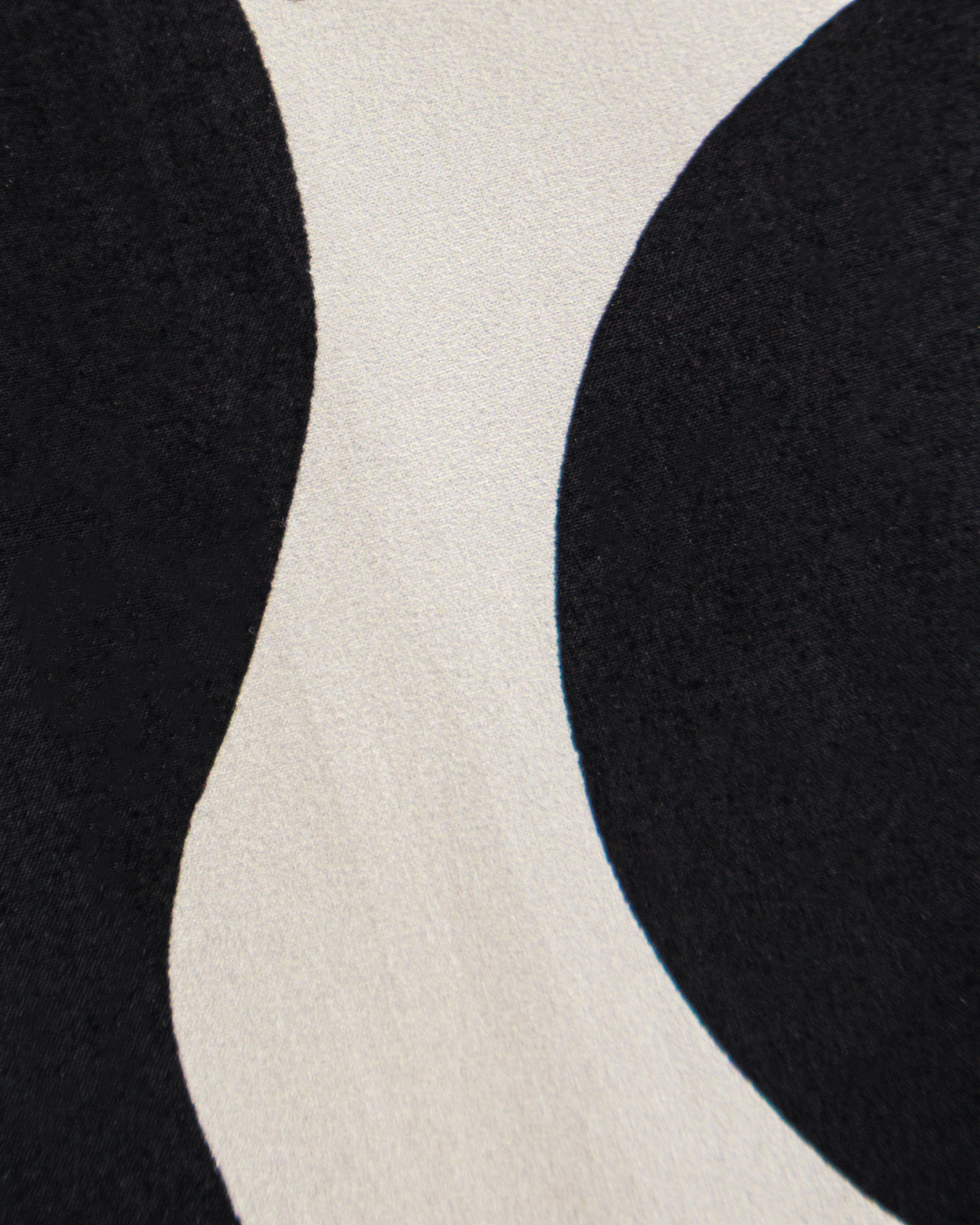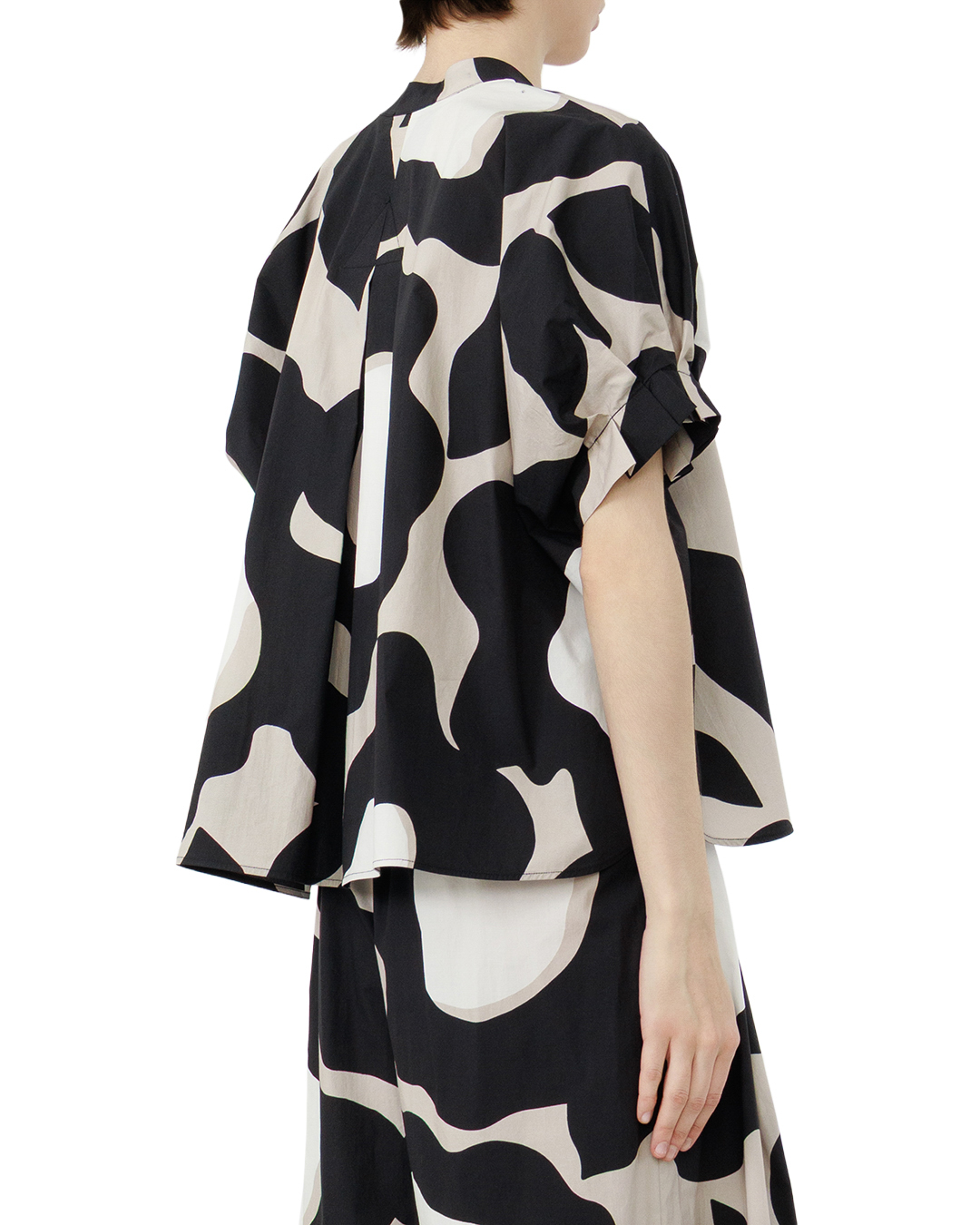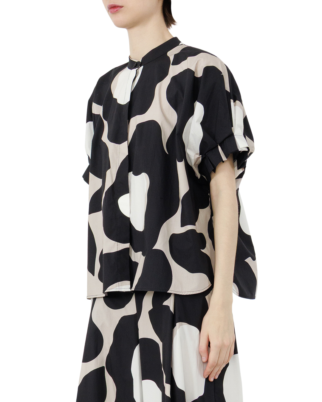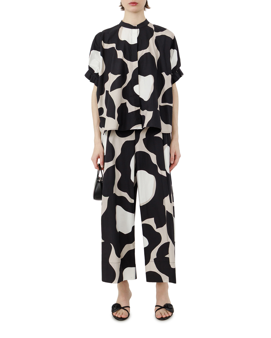 Эта блуза — воплощение современной графичности. Контрастный чёрно-бежевый принт с абстрактными формами создаёт выразительный акцент, придавая модели динамику и индивидуальность. Свободный крой с лёгкой оверсайз-пропорцией обеспечивает комфорт, не утрачивая элегантности. Воротник-стойка с застёжкой на пуговицу добавляет строгости и структурирует верхнюю часть силуэта. Рукава средней длины с декоративными манжетами-оборками вносят нотку женственности, смягчая общий образ. Лаконичность кроя в сочетании с смелым принтом делает эту блузу стильным элементом для создания эффектных ансамблей.