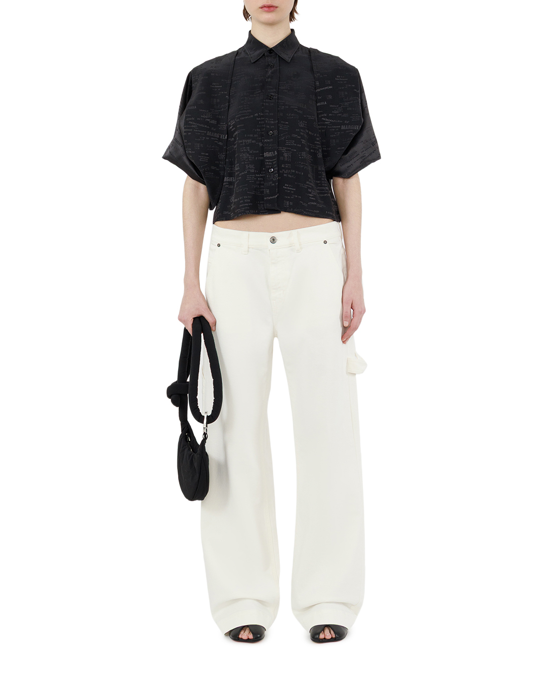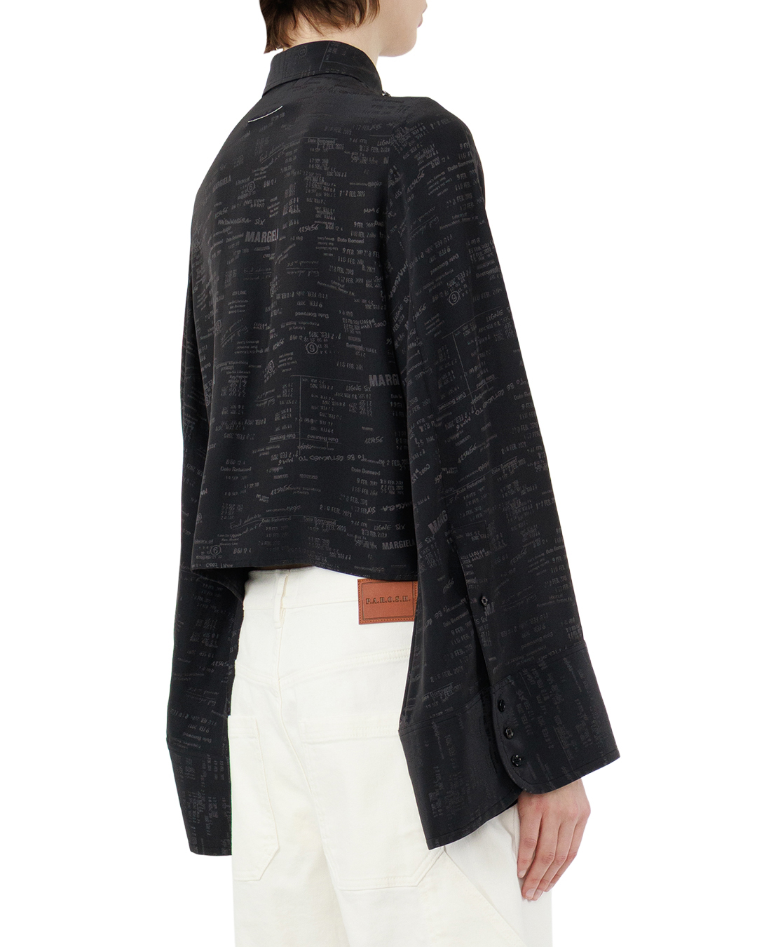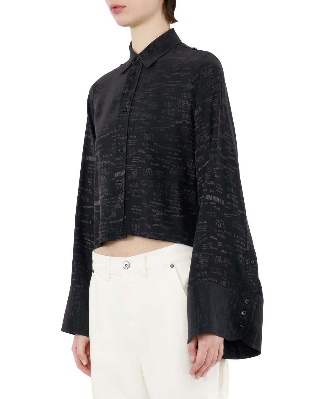 Эта элегантная блуза выполнена в стиле минимализм с акцентом на современный городской шик. Классический стойкий воротник с аккуратными лацканами плавно переходит в центральную планку с застежкой на мелкие глянцевые пуговицы, усиливая изящную строгость кроя. Длинные расширяющиеся к низу рукава свободного кроя создают эффект воздушности и легкости, а широкие манжеты с потайной застежкой на пуговицы придают изделию структурированность и продуманность деталей. Облегающий силуэт подчеркнут укороченной длиной, что добавляет современности и позволяет выгодно подчеркнуть талию. Интересным дизайнерским решением является едва заметный тонкий принт с фирменной текстурой — он насыщен стилизованными надписями и цифрами, которые добавляют изделию уникальный характер и визуальную глубину, не нарушая гармонии общего образа. Тщательная обработка швов и аккуратная отделка делают эту блузу универсальным элементом гардероба для создания образов в деловом или кэжуал стиле.