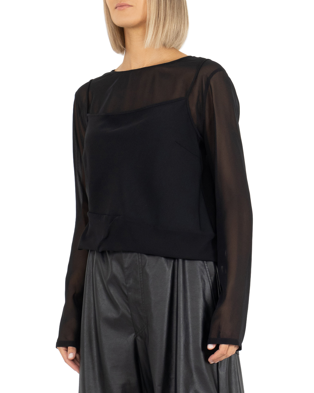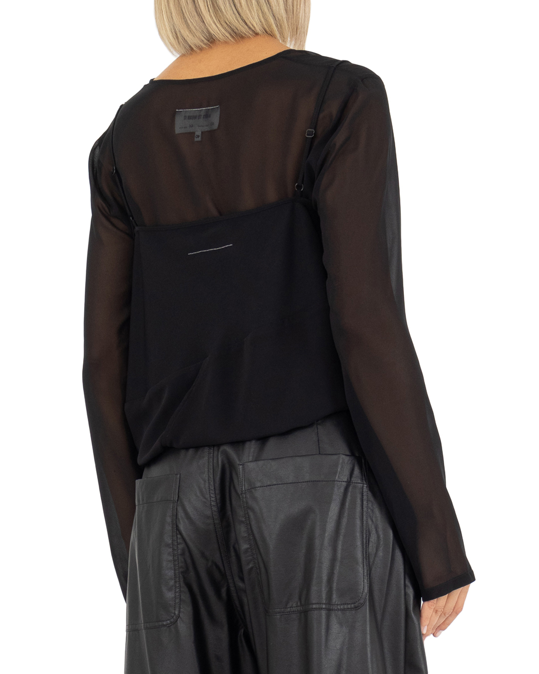 Блуза MM6 Maison Margiela из тонкого полупрозрачного крепа с нижним топом. Модель прямого силуэта с тонкими бретелями регулируемой длины.