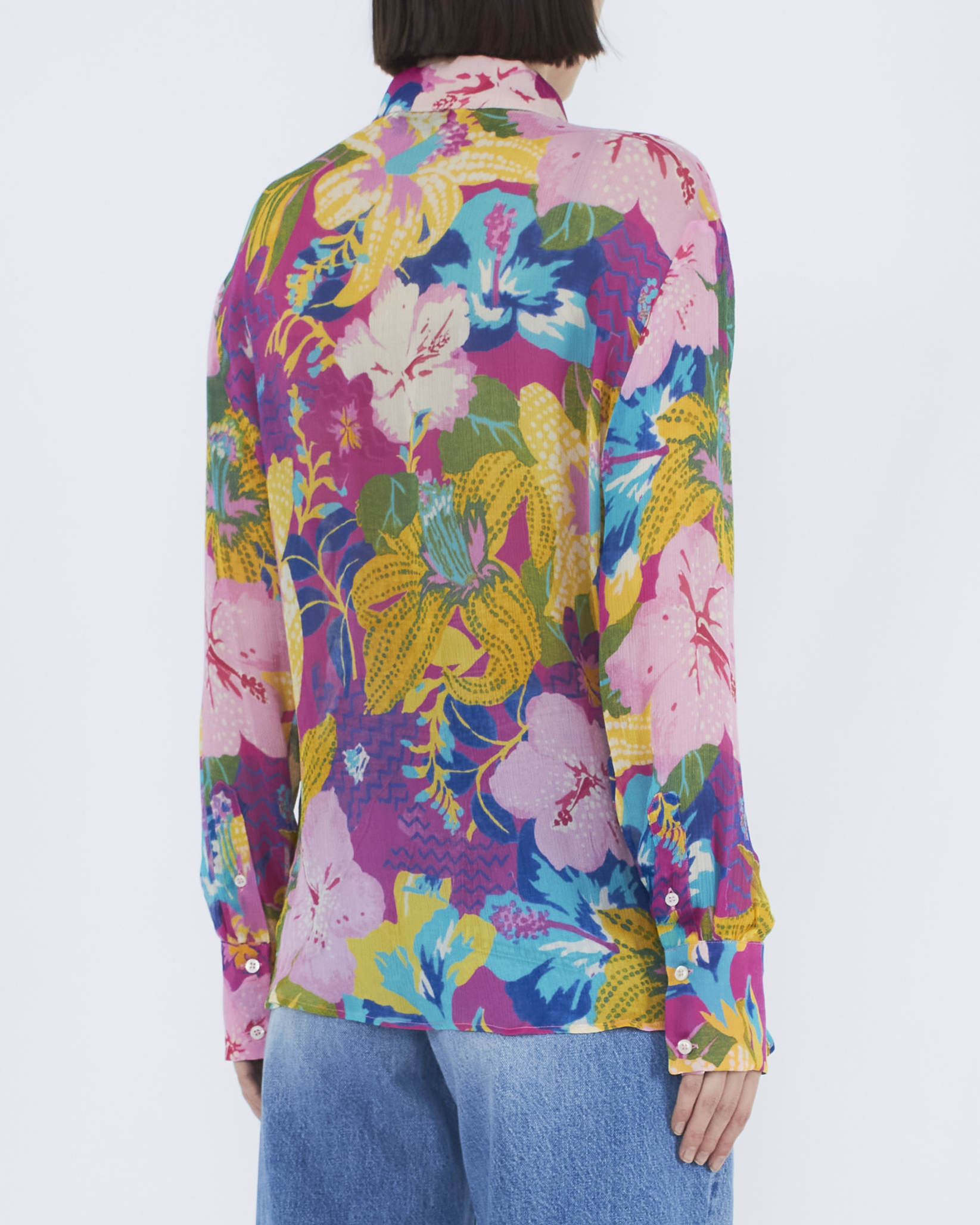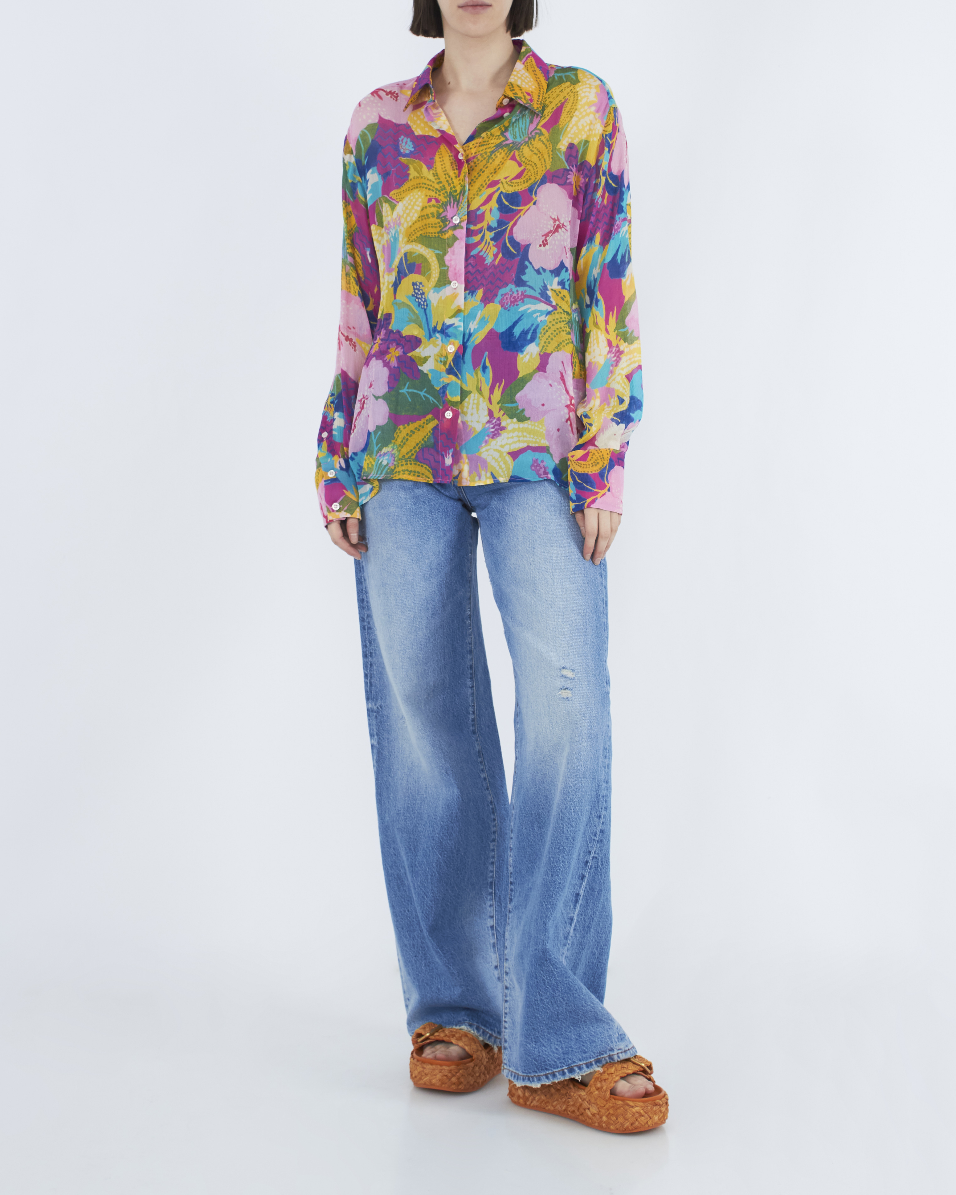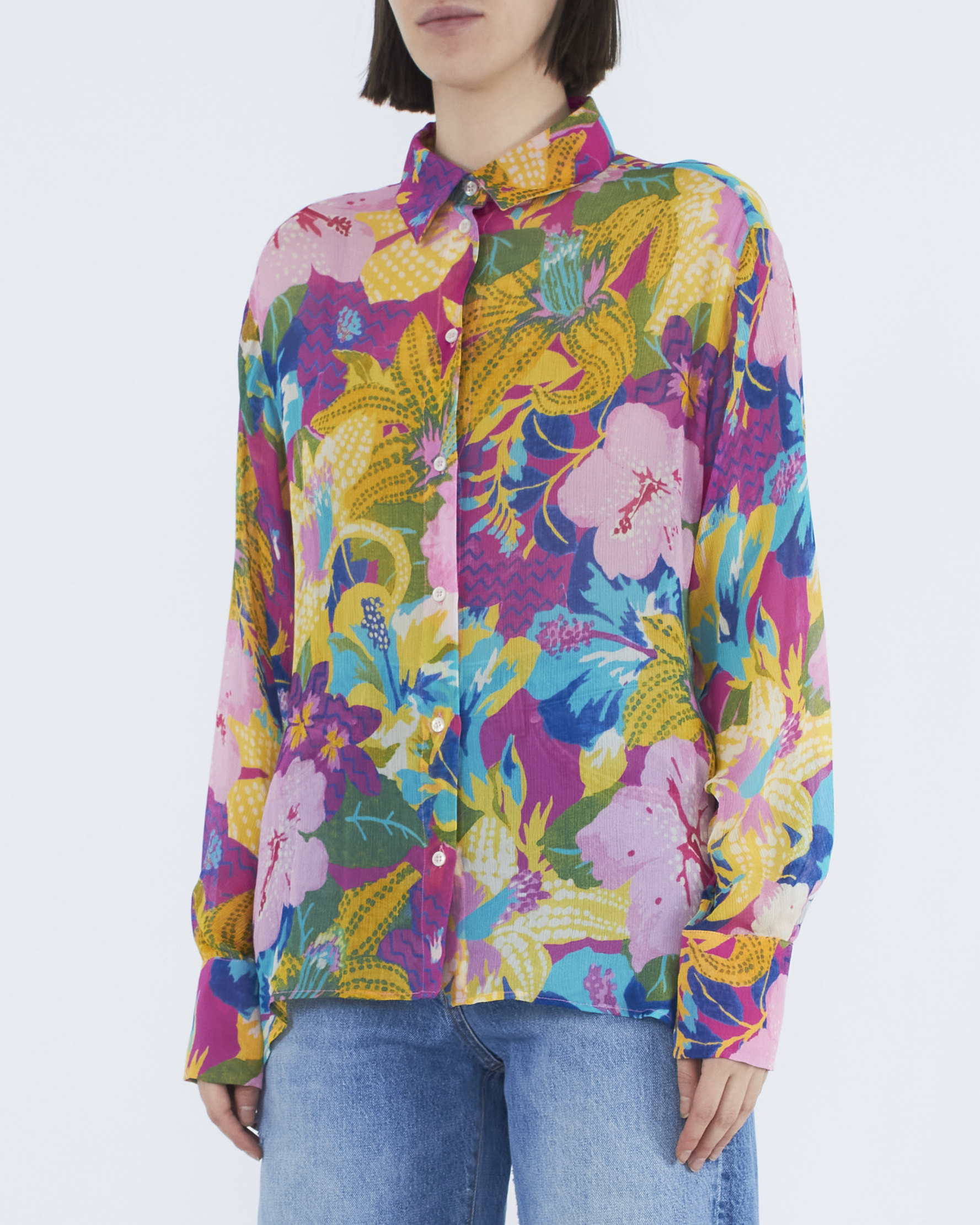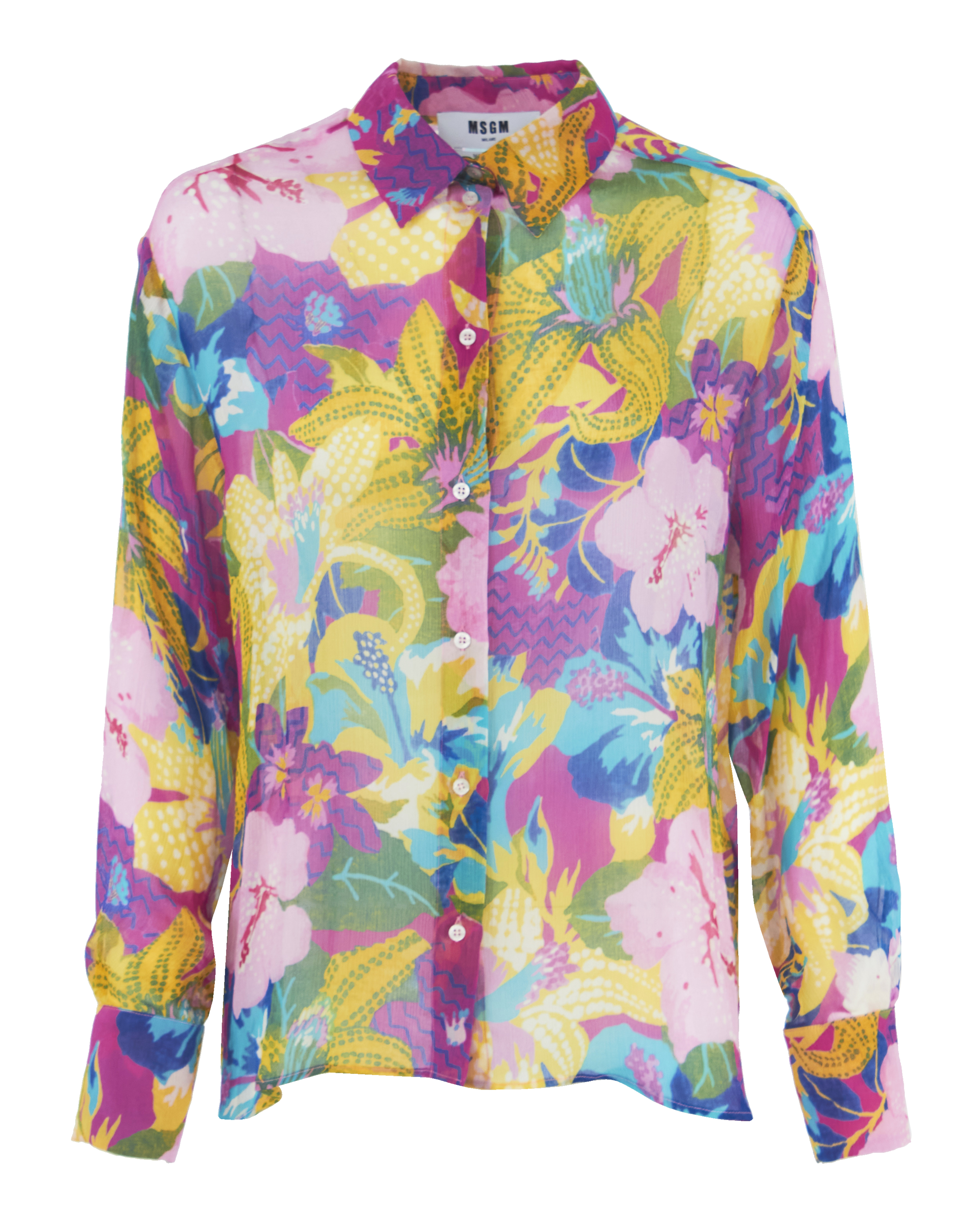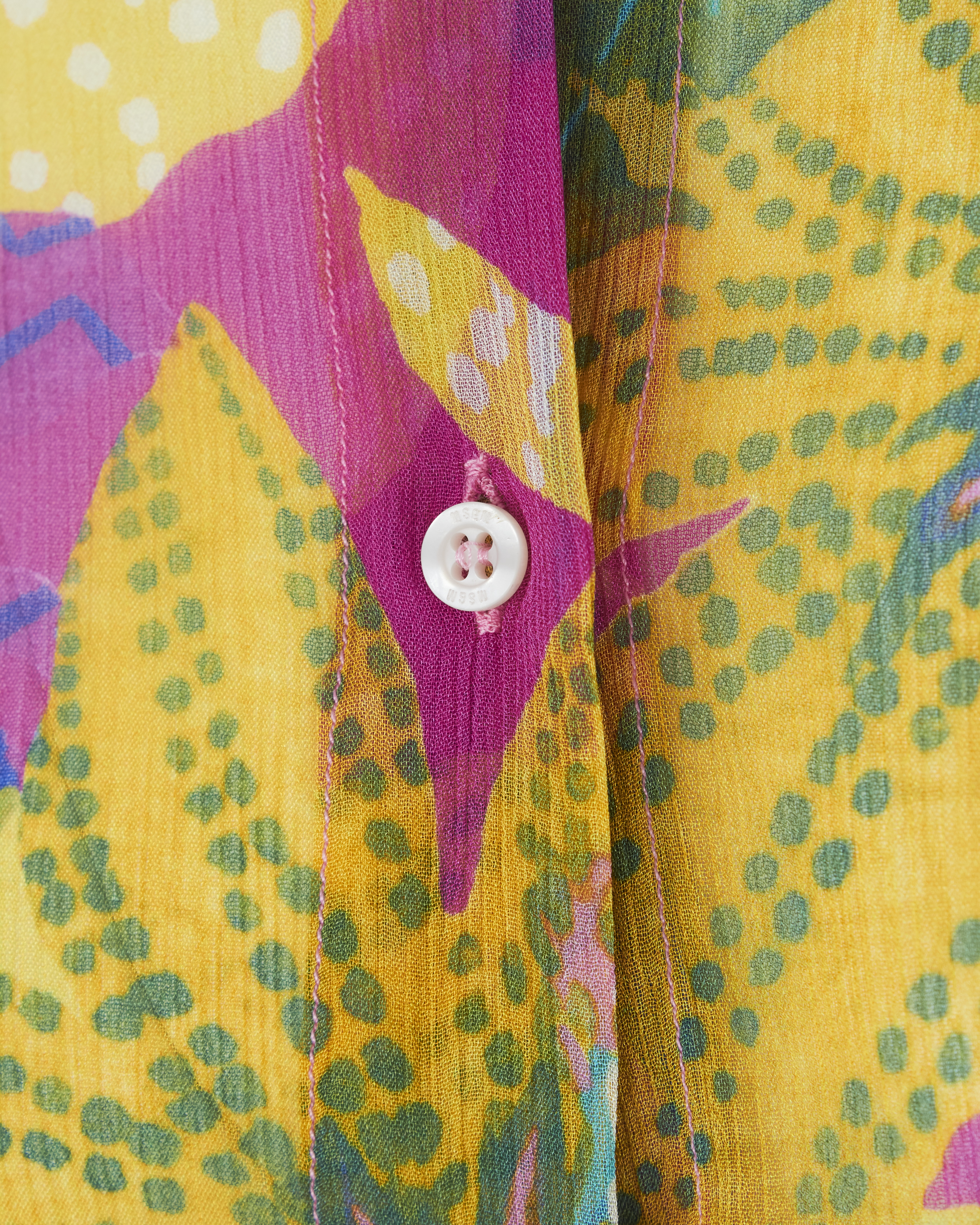 Принтованная блуза из тонкой вискозы. Модель прямого силуэта с застежкой на пуговицы дополнена длинными рукавами.