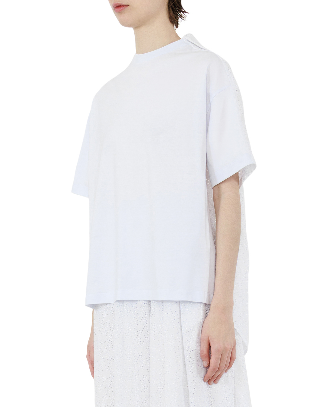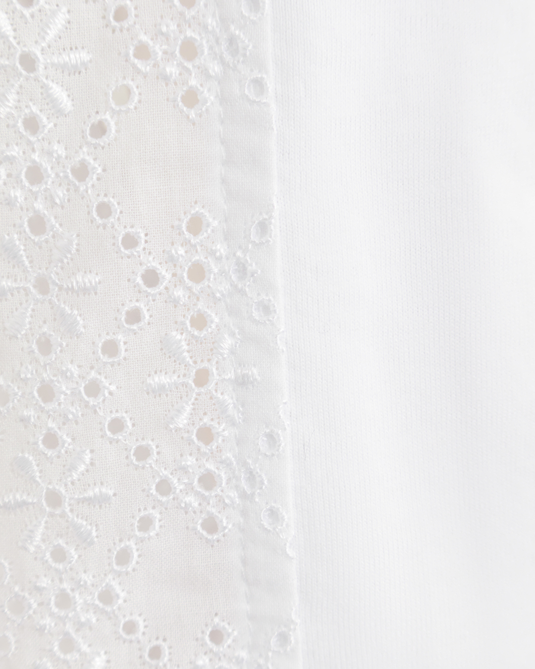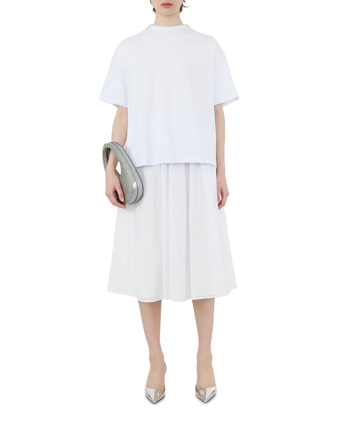 Эта белоснежная блуза в стиле оверсайз — воплощение современной лаконичности и непринуждённой элегантности. Свободный крой мягко облегает фигуру, создавая ощущение лёгкости и комфорта, а слегка удлинённый силуэт придаёт образу утончённую расслабленность. Круглый вырез горловины оформлен с особой тщательностью: ровный, аккуратный край подчёркивает чистоту линий и не отвлекает внимание от общей гармонии модели. Короткие рукава с мягкими подворотами добавляют непринуждённости, а их длина идеально сбалансирована — не слишком укорочена, но и не утяжеляет образ. Особенность этой блузы — в безупречной проработке швов: аккуратная отстрочка по низу изделия и рукавам выполнена в тон полотна, что создаёт эффект цельного, бесшовного кроя. Лёгкая асимметрия в посадке придаёт модели современный характер, делая её не просто базовой вещью, а выразительным элементом гардероба. Чистый белый цвет работает как идеальный холст, позволяя блузе стать центральным акцентом любого образа — от минималистичного до многослойного. Эта вещь не просто дополняет лук, а задаёт ему настроение: сочетает в себе простоту, функциональность и изысканный вкус, оставаясь при этом абсолютно универсальной.