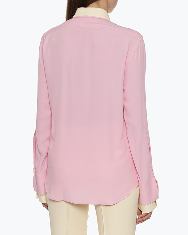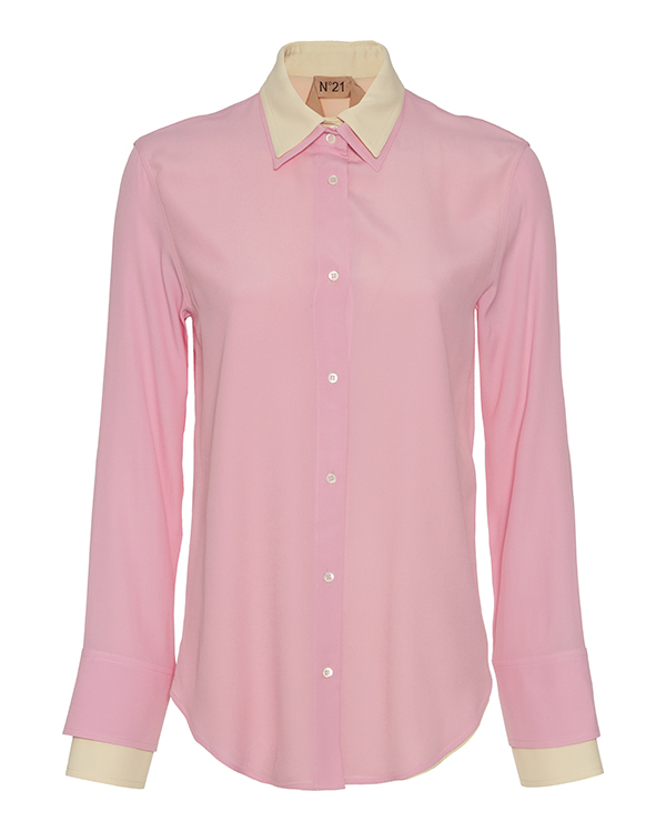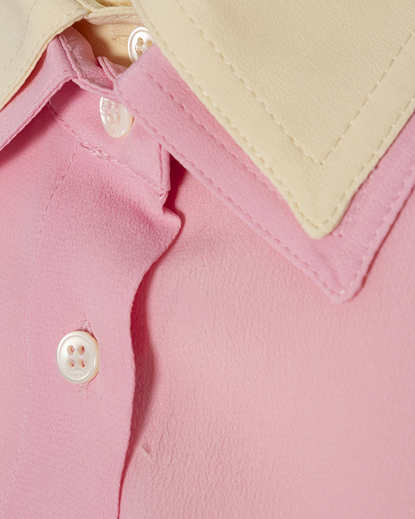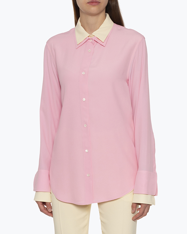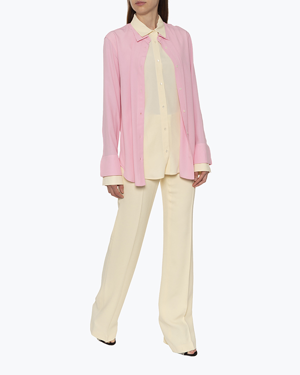 Блуза из тонкого материала с добавлением шелка розового и бежевого оттенков. Модель прямого расслабленного кроя удлиненного силуэта выполнен с двойным дизайном и застежкой на пуговицы.