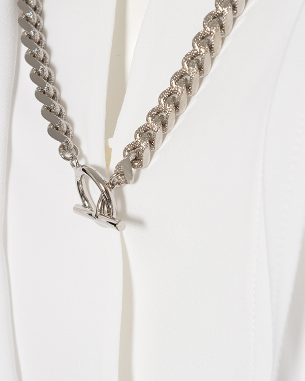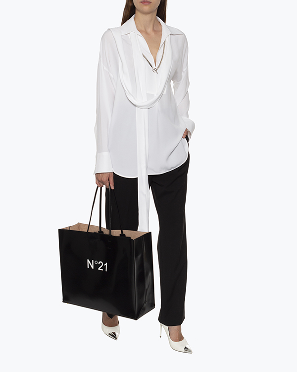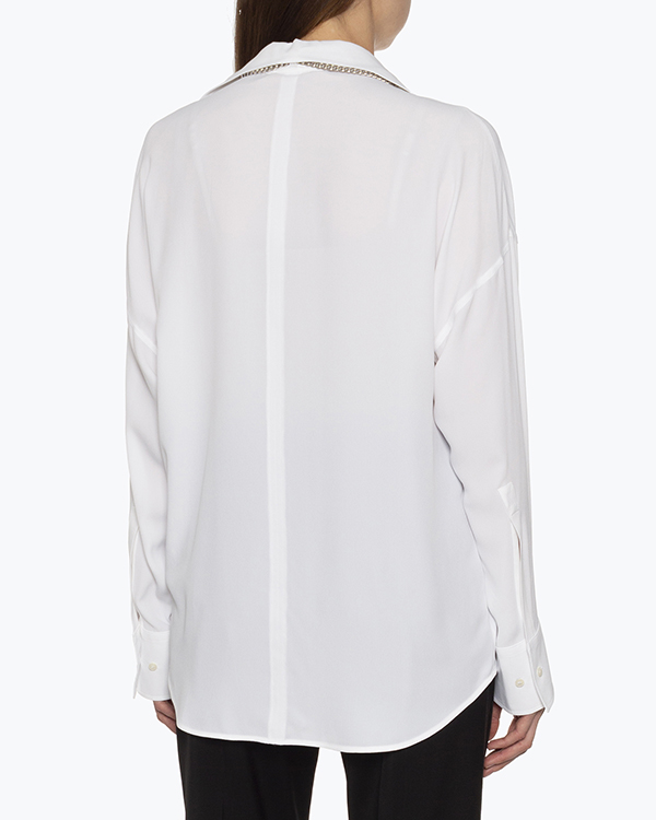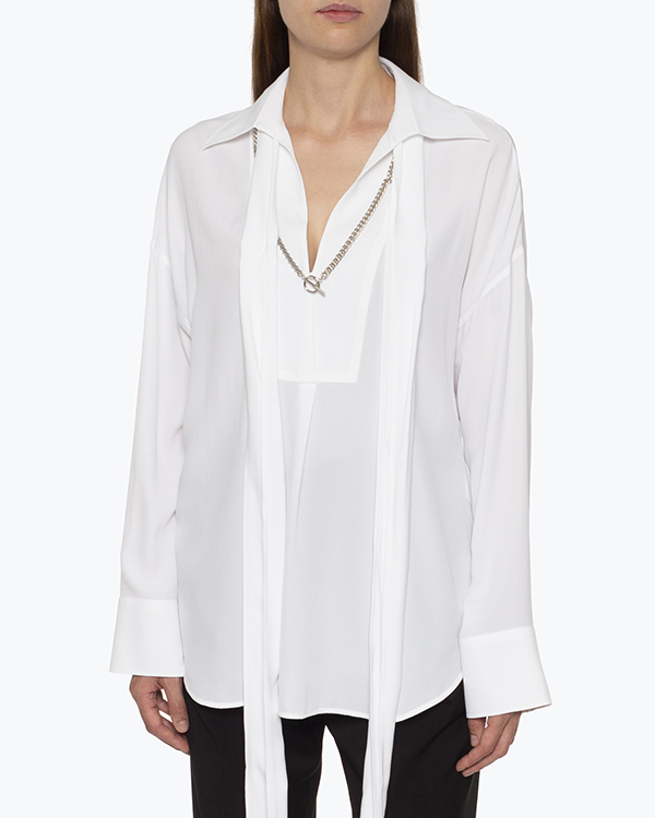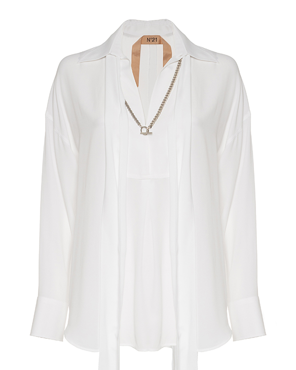 Блуза из тонкого материала с добавлением шелка белого цвета. Модель прямого расслабленного кроя удлиненного силуэта дополнена длинными завязками из основного материала и украшением в виде металлической цепочки. Блуза со спущенной линией плеч и широкими рукавами, отложной воротник и закругленная линия низа.