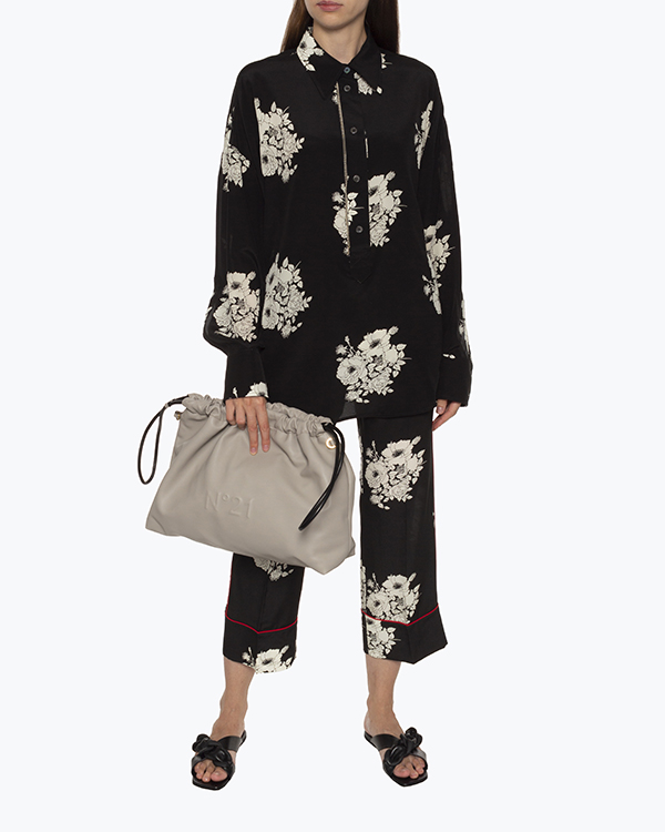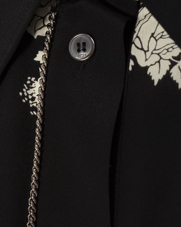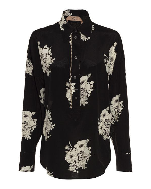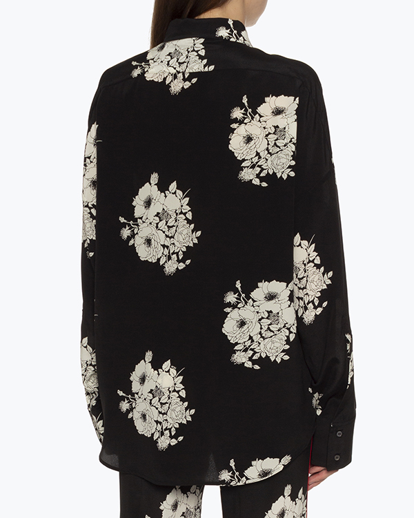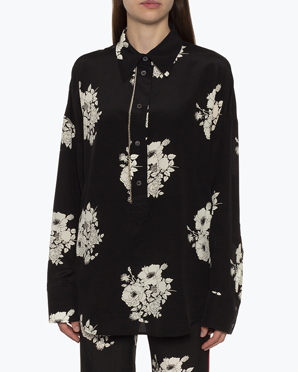 Блуза из тонкого материала с добавлением шелка черного цвета с цветочным принтом. Модель прямого расслабленного кроя удлиненного силуэта. Блуза со спущенной линией плеч и широкими рукавами, отложной воротник и закругленная линия низа.