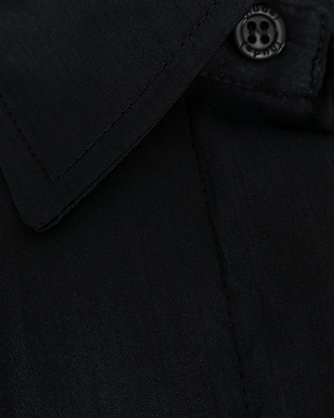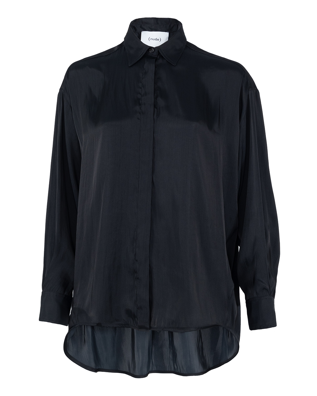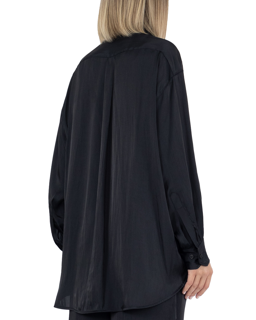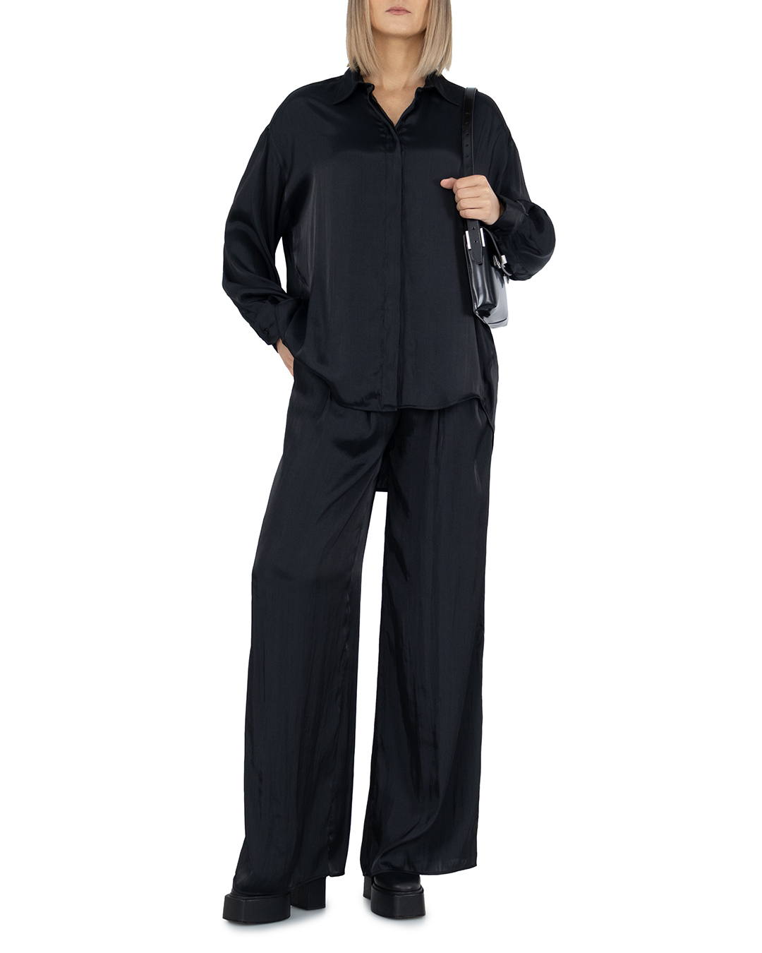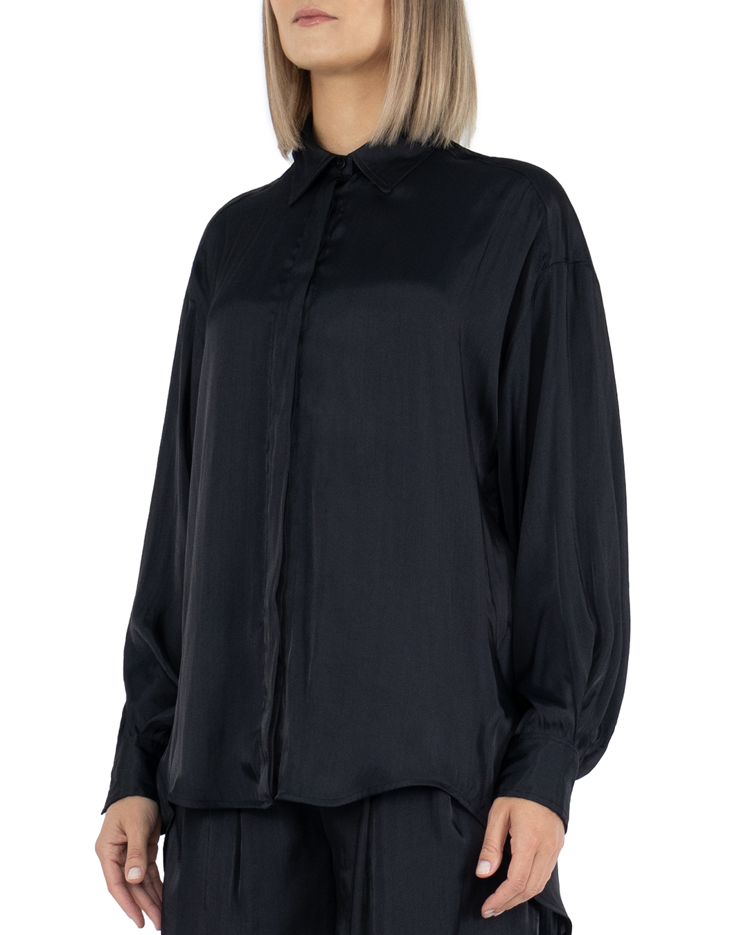 Струящаяся блуза свободного кроя со спущенной линией плеч благородно струится и переливается, особенно на контрасте других более плотных фактур. Детали: отложной воротник, рукава с широкими манжетами, застежка скрытые пуговицы, закругленная и удлинена линия низа
