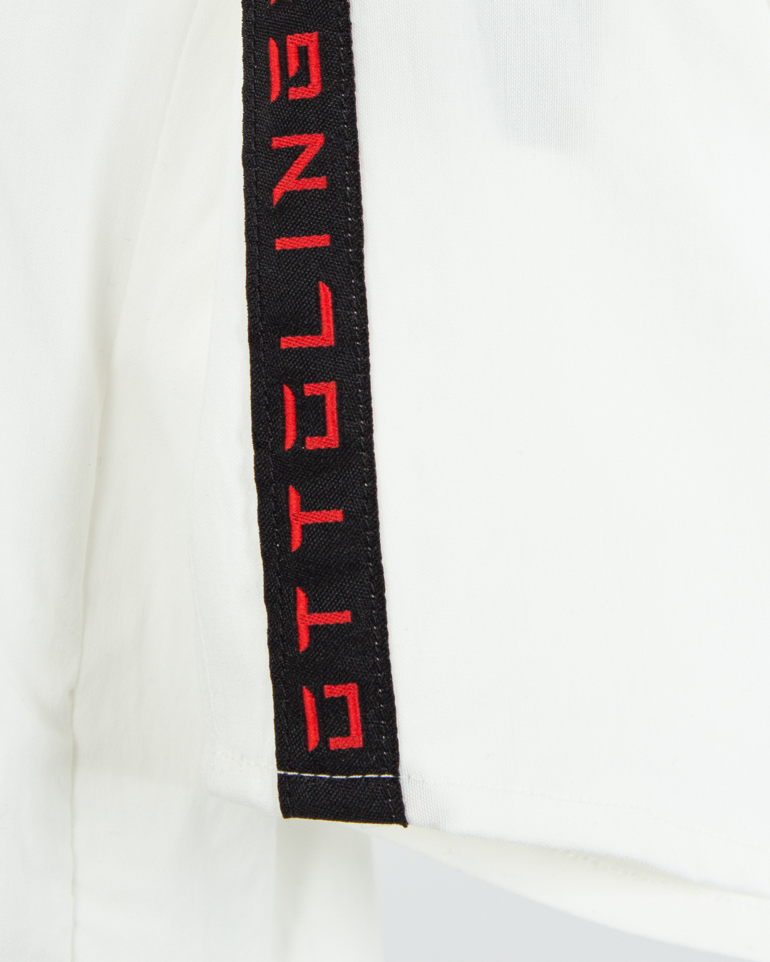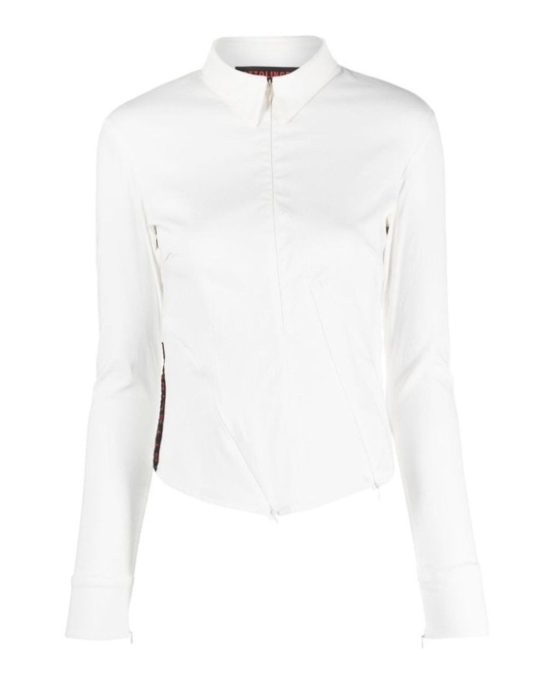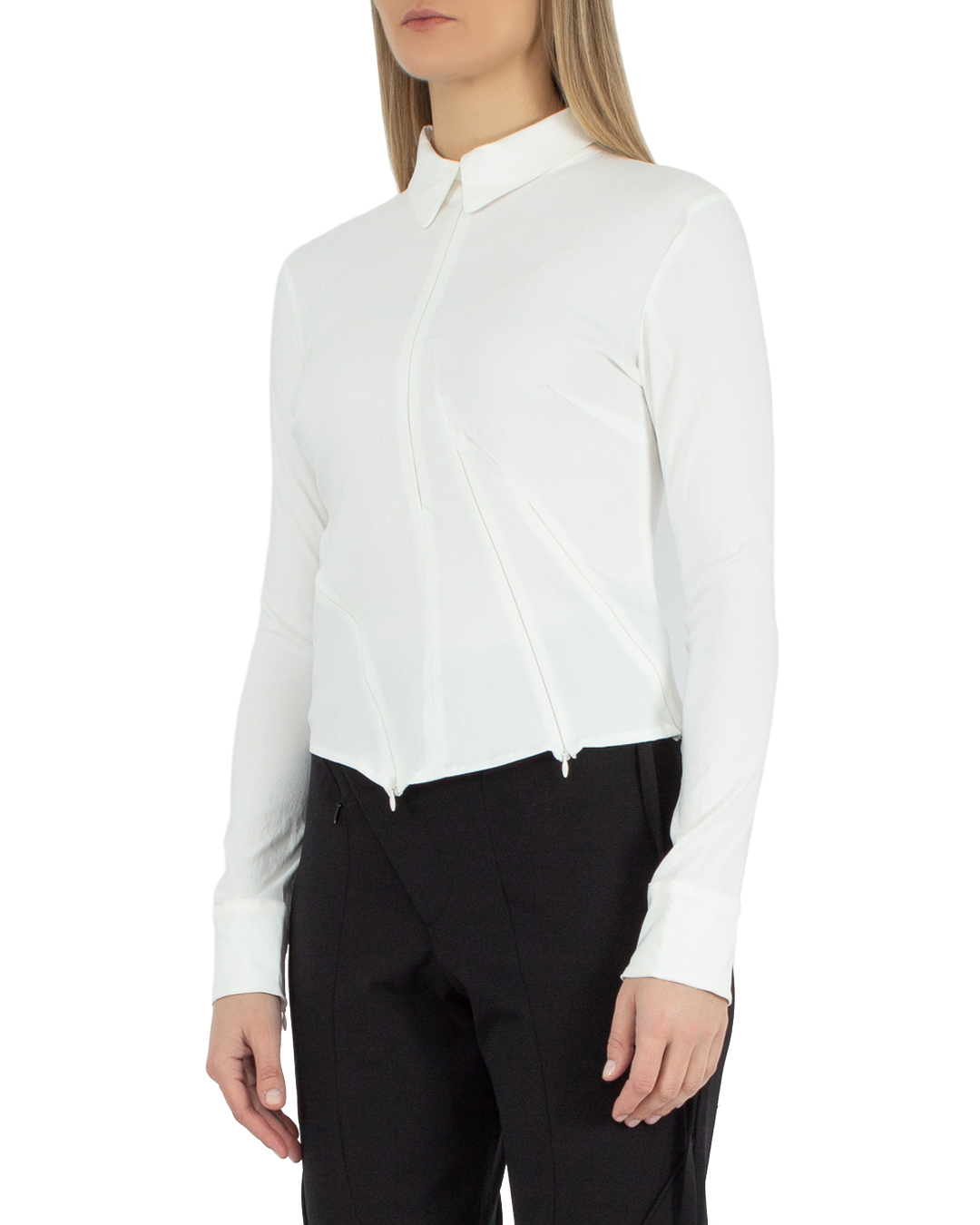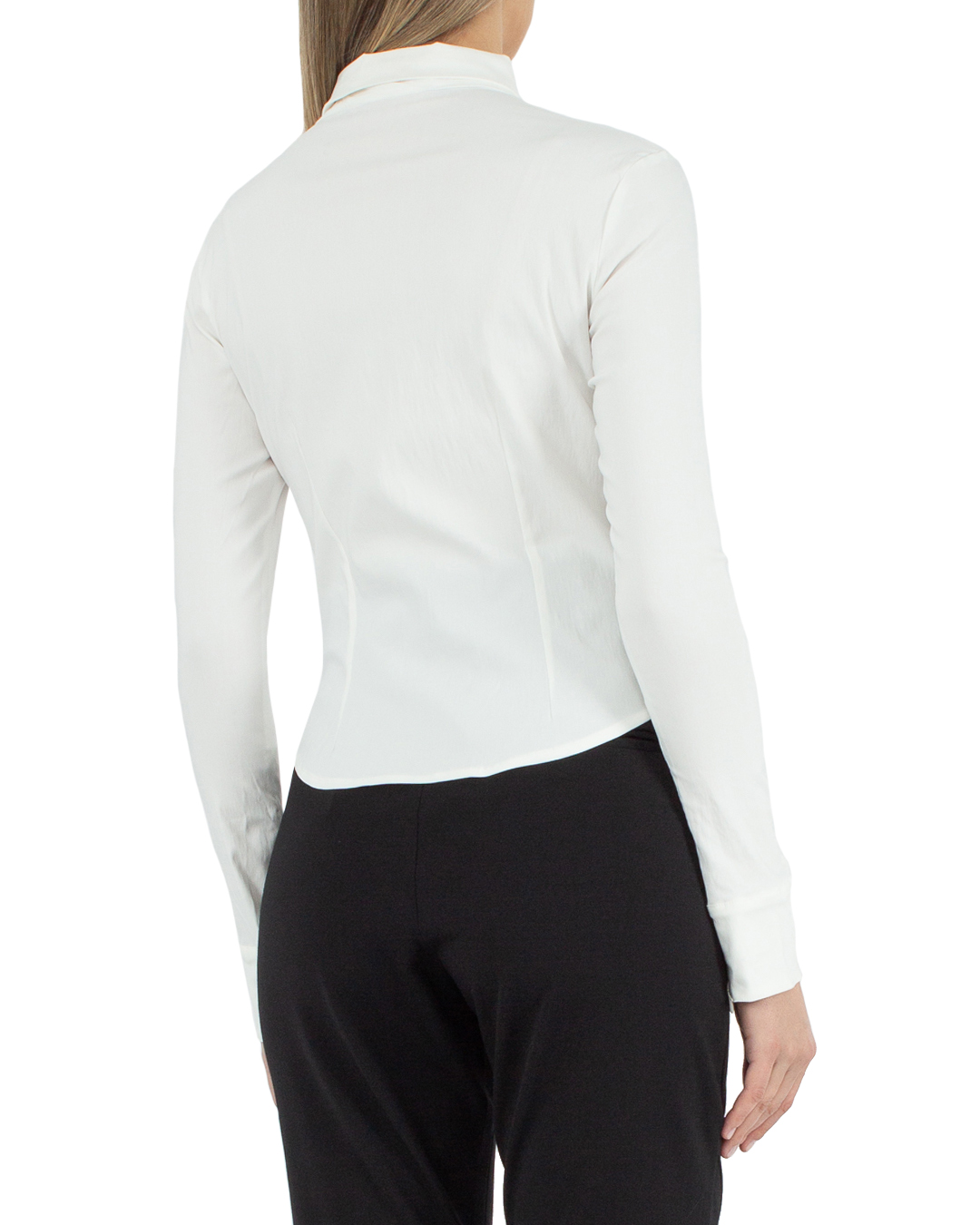 Блуза OTTOLINGER сшита из вискозы молочного оттенка. Модель облегающего укороченного силуэта с застежкой на потайные молнии дополнена отложным воротником и длинными рукавами.
