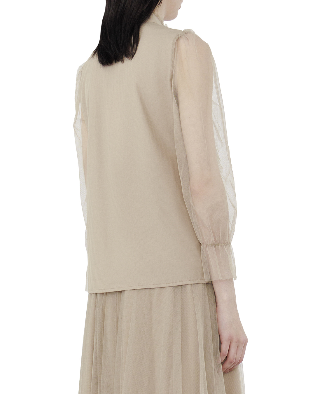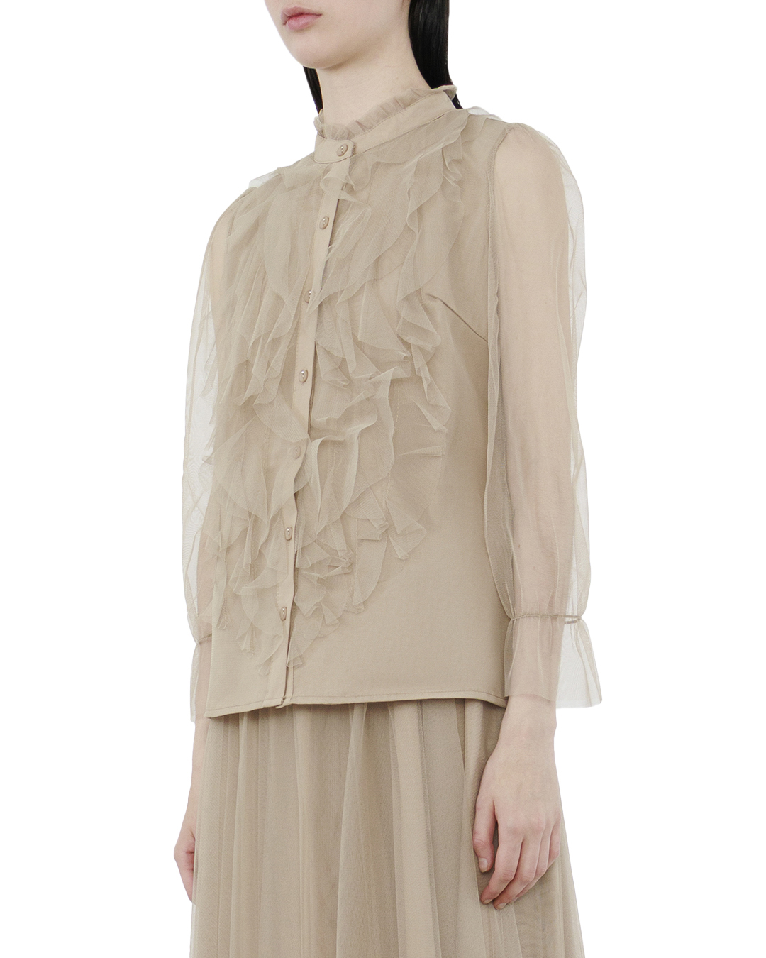 Эта блуза — воплощение нежности и воздушной романтики. Выполненная из полупрозрачного, легкого материала, она создает очаровательный и женственный образ, придающий элегантность и утонченность. Множественные каскадные воланы на передней части изделия добавляют объем и текстурность, создавая динамичный и изысканный эффект. Эти декоративные элементы делают блузу изящной и привлекающей внимание. Высокий воротник-стойка с деликатной оборкой подчеркивает линию шеи и добавляет аристократическую нотку. Аккуратная застежка на нежные пуговицы поддерживает целостность дизайна и элегантно завершает образ. Длинные рукава из прозрачной ткани с изящными манжетами усиливают впечатление легкости и невесомости, идеально сочетаясь с основным дизайном блузы. Эта блуза станет идеальным выбором для создания утонченного и изысканного образа, легко комбинируясь как с классическими брюками, так и с юбками, подчеркивая ваш неповторимый стиль и грациозность.
