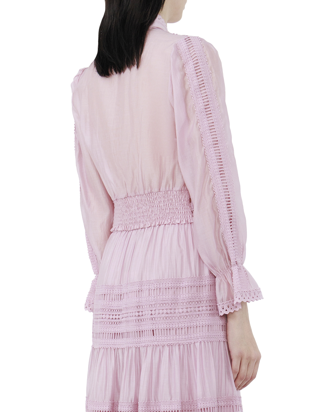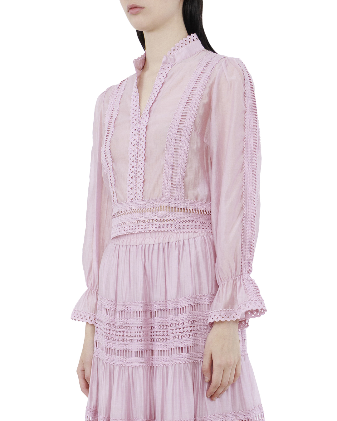 Эта блуза — воплощение изящной утонченности и элегантности, идеально подходящей для создания утонченного образа. Выполненная из прозрачного розового материала, она создает эффект загадочности и легкости. Деликатные кружевные вставки вдоль изделия и на манжетах подчёркивают женственность и добавляют нотку романтики. Элегантный V-образный вырез придаёт блузе изысканность и визуально удлиняет силуэт. Акцентный воротник и манжеты украшены геометрическим узором, что добавляет стильные детали и завершает образ с современным акцентом. Длинные рукава с собранными манжетами создают объем и лёгкость. Короткий крой делает эту блузу идеальной для сочетания с высокими юбками или брюками, добавляя чувственности и игривости всему ансамблю. Эта блуза — идеальный выбор для тех, кто ценит утонченный и стильный подход к своему гардеробу.