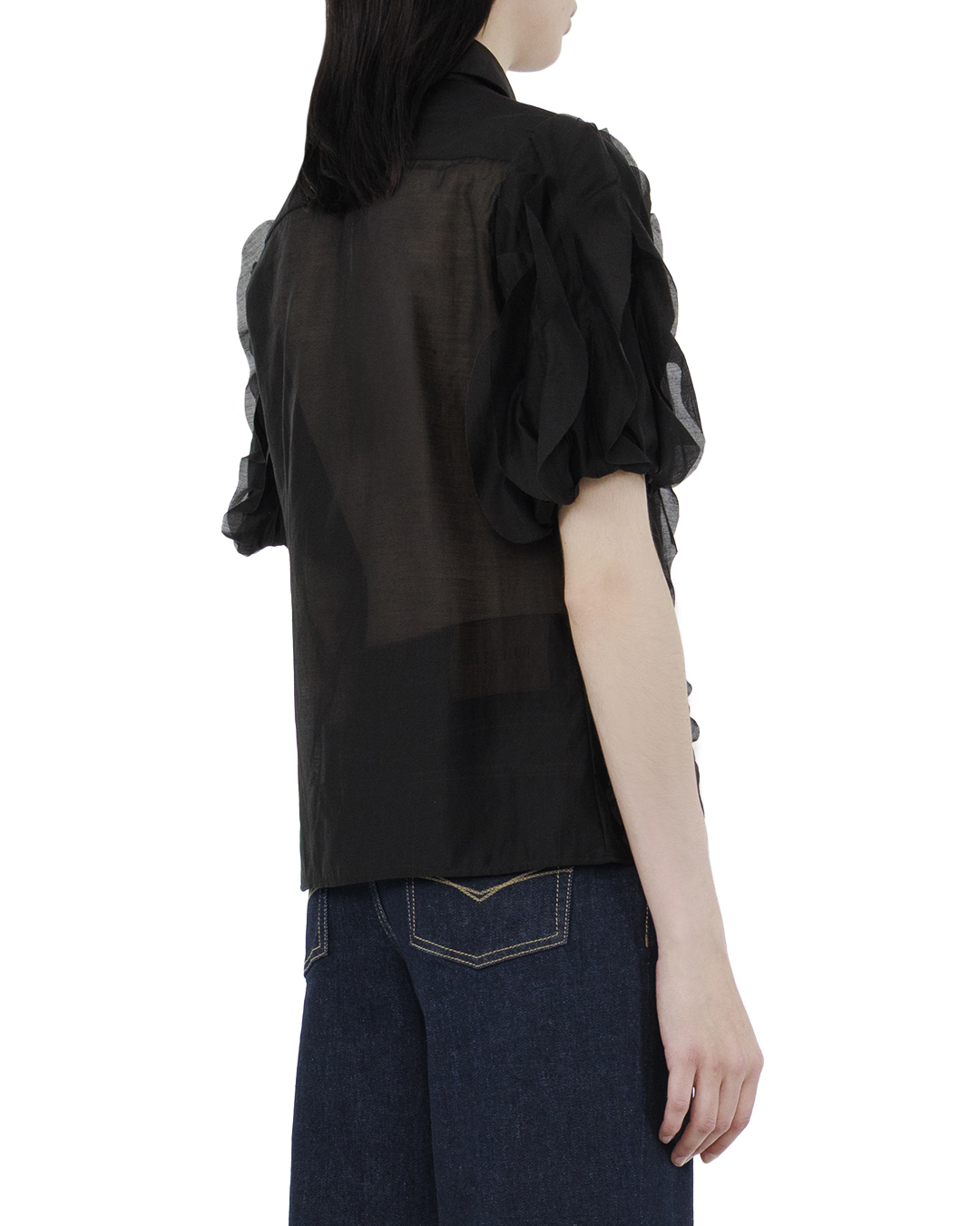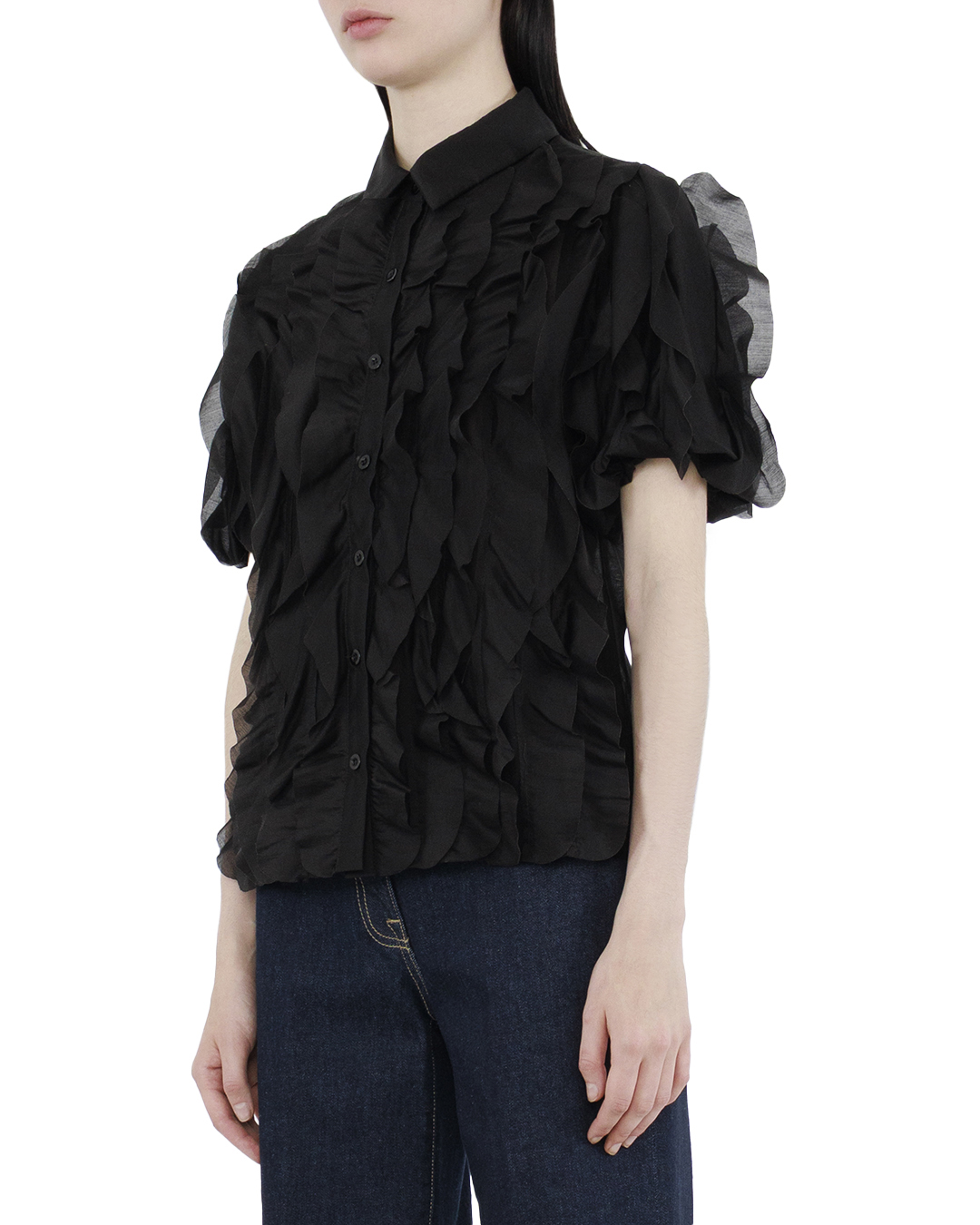 Эта блуза — изысканный пример романтичного стиля с современными акцентами. Выполненная из легкого шифона, она дарит ощущение невесомости и нежности, создавая элегантный и утончённый образ. Тонкие вертикальные рюши по всей длине добавляют структуру и объём, создавая игру текстур и привнося динамику в дизайн. Объёмные рукава акцентируют внимание на плечах, добавляя нотку викторианского шика. Классический воротник придает модели структурированность, гармонично контрастируя с мягкими линиями рюш. Центральная застежка на изящные пуговицы служит дополнительным декоративным элементом, связывающим весь образ воедино. Глубокий черный цвет подчеркивает текстурные детали, делая блузу универсальной и лёгкой для сочетания с различными элементами гардероба — от строгих юбок до стильных брюк. Эта блуза станет воплощением изящества и утонченности в вашем гардеробе.