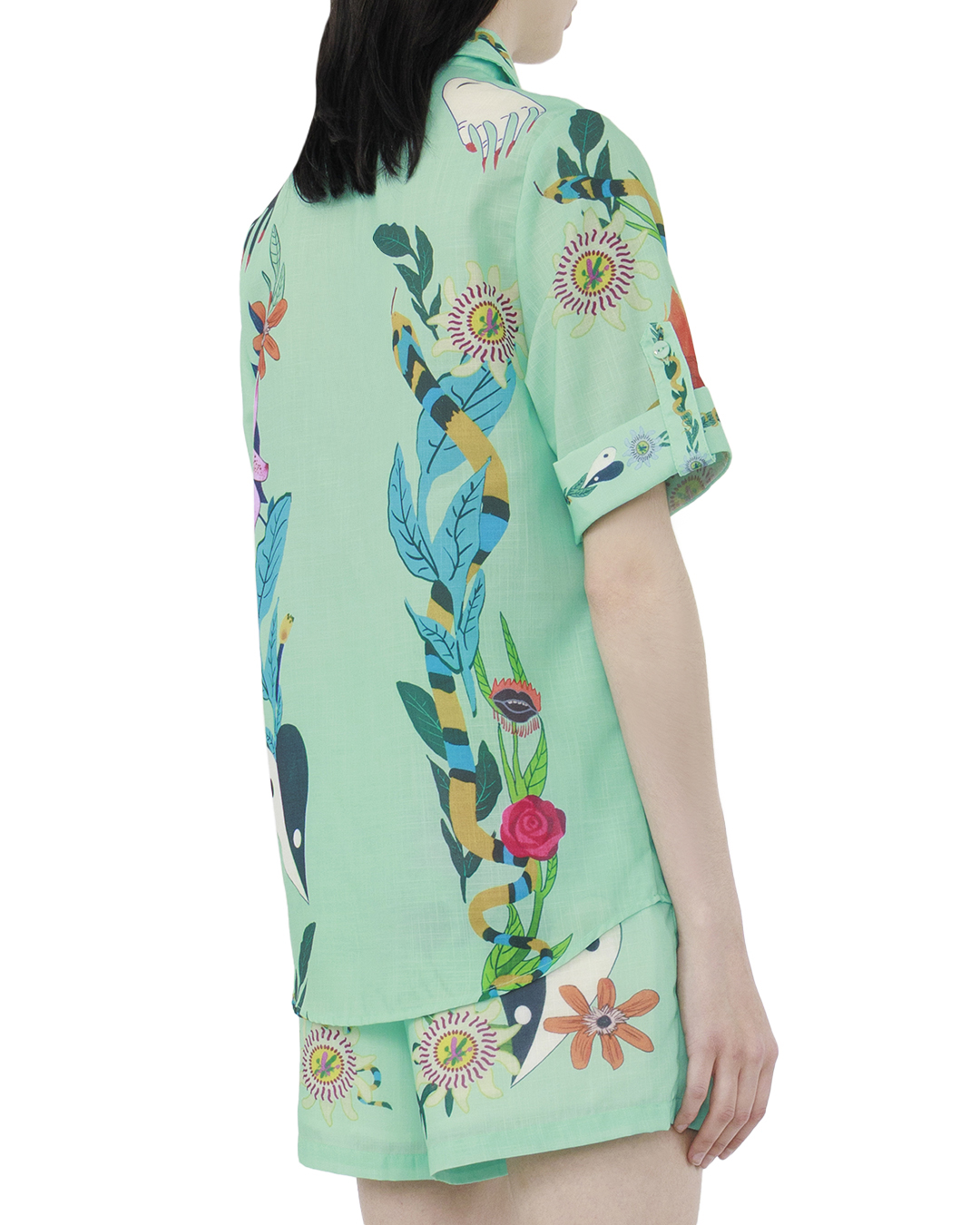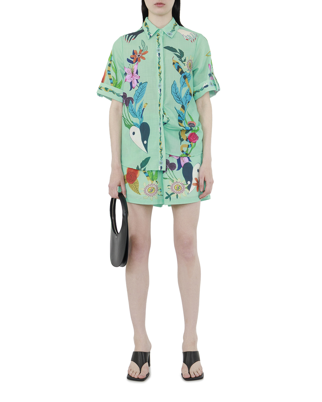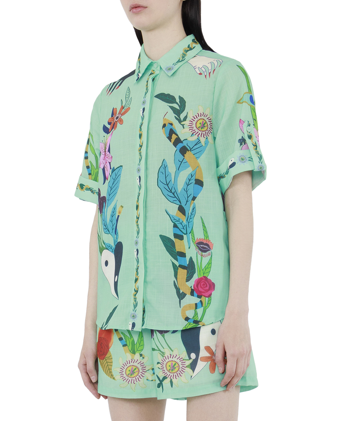 Эта блуза — смелое воплощение тропического стиля и креативности, идеально для тех, кто стремится выразить свою индивидуальность через моду. Изготовленная из легкого и струящегося материала, блуза обеспечивает комфорт и легкость, создавая воздушный силуэт. Яркий тропический принт с насыщенными цветовыми акцентами и экзотическими мотивами привносит ощущение живописной природы и динамики. Этот визуальный эффект добавляет изделию художественную выразительность и энергию. Классический отложной воротник добавляет структурированность и элегантность, делая модель универсальной для различных стилей. Короткие рукава с аккуратной подгибкой создают расслабленный, но изысканный вид, отлично подходящий для теплых дней. Пуговицы в тон основного дизайна и контрастная отделка по краям придают изделию гармоничный и законченный вид, акцентируя внимание на деталях. Эта блуза идеально сочетается с нейтральными брюками или юбкой, обеспечивая выразительный акцент и оживляя любой ансамбль, будь то для повседневной прогулки или летнего мероприятия.