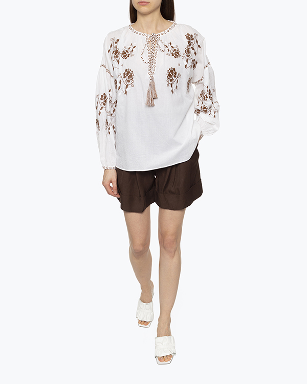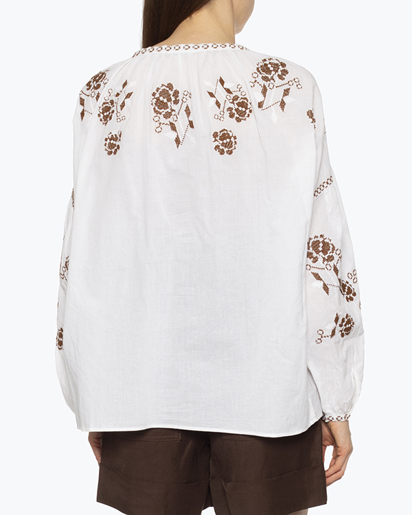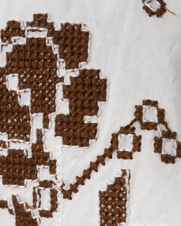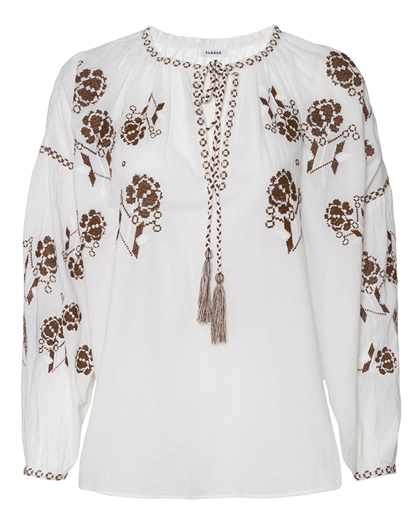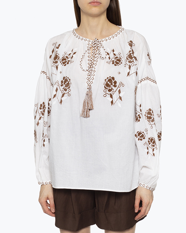 Блуза из тонкого воздушного хлопка белого цвета с вышивкой-крестиком. Модель свободного непринужденного силуэта со спущенной линией плеч и воздушными рукавами. Изделие с круглой линией выреза с завязками.