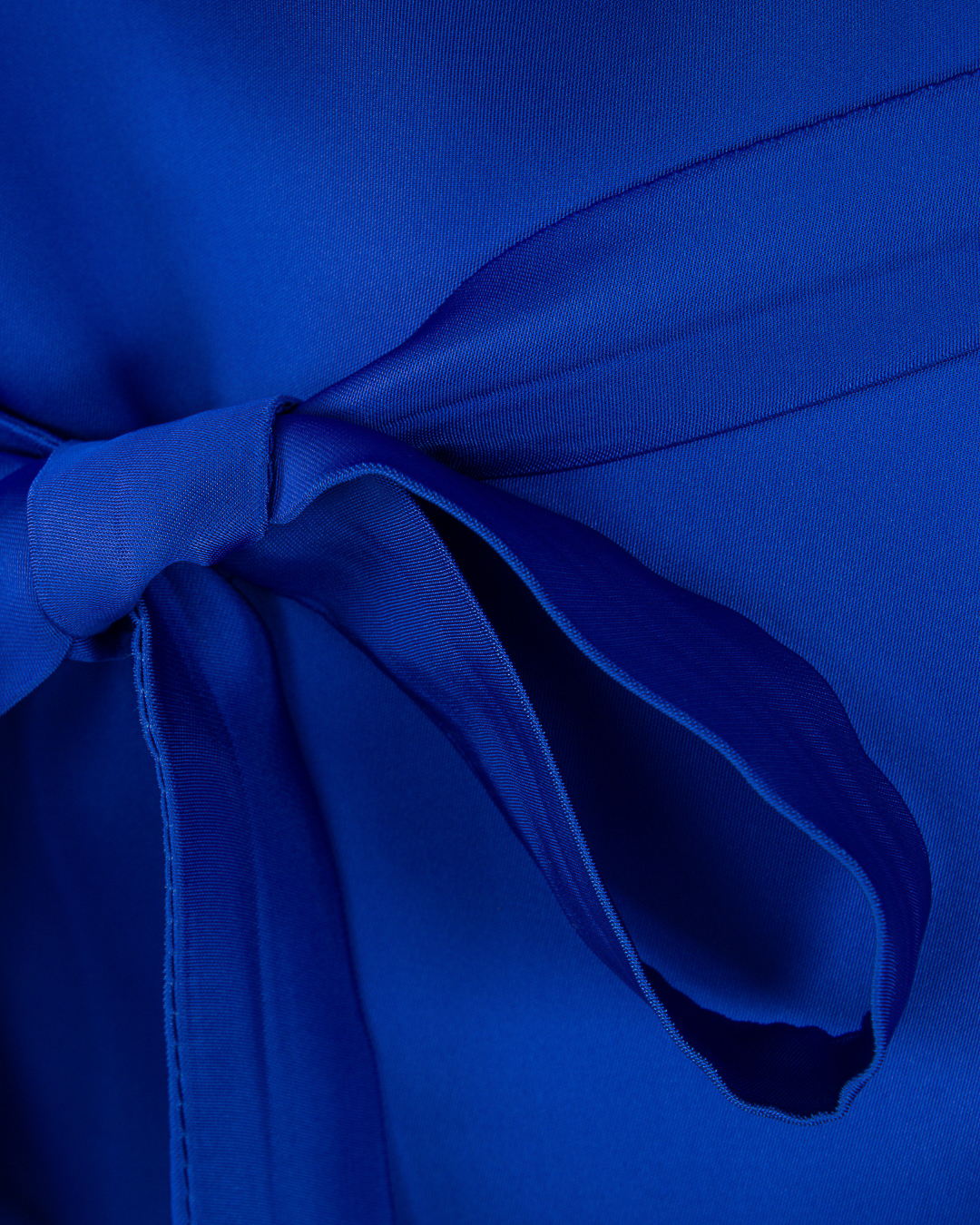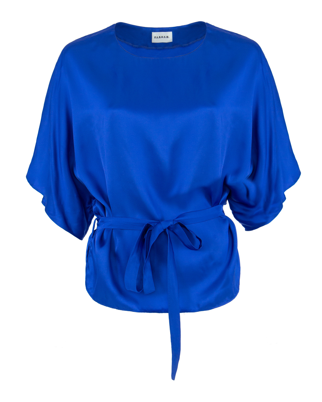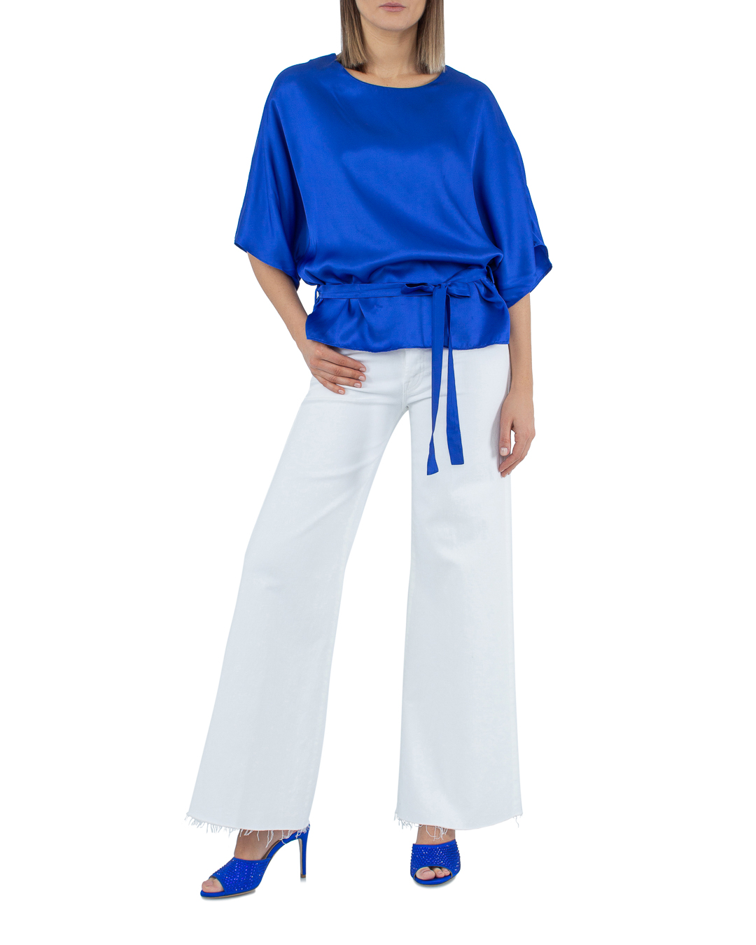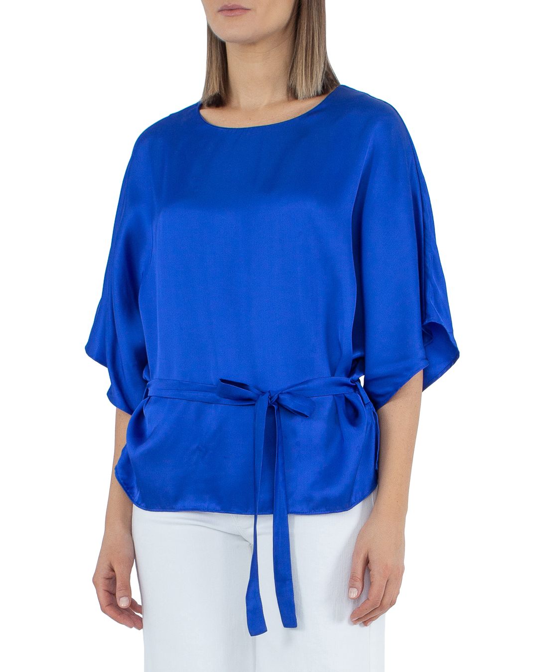 Блуза из атласной вискозы насыщенного синего оттенка. Модель свободного силуэта с цельнокроеными рукавами и поясом из основного материала.