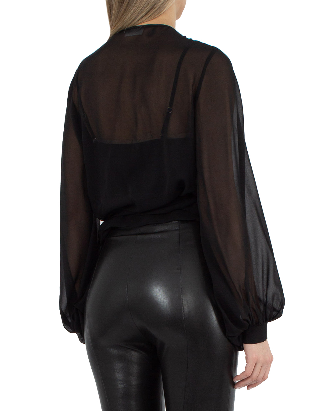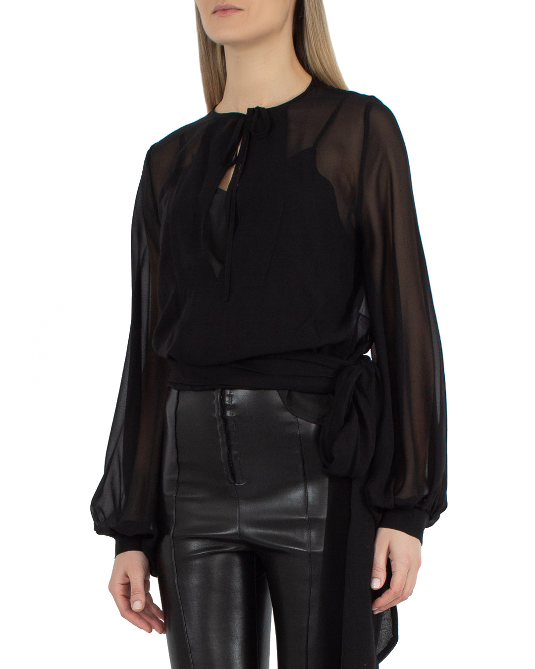 Блуза P.A.R.O.S.H. из полупрозрачного шелка с нижним топом на бретелях. Модель с широкими завязками сбоку и пышными рукавами-буф.