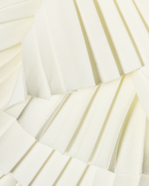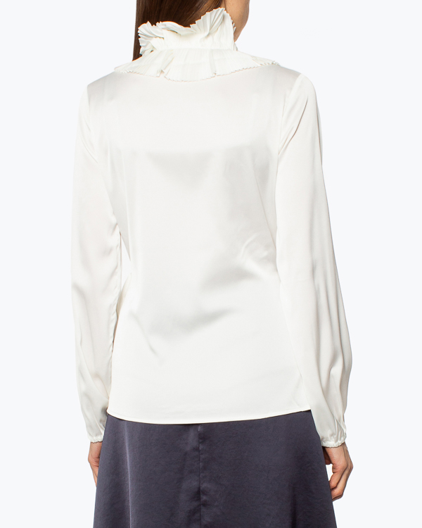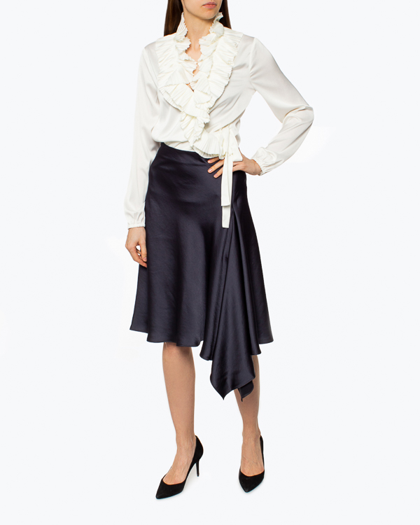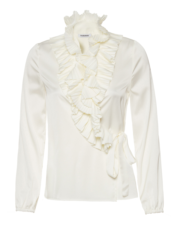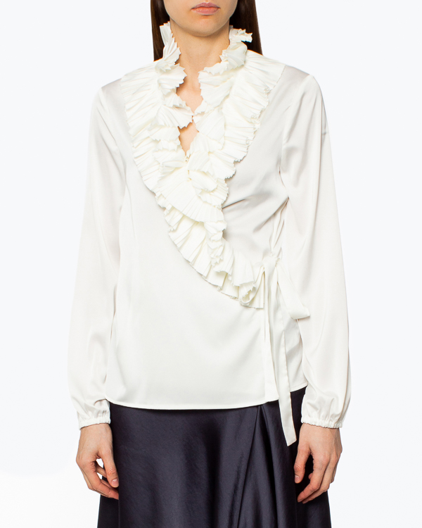 Блуза из тонкого крепа белого цвета. Модель выполнена на запах с завязками и отделкой рюшами.