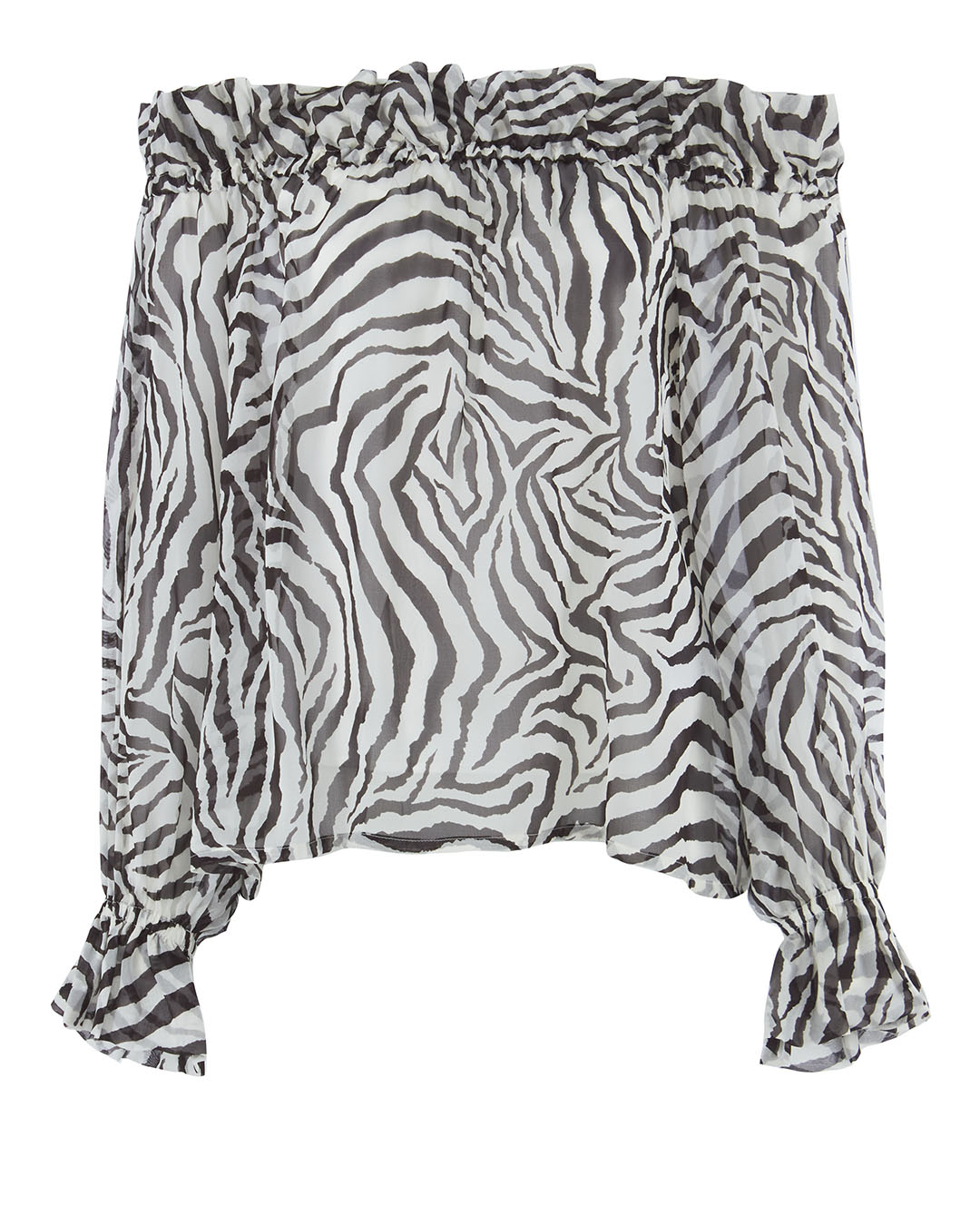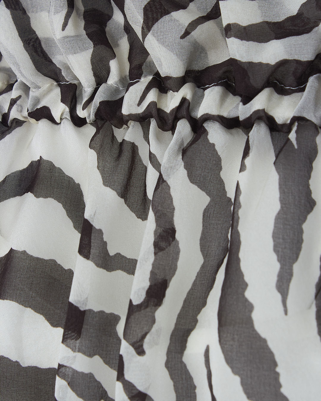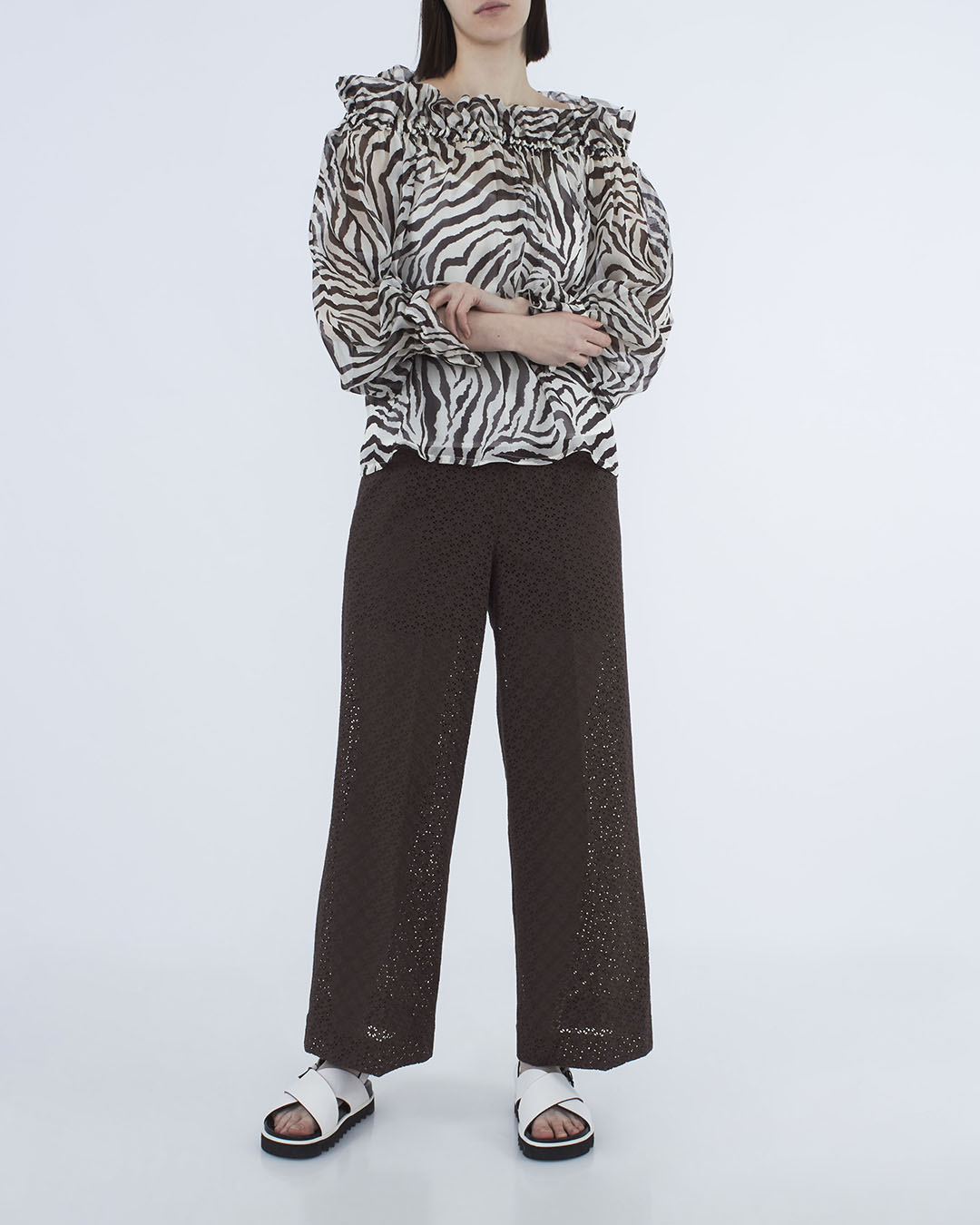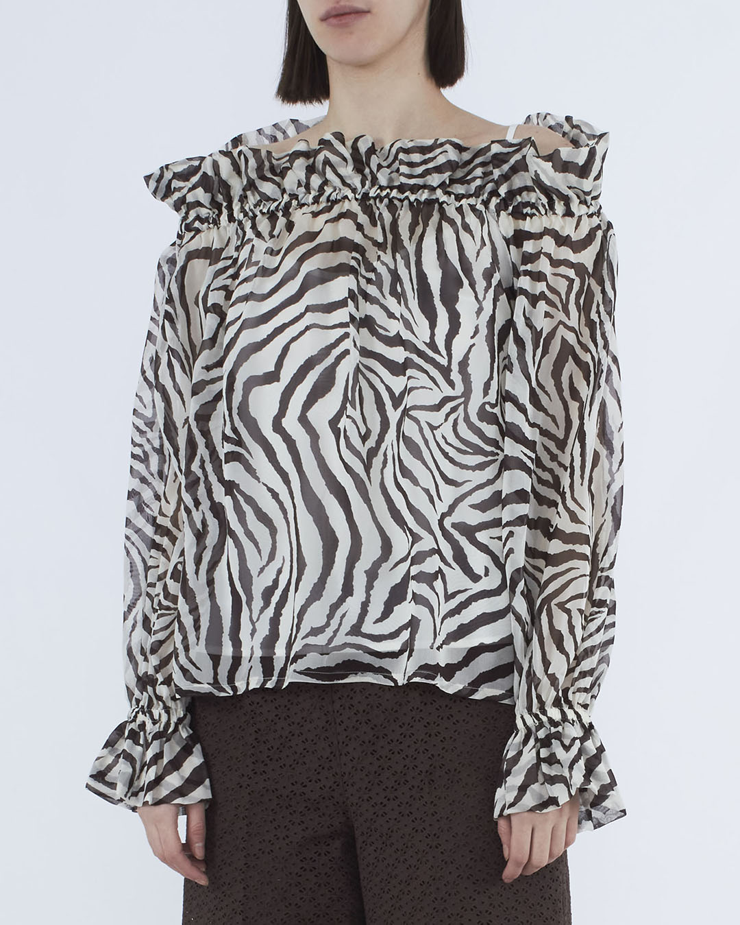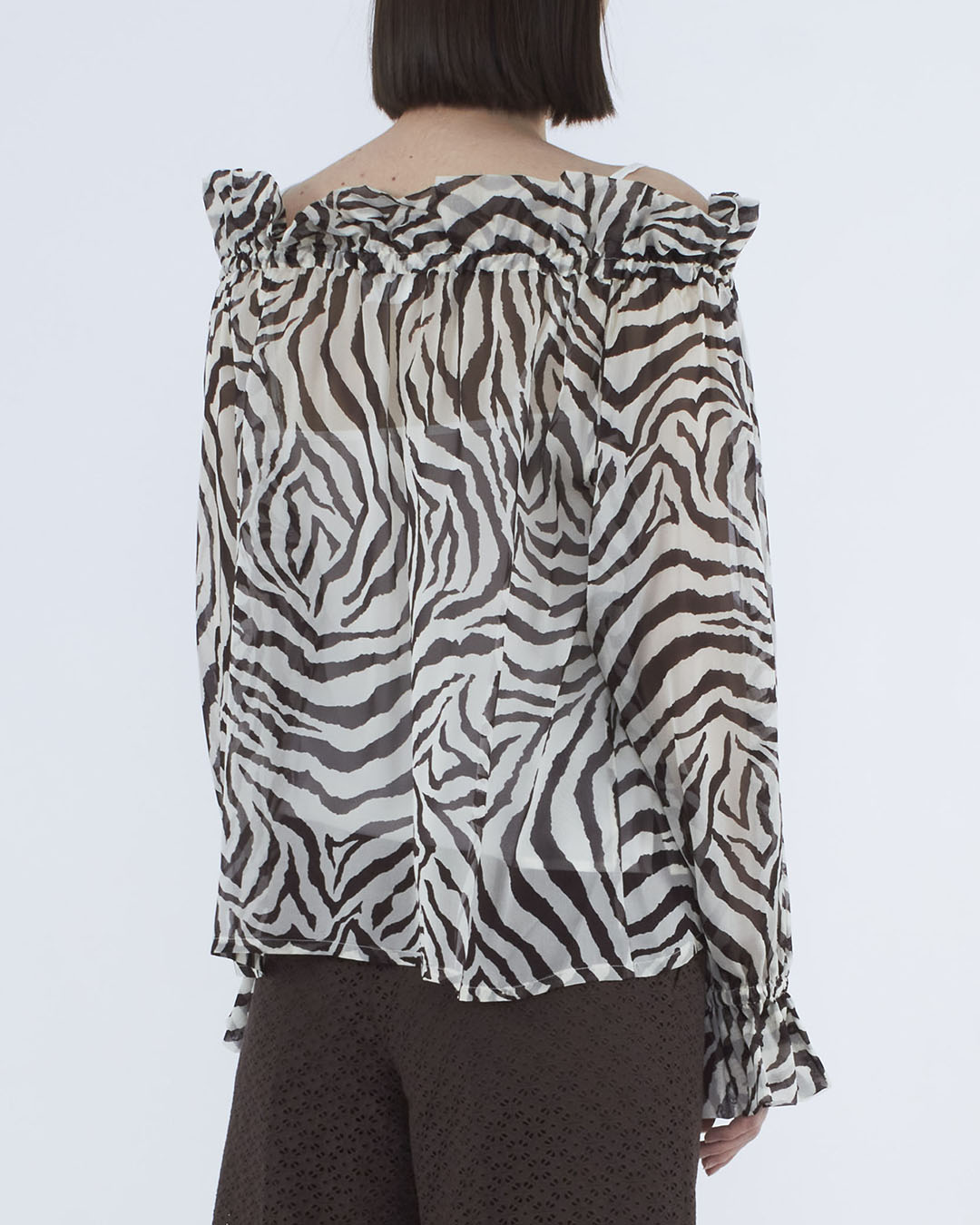 Блуза P.A.R.O.S.H. сшита из тонкого шелка с анималистичным принтом. Свободный прямой крой дополнен длинными широкими рукавами с эластичными манжетами. Широкая линия выреза с открытыми плечами выполнена ширкой и эластичной.