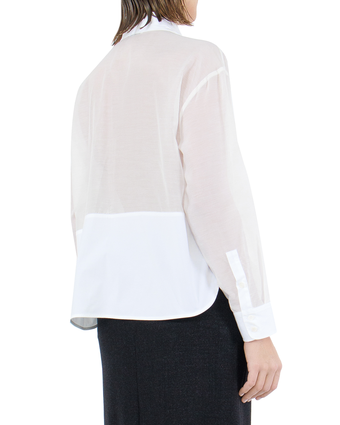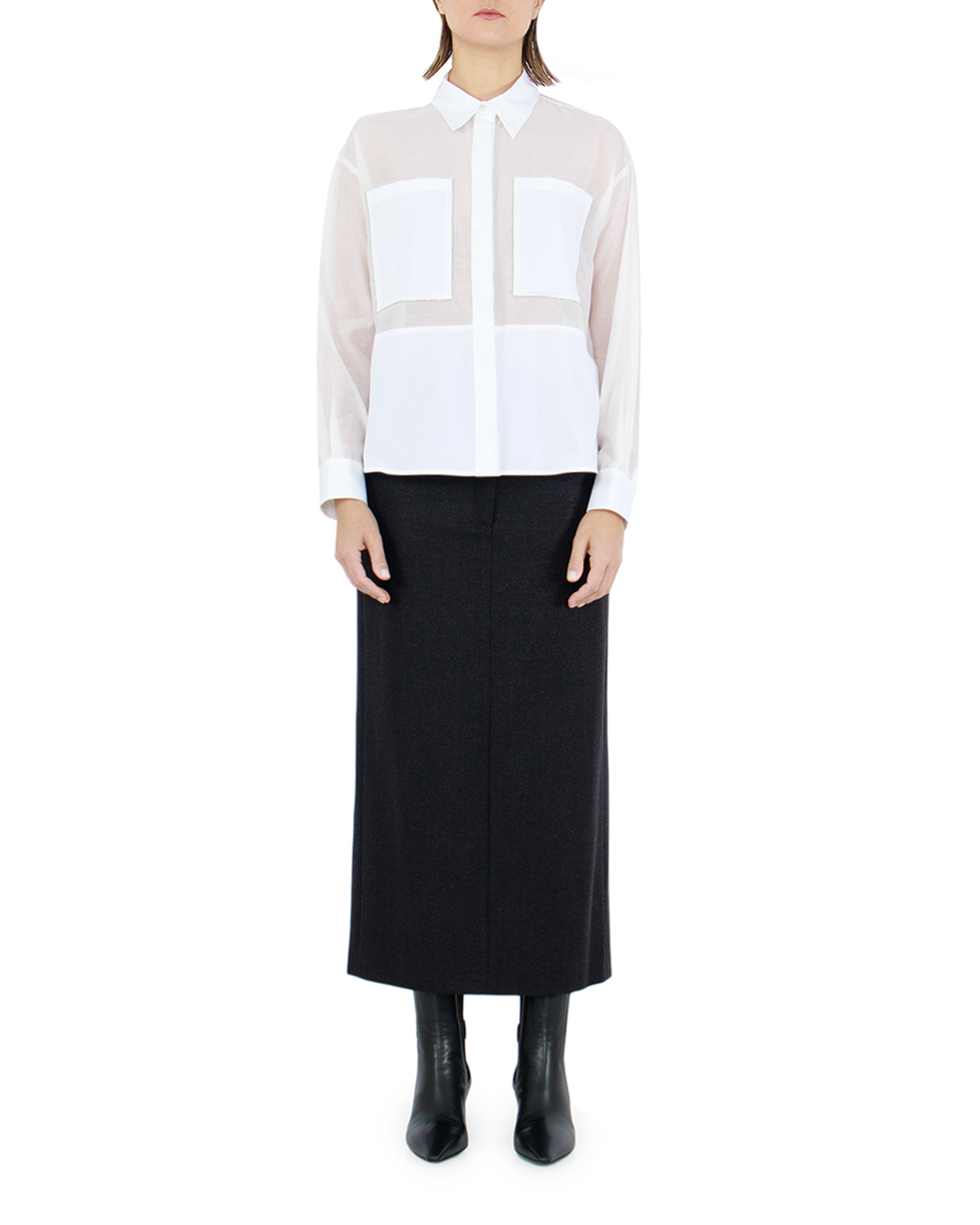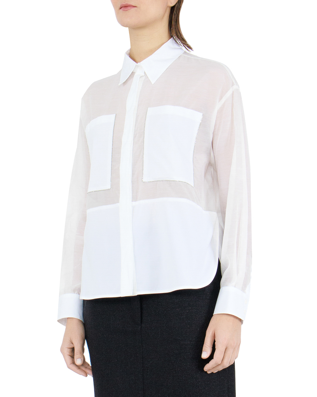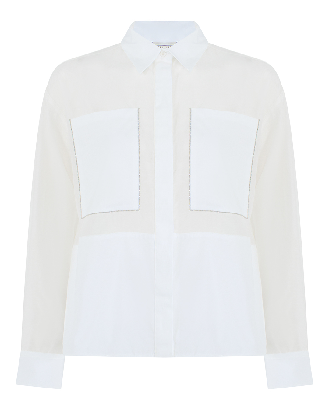 Эта блуза — классическое воплощение легкости и утонченности, которое покоряет своей изысканной простотой и продуманным дизайном. Созданная из легкого, струящегося материала, она обеспечивает невероятный комфорт и элегантную посадку. Прозрачная текстура ткани добавляет лёгкости и воздушности, подчеркивая женственность и шарм. Чистый белый цвет создаёт ощущение свежести и чистоты, идеально подходящей для любого сезона и случая. Классический воротник и застежка на пуговицах придают блузе уверенную структуру, вводя элемент строгости, который балансирует мягкость материала. Широкие накладные карманы на груди не только функциональны, но и добавляют стильный акцент, делая образ более современным. Аккуратные манжеты на пуговицах завершают образ, подчеркивая внимание к деталям и высокое качество исполнения. Все швы выполнены с высокой степенью аккуратности, что обеспечивает долгий срок службы и безупречный внешний вид. Эта блуза — идеальный выбор для тех, кто ценит элегантность и утонченный минимализм, добавляя свежесть и изысканность в гардероб.