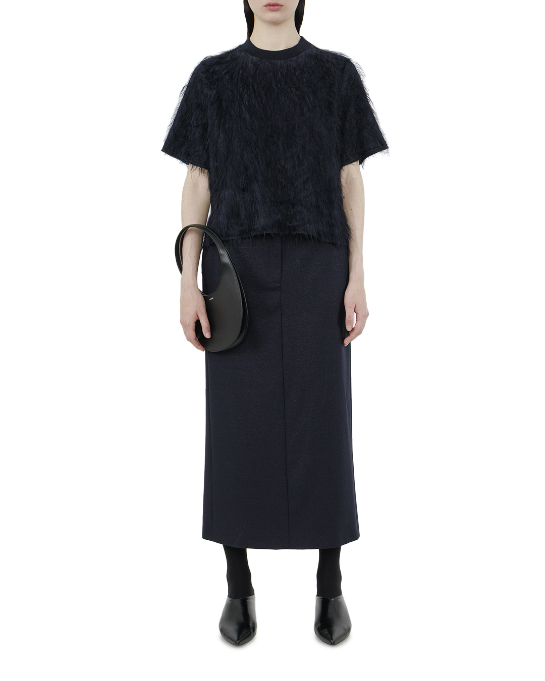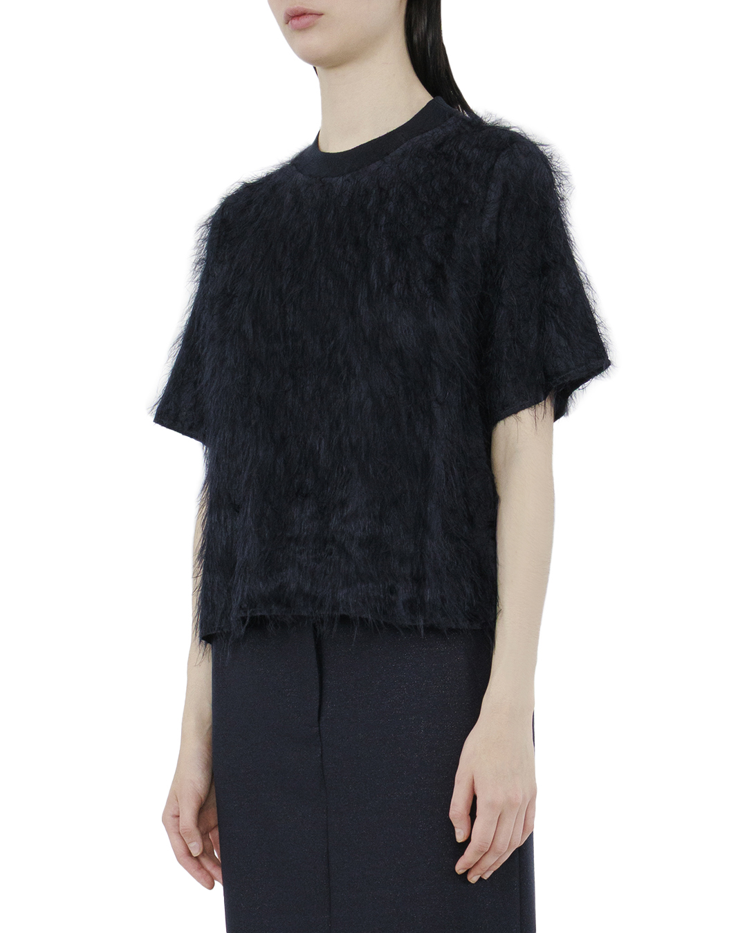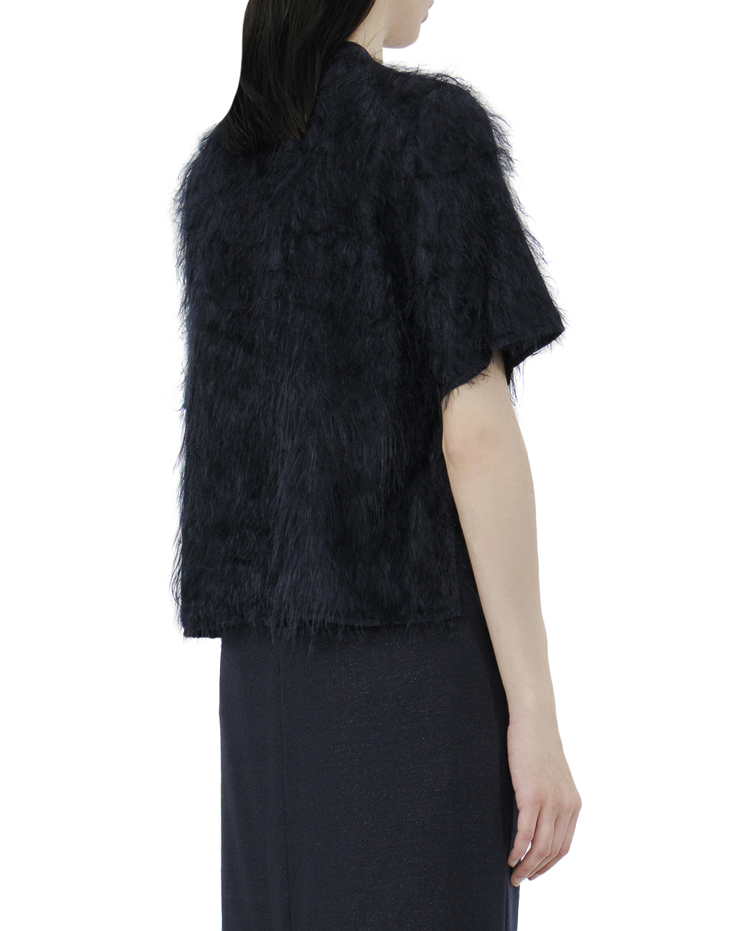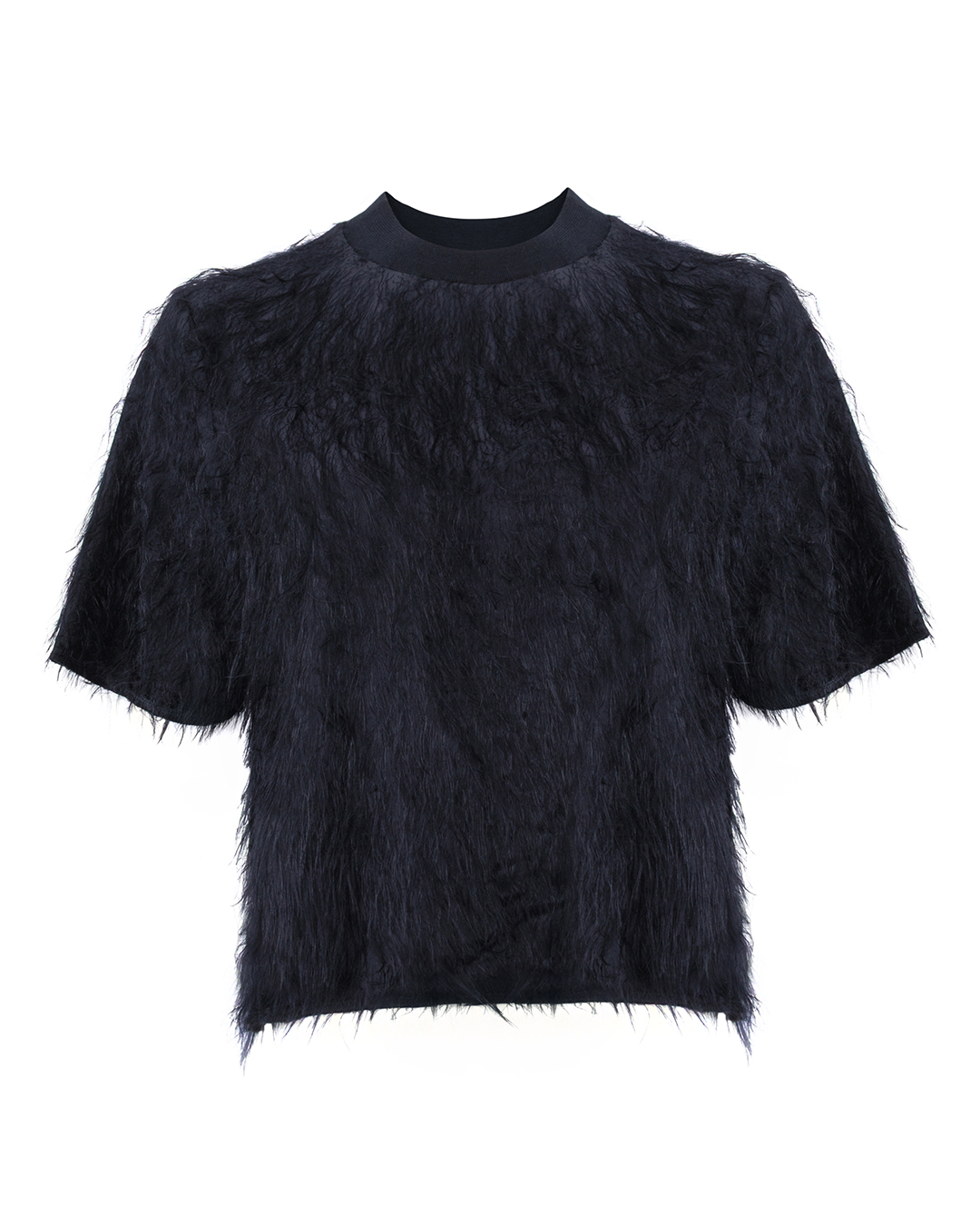 Эта блуза — изысканное сочетание текстур и современного кроя, идеально подходящее для создания выразительных образов. Легкий ворсистый материал придает изделию уникальность и смелость, добавляя динамичности и визуальной глубины.  Круглый вырез акцентирует шею и сочетается с минималистичным дизайном, сохраняя баланс между экстравагантностью и сдержанностью. Короткие рукава создают непринужденный силуэт и добавляют легкости общему облику.  Гладкие швы и аккуратные линии подчёркивают мастерство исполнения, сохраняя ощущение легкости и изящества. Эта блуза может служить ключевым элементом как вечернего, так и повседневного гардероба, добавляя экстравагантную нотку и уверенный стиль любому комплекту.
