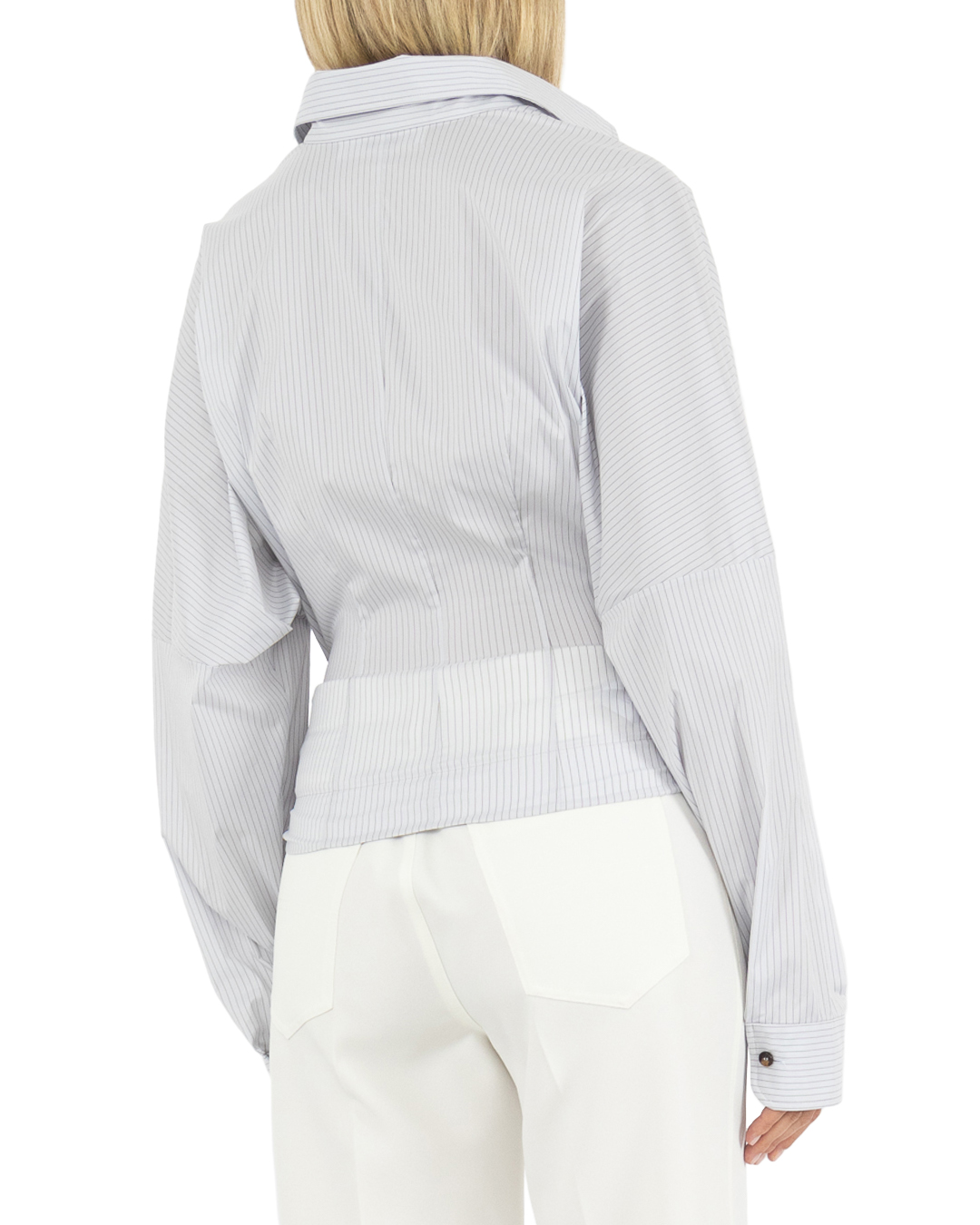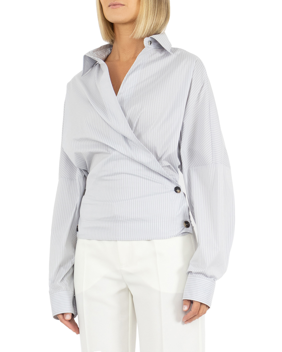 Блуза PHILOSOPHY DI LORENZO SERAFINI из легкого материала в тонкую полоску. Изделие выполнено на запах с застежкой на пуговицы. Объемный верх дополнен длинными рукавами и отложным воротником.