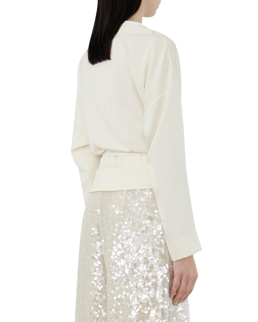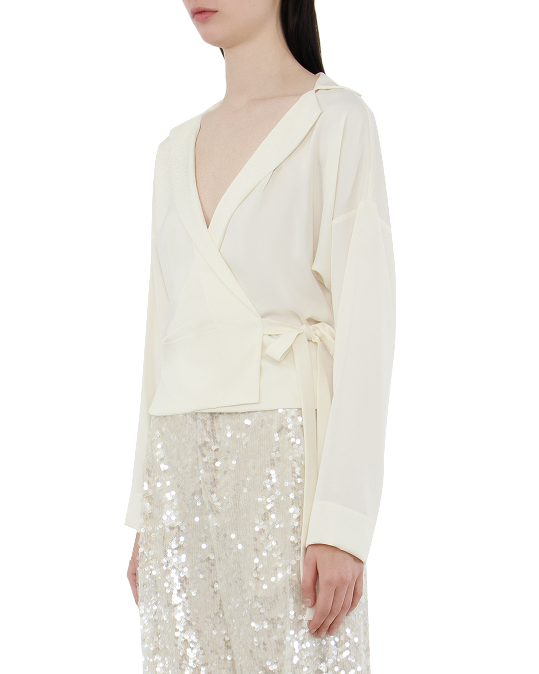 Эта блуза является воплощением утончённой элегантности и современного стиля. Она выполнена из нежного шёлкового материала, который с изяществом обрамляет контуры фигуры. Дизайн на запах добавляет актуальный и изысканный акцент, позволяя регулировать посадку и подчеркивая линию талии. Воротник-шалька придаёт модели уверенную строгость и изысканность, плавно переходя в глубокий V-образный вырез, который добавляет нотку женственности. Длинные рукава с мягкими манжетами создают классический силуэт, идеально подходящий для любой обстановки – от офиса до вечернего выхода. Нежная лента по бокам аккуратно завязывается, придавая блузе деликатный и утончённый вид. Эта блуза станет одним из ключевых элементов вашего гардероба, способным подчеркнуть индивидуальность и стиль.