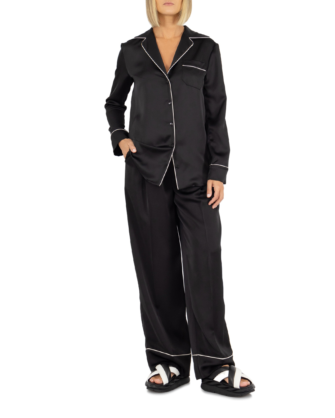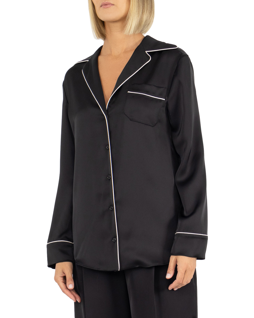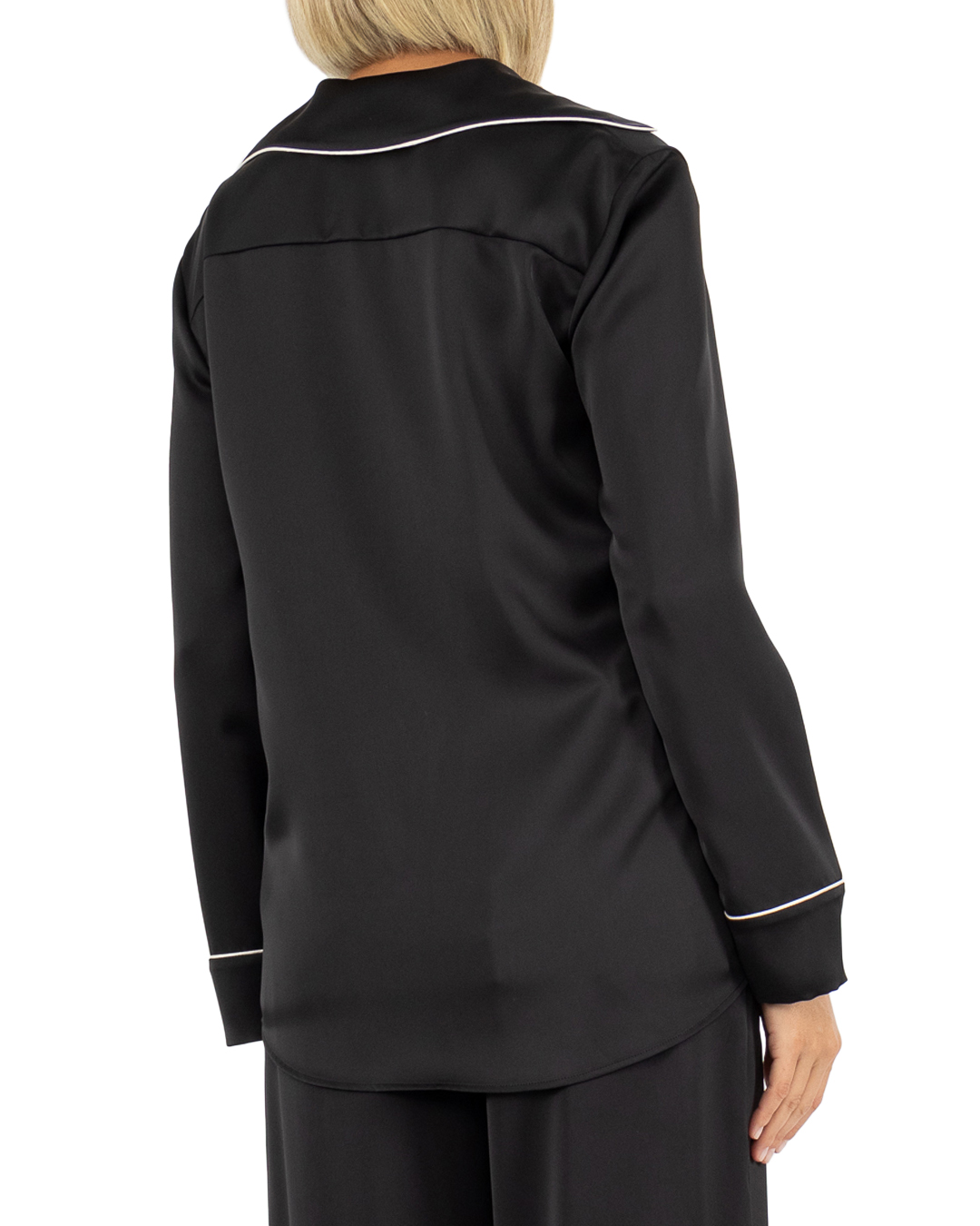 Блуза PHILOSOPHY DI LORENZO SERAFINI сшита в пижамном стиле из атласного материала с окантовкой. Модель прямого силуэта с застежкой на пуговицы дополнена отложным воротником и карманом на груди.