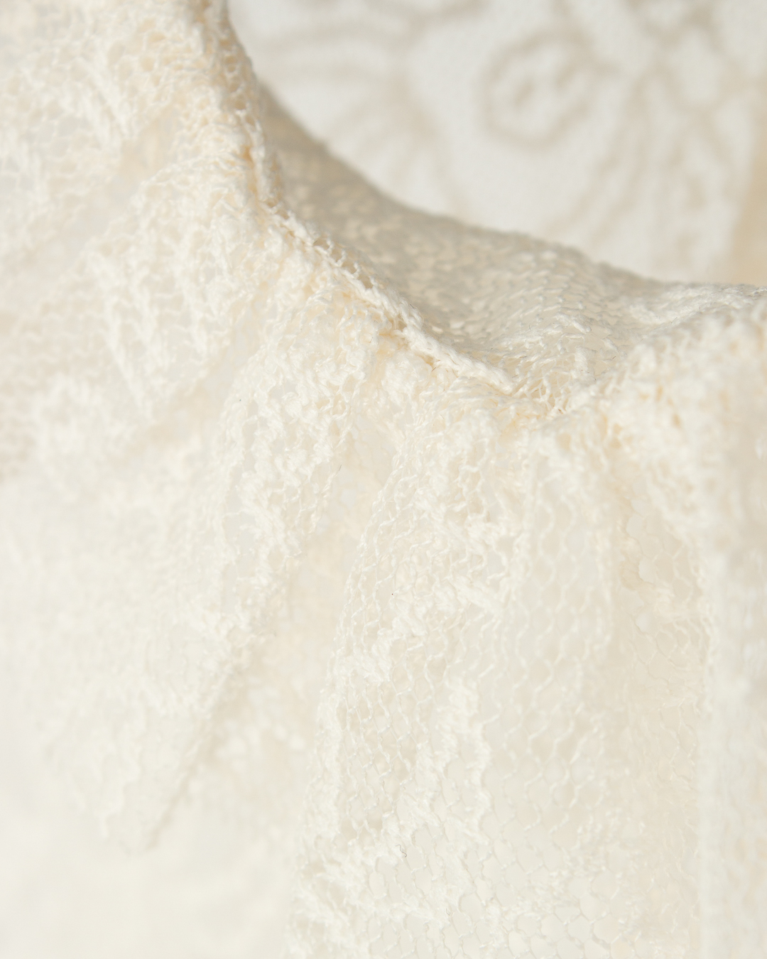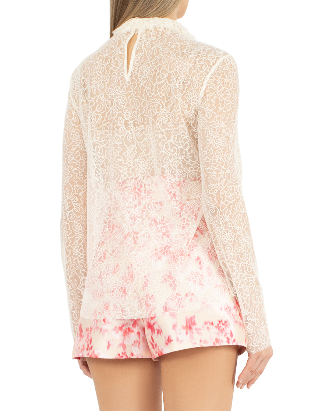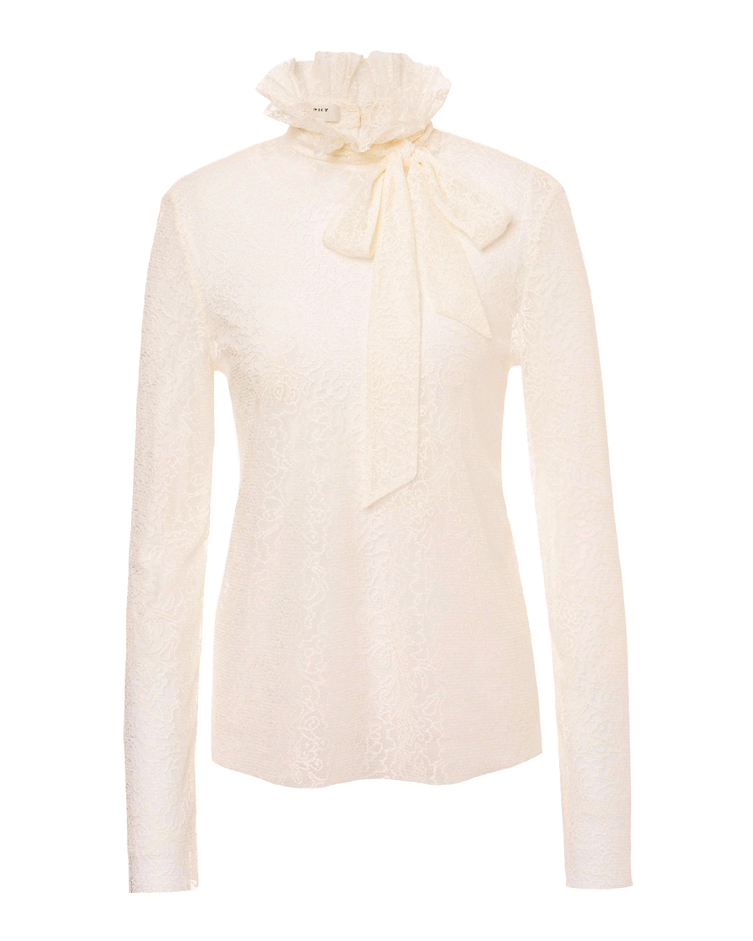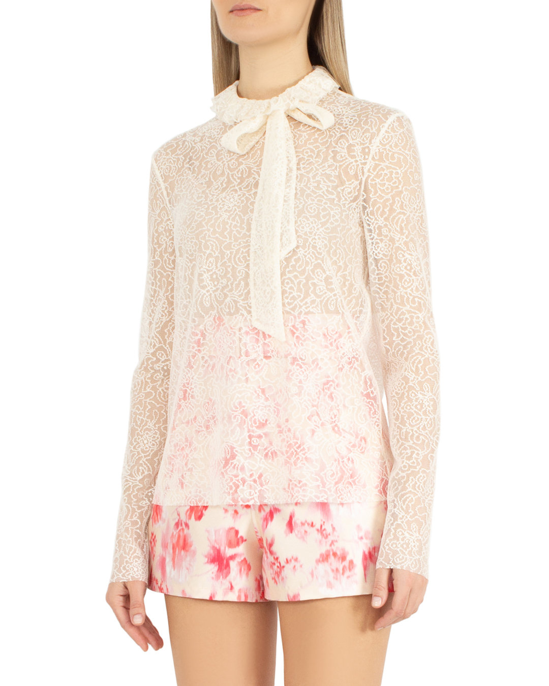 Блуза PHILOSOPHY DI LORENZO SERAFINI из ажурного материала бежевого оттенка. Модель сшита по фигуре и дополнена собранным воротником и завязками на шее на бант.