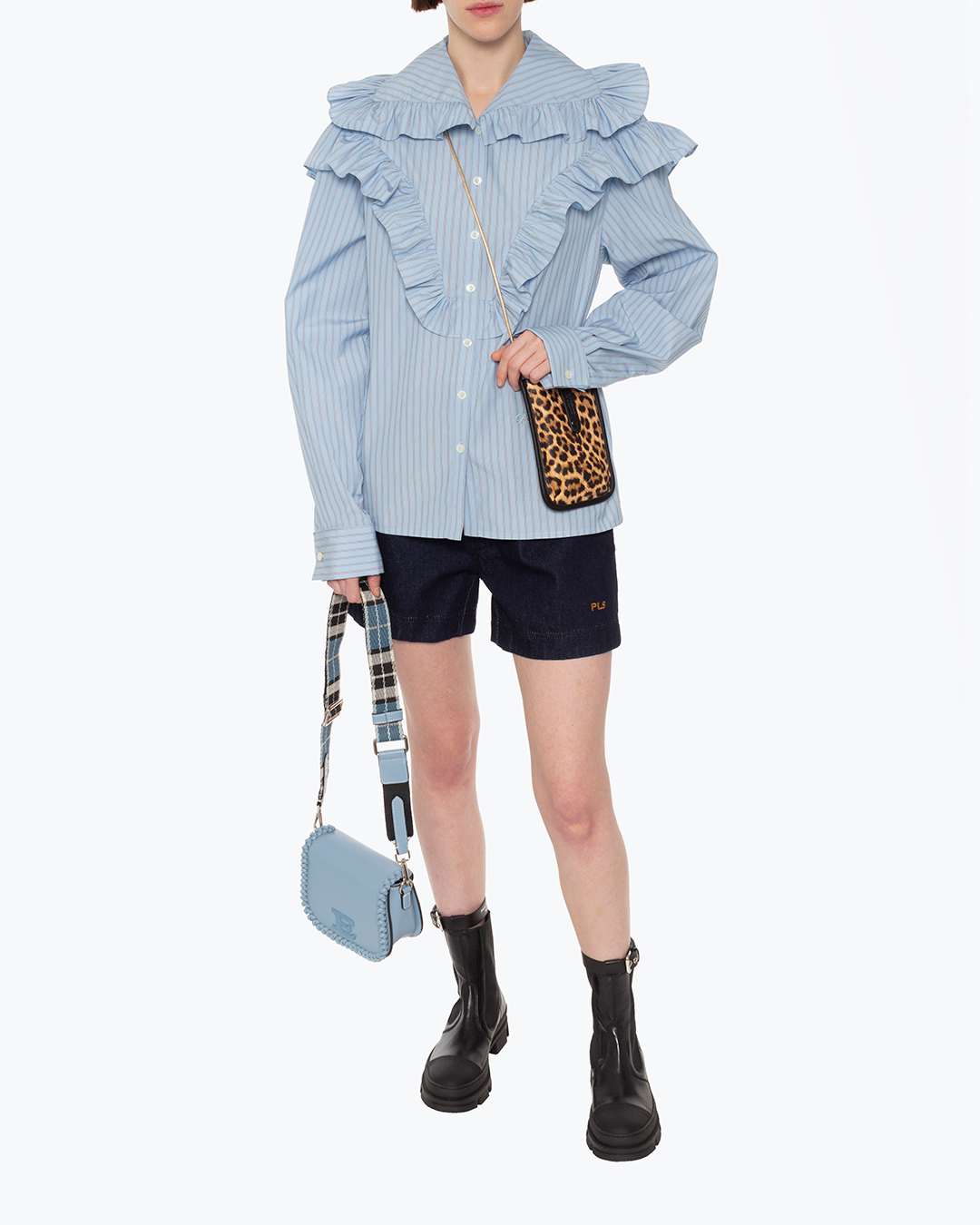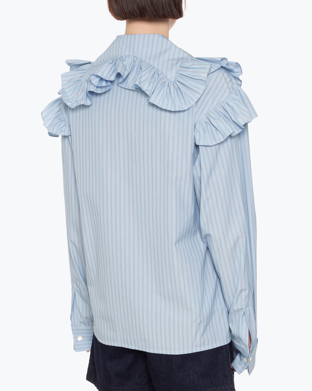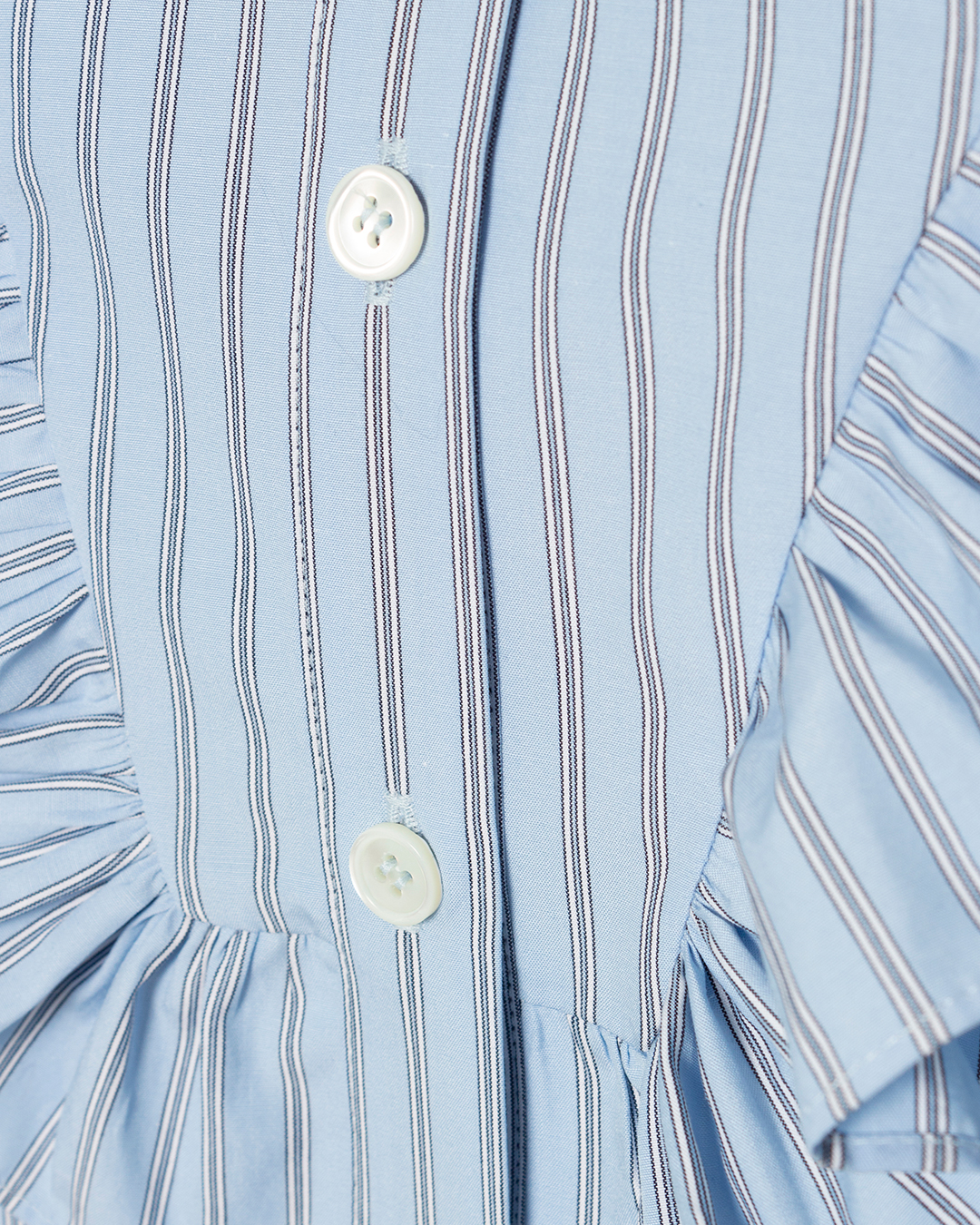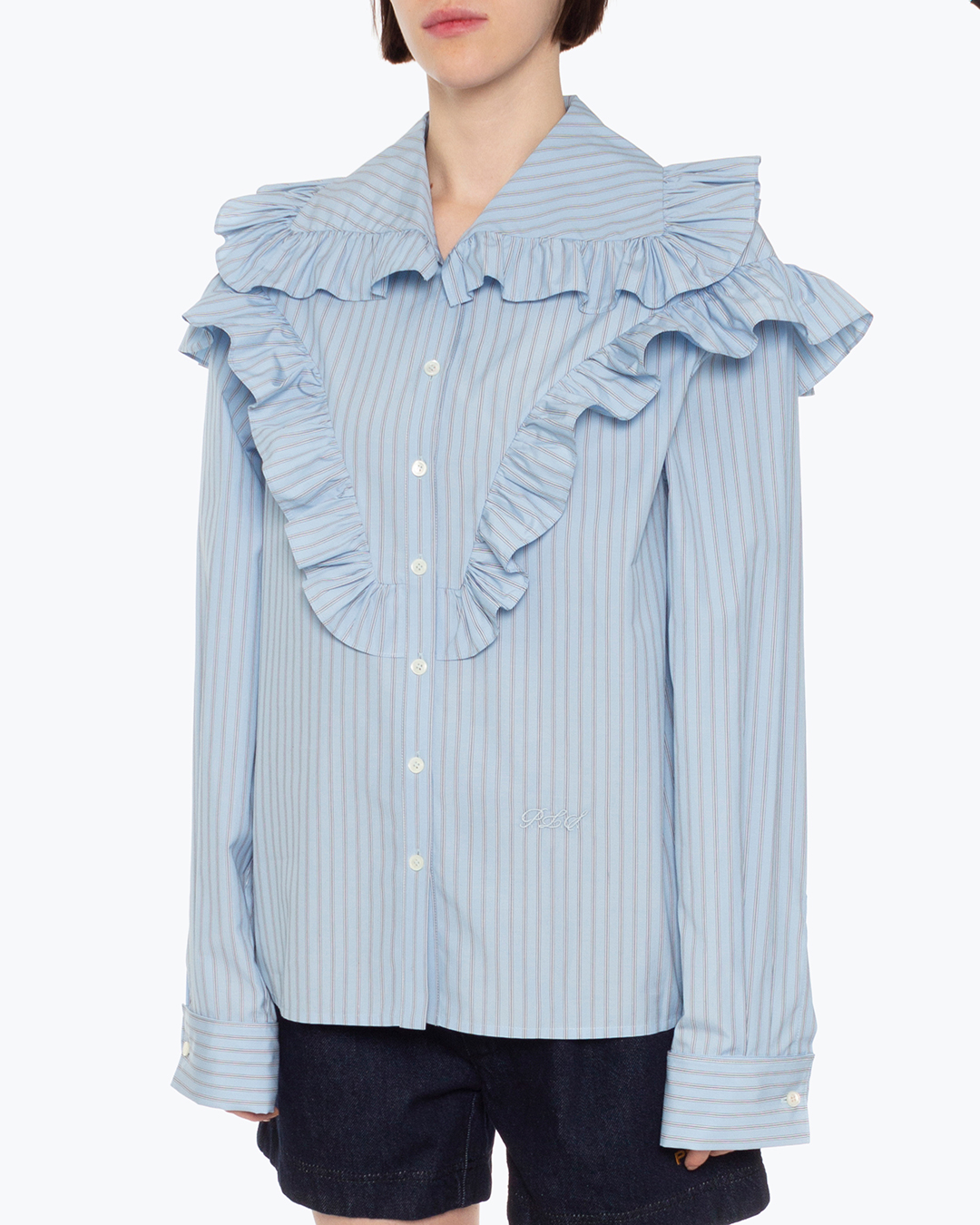 Блуза PHILOSOPHY DI LORENZO SERAFINI из рубашечного хлопка голубого оттенка в тонкую полоску. Прямой силуэт с застежкой на пуговицы дополнен объемной отделкой рюшами по линии плеч и отложного воротника.
