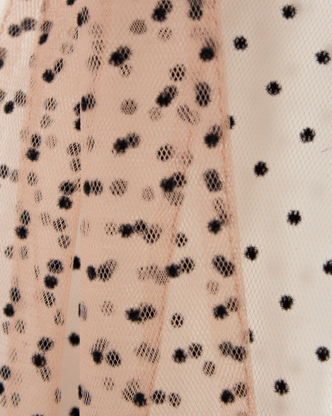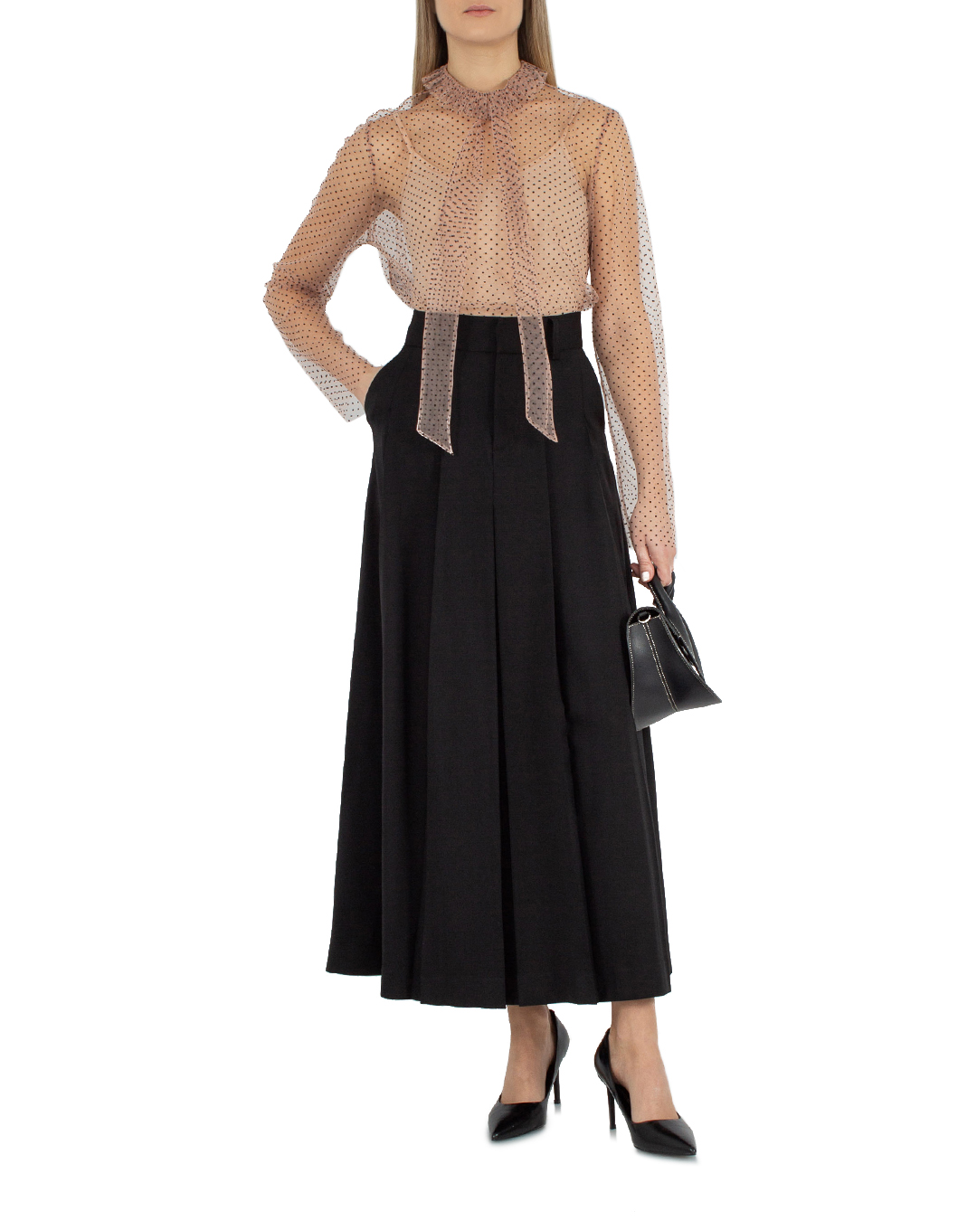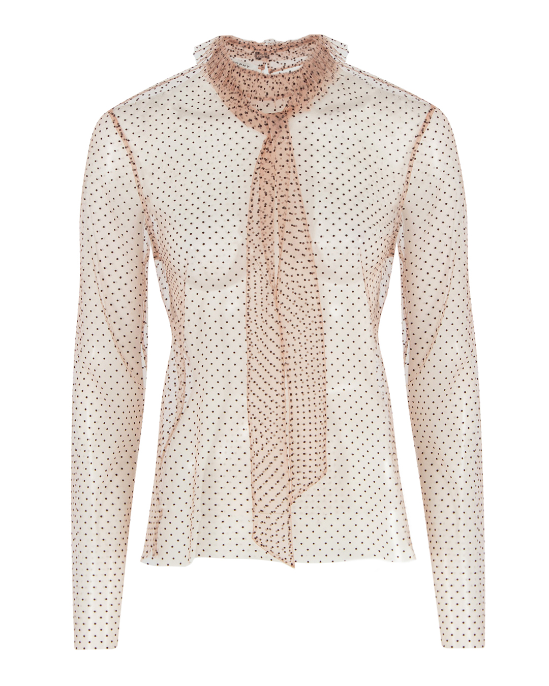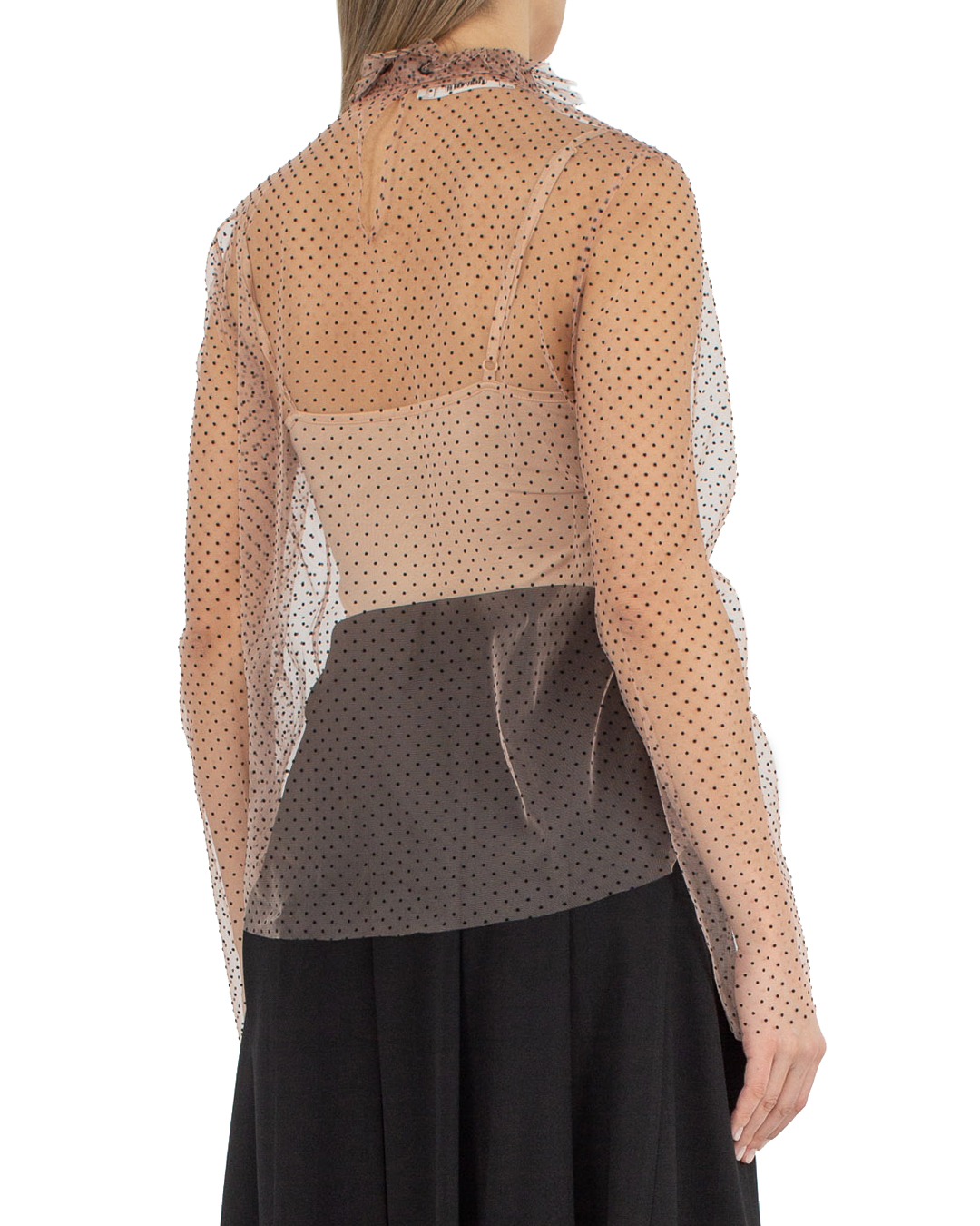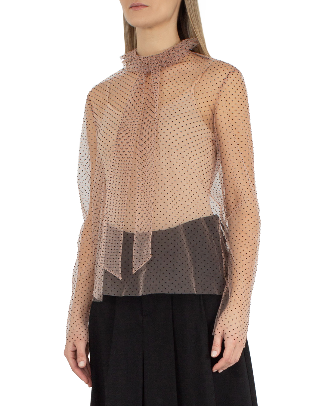 Блуза PHILOSOPHY DI LORENZO SERAFINI из полупрозрачного сетчатого материала в мелкий горошек. Изделие прямого силуэта с завязками на шее.