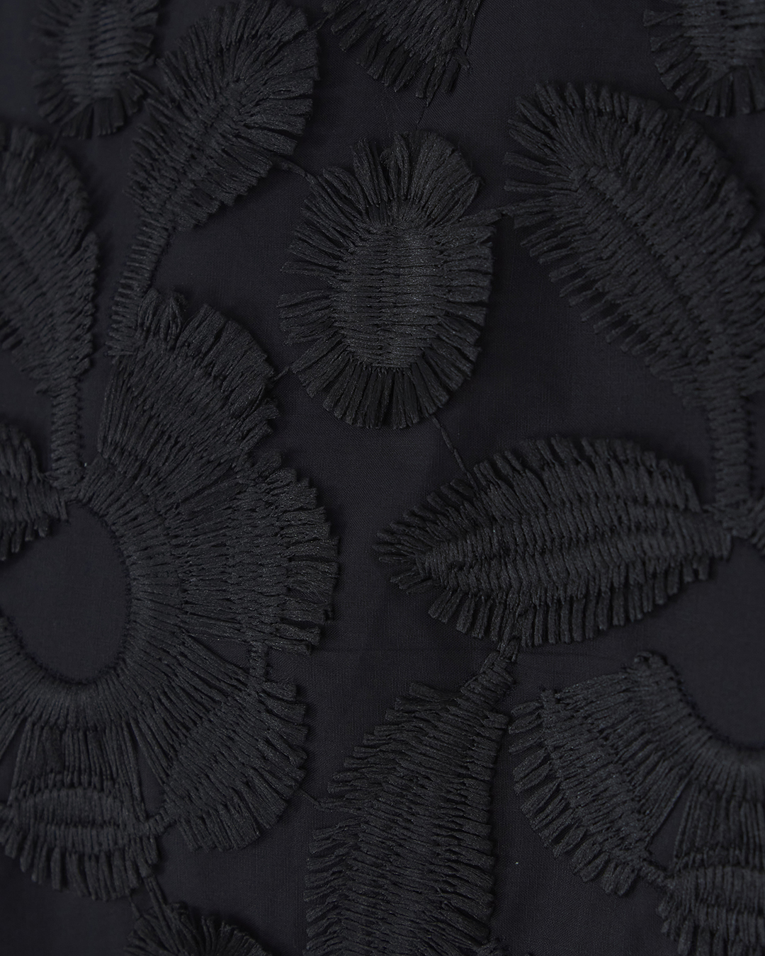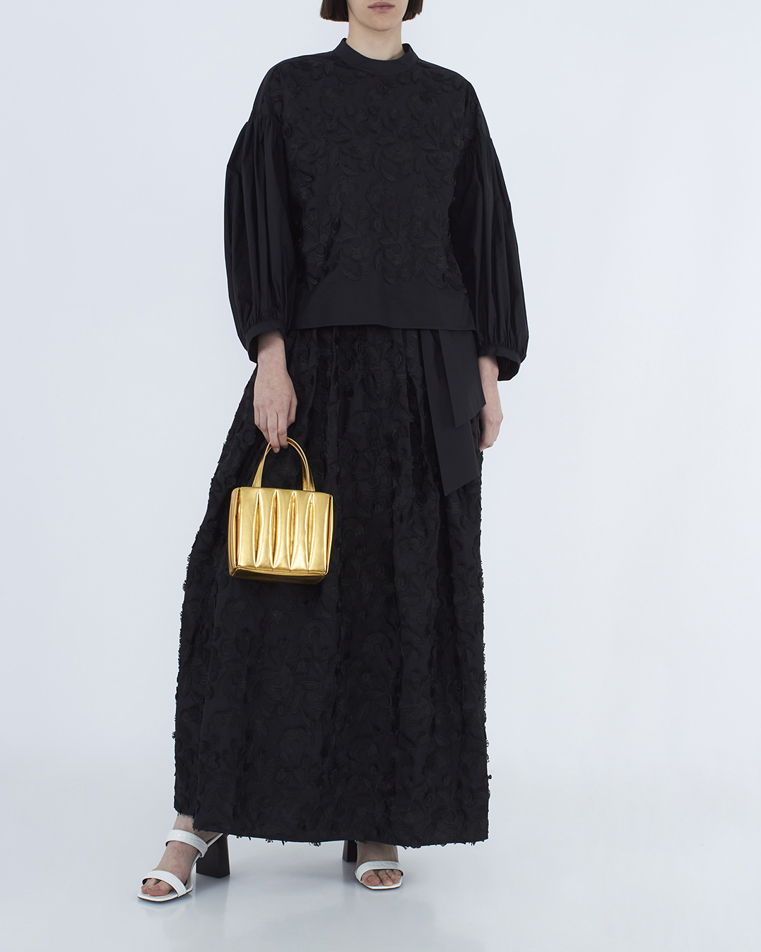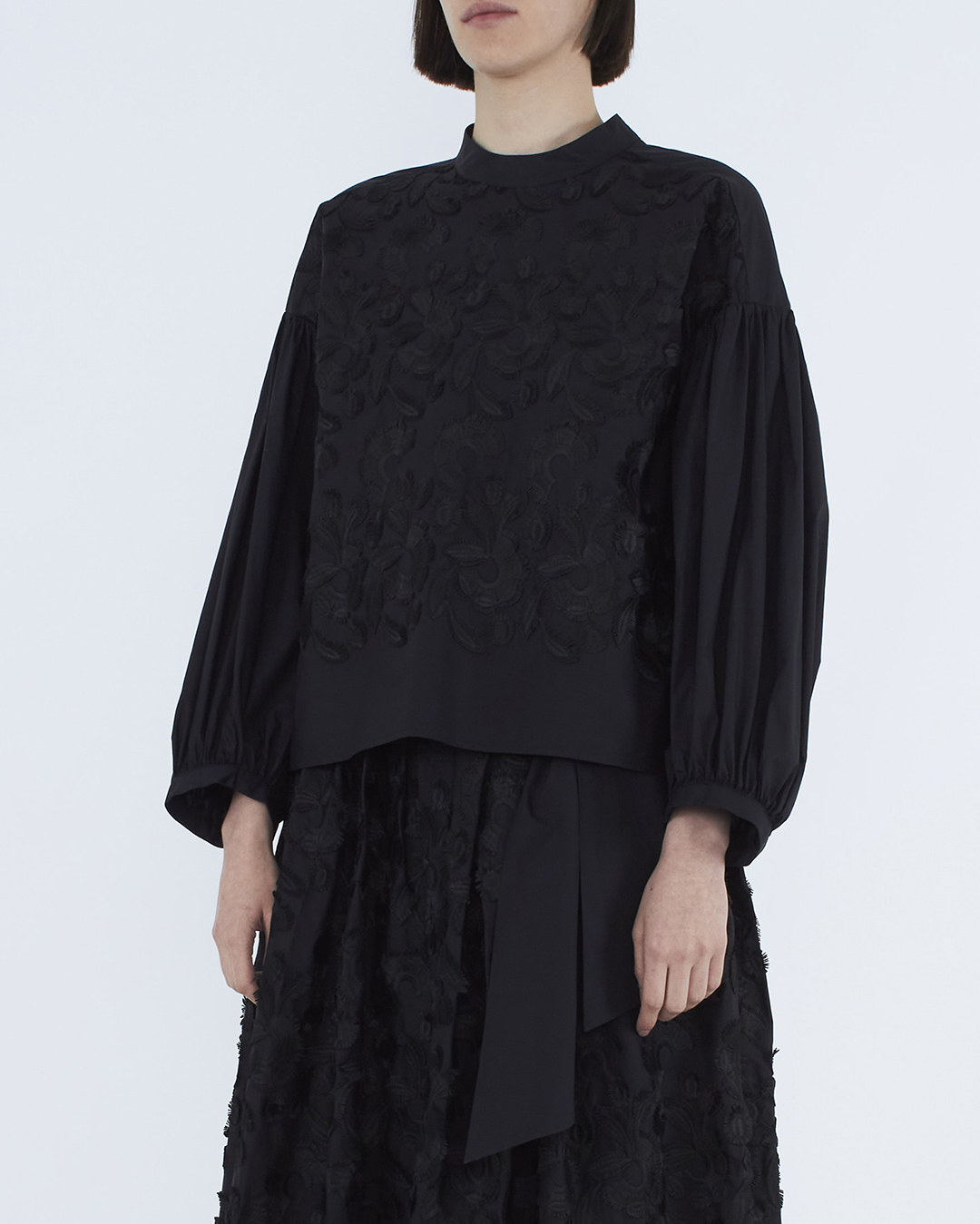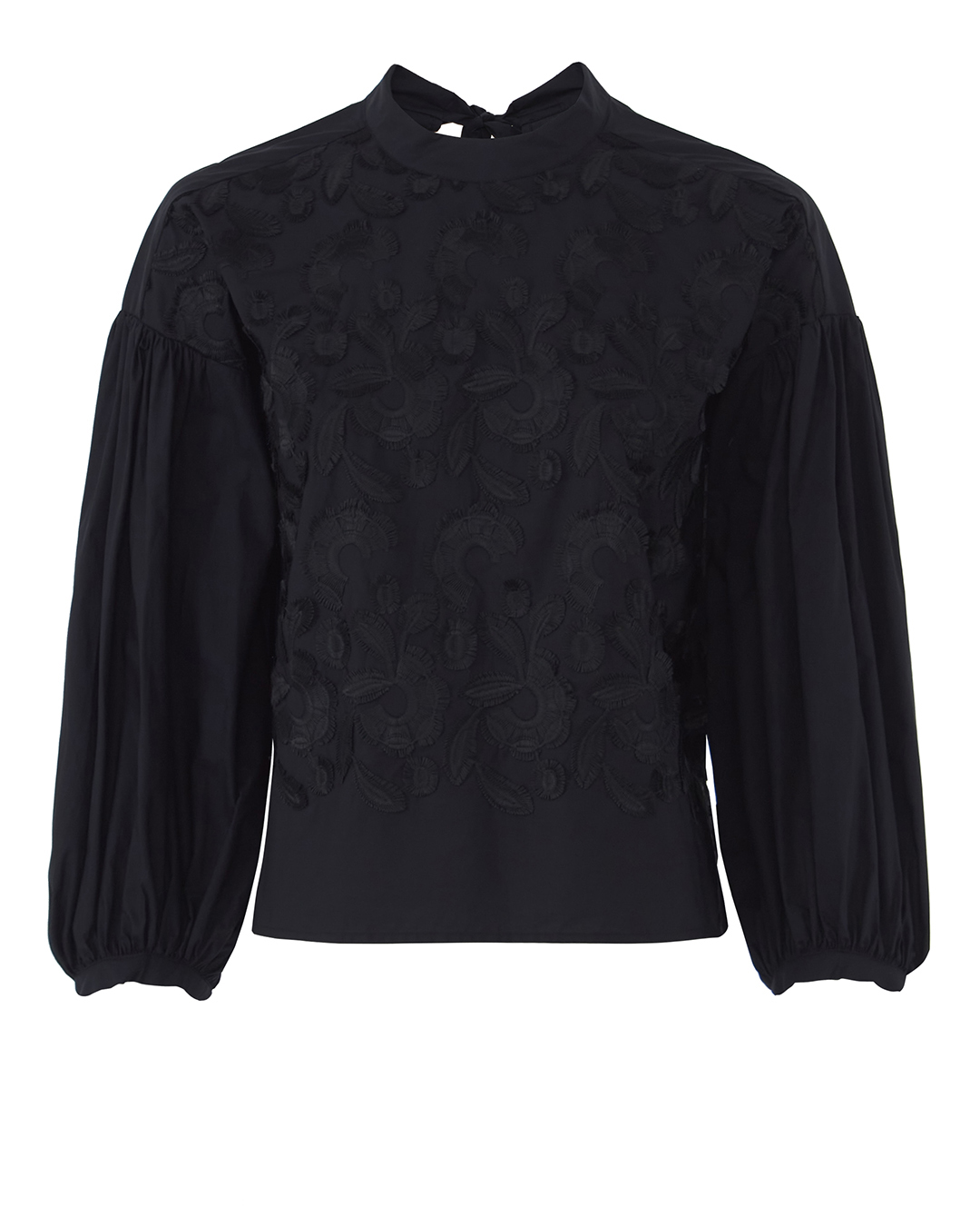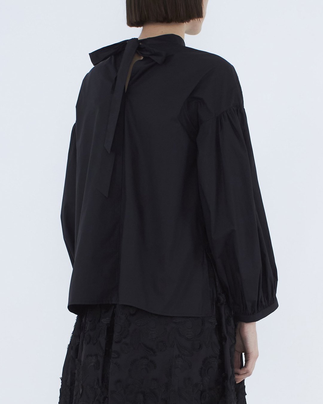 Блуза PSOPHIA сшита из хлопка черного цвета с вышивкой в основной тон. Модель объемного силуэта с длинными рукавами-буф и завязками на спине.