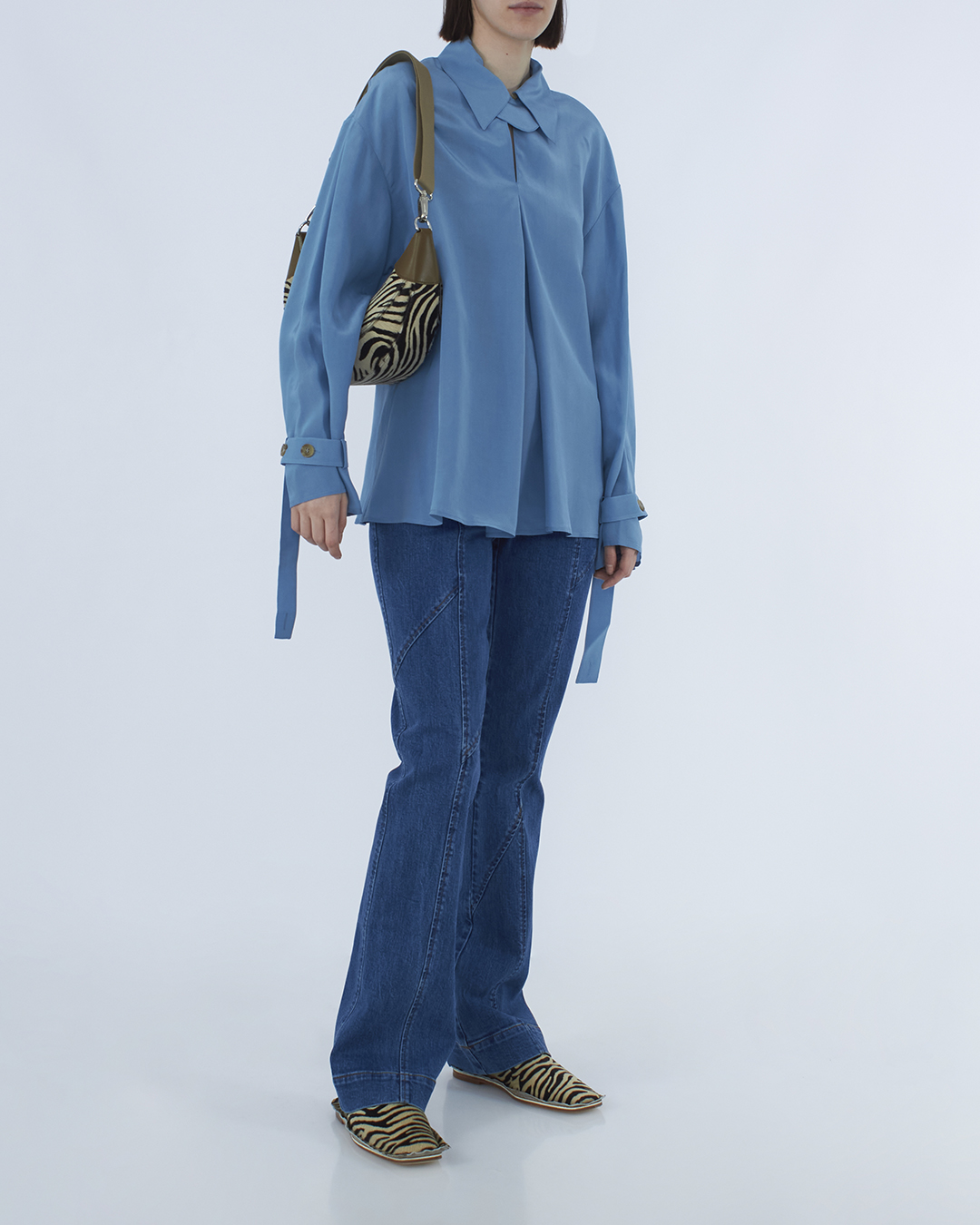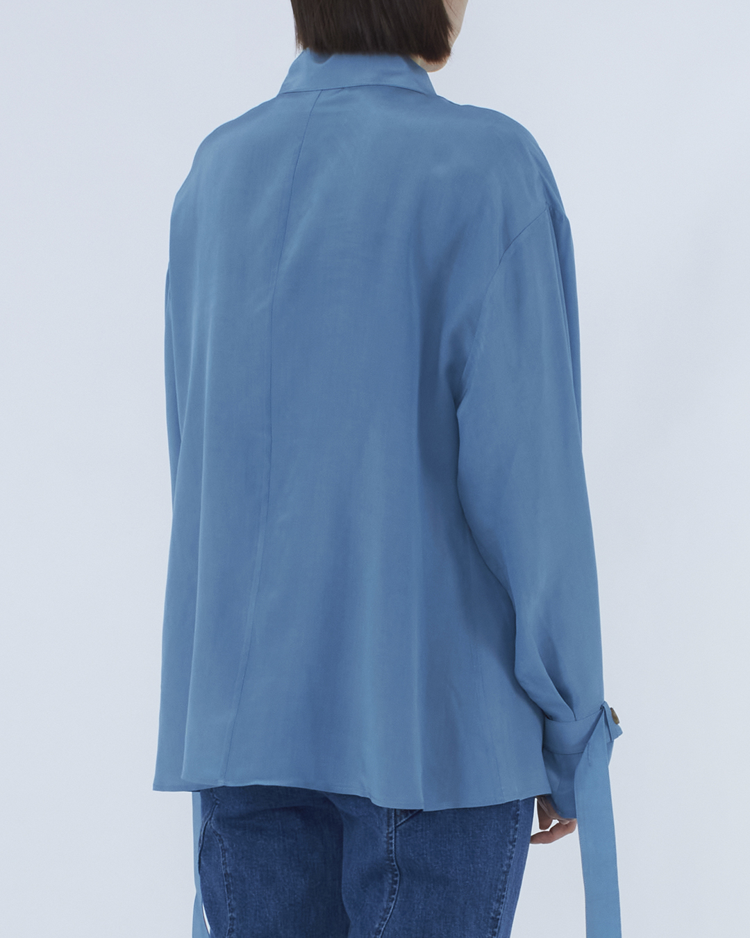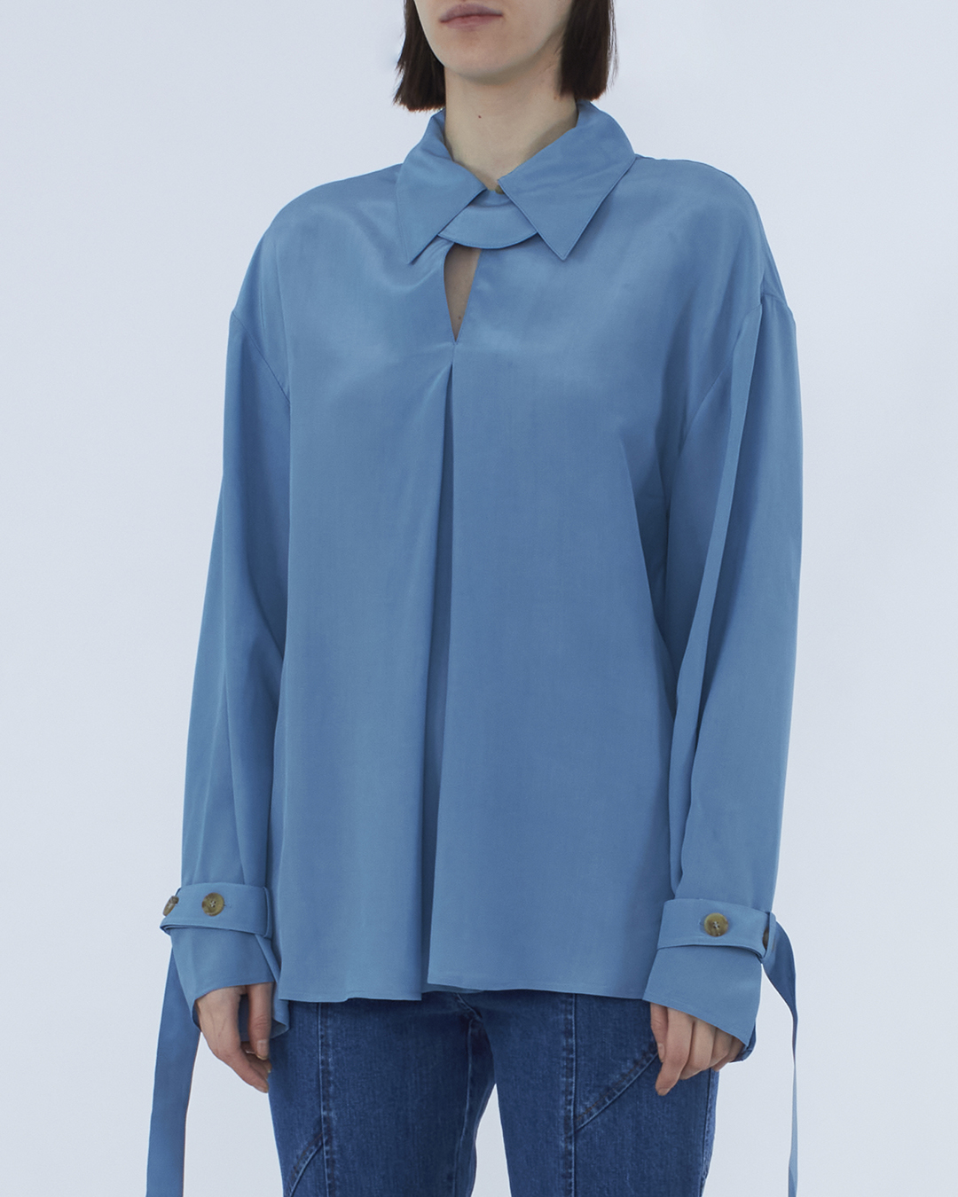 Блуза Rejina Pyo выполнена из матовой вискозы голубого оттенка. Модель свободного расслабленного кроя со встречной складкой. Блуза со спущенной линией плеч и широкими рукавами с отделкой хлястиками из основного материала.