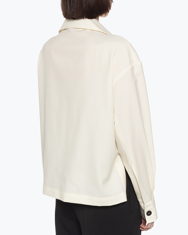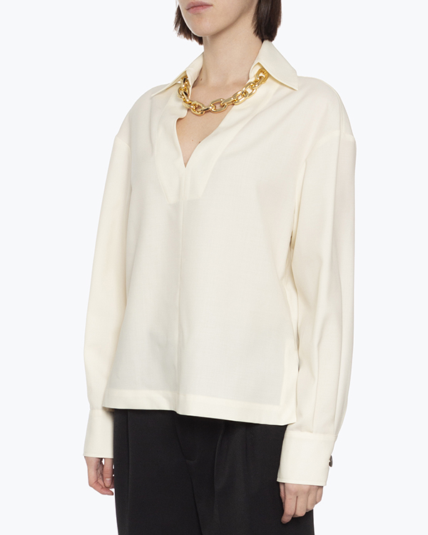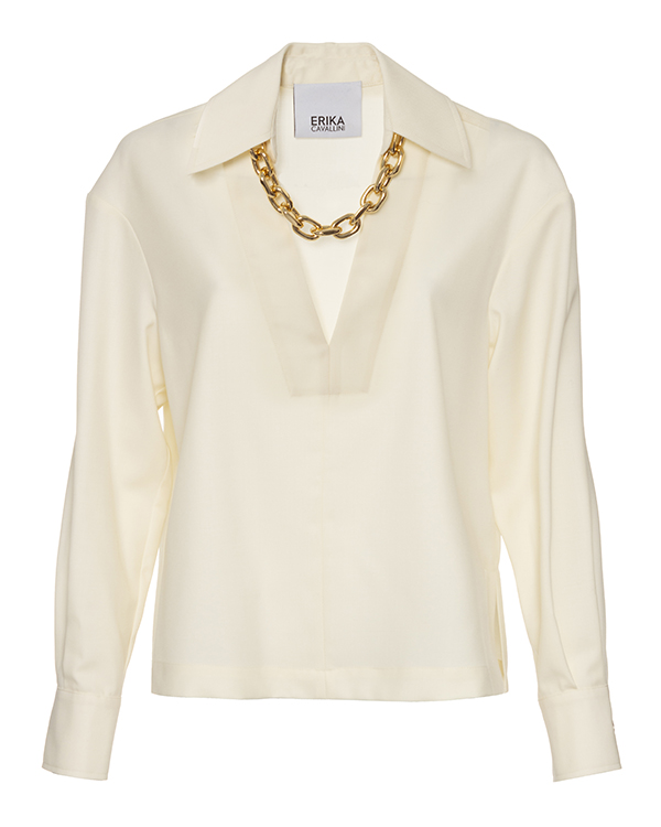 Блуза Erika Cavallini выполнена из тонкой мягкой шерсти бежевого оттенка. Непринужденный прямой крой дополнен спущенной линией плеч и длинными рукавами с манжетами. V-образный вырез подчеркнут отложным воротником и украшен металлической цепочкой с покрытием золотого оттенка.