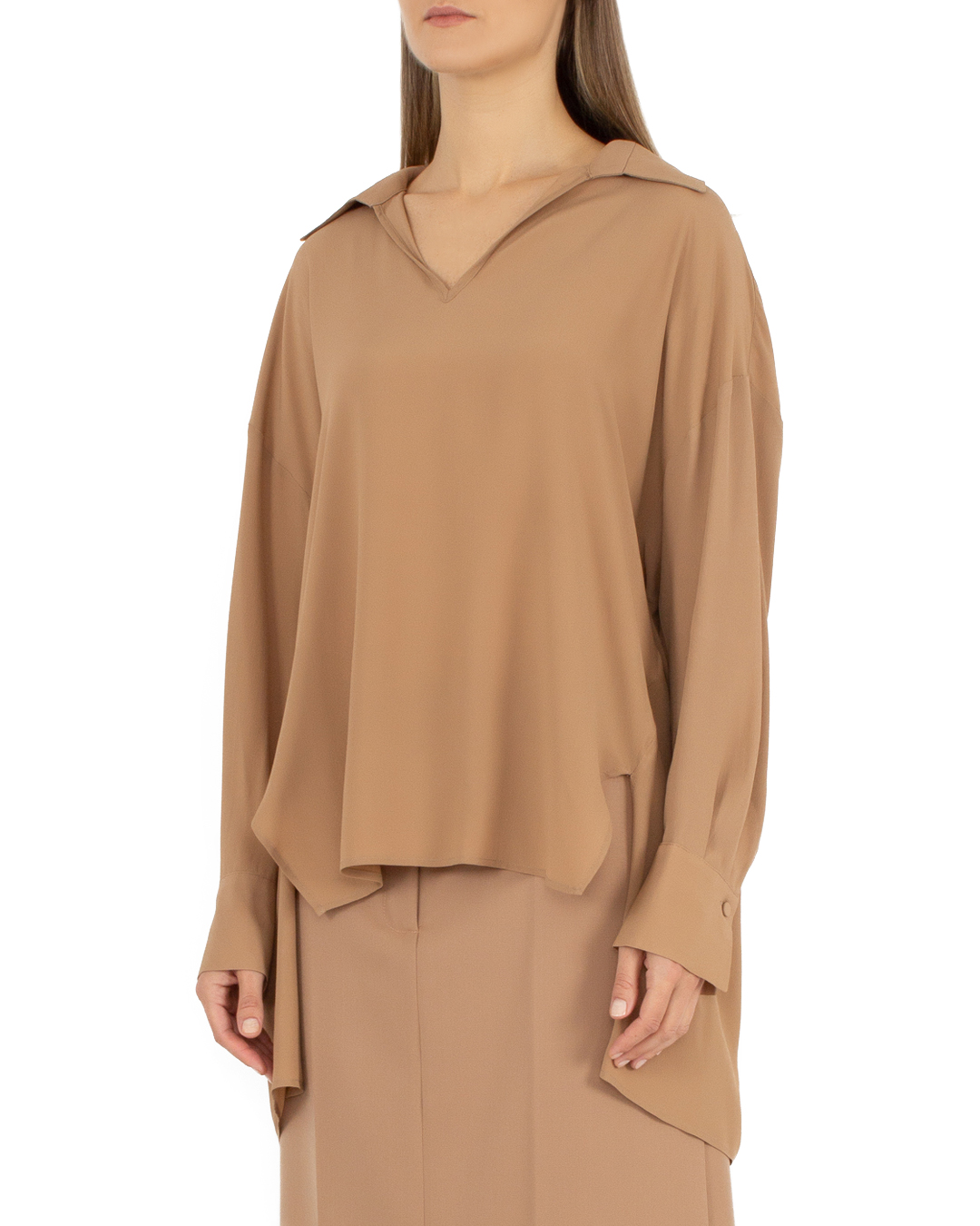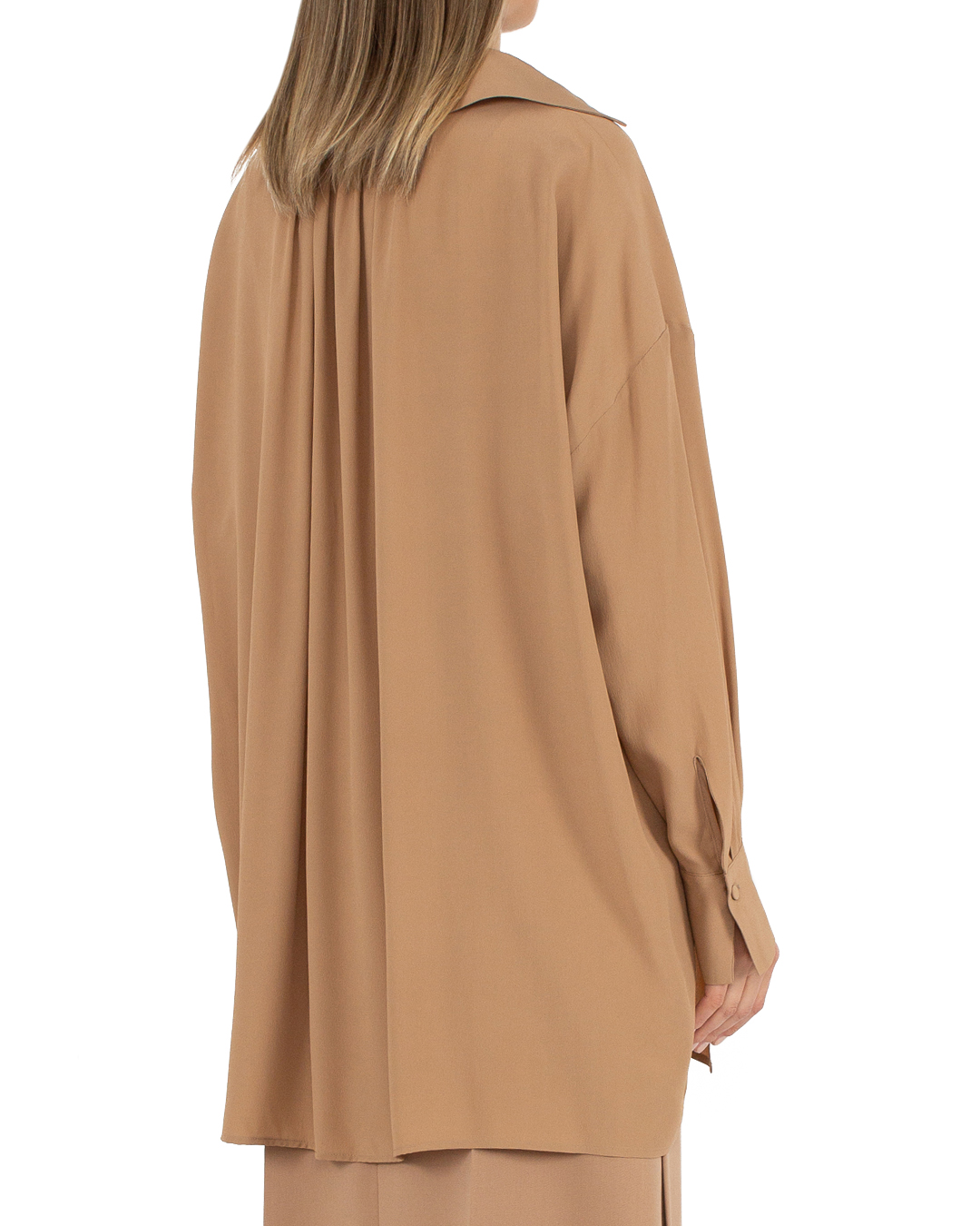 Блуза Erika Cavallini из жатого смесового материала с добавлением шелка. Прямой свободный силуэт дополнен удлиненной линией спины со складками.