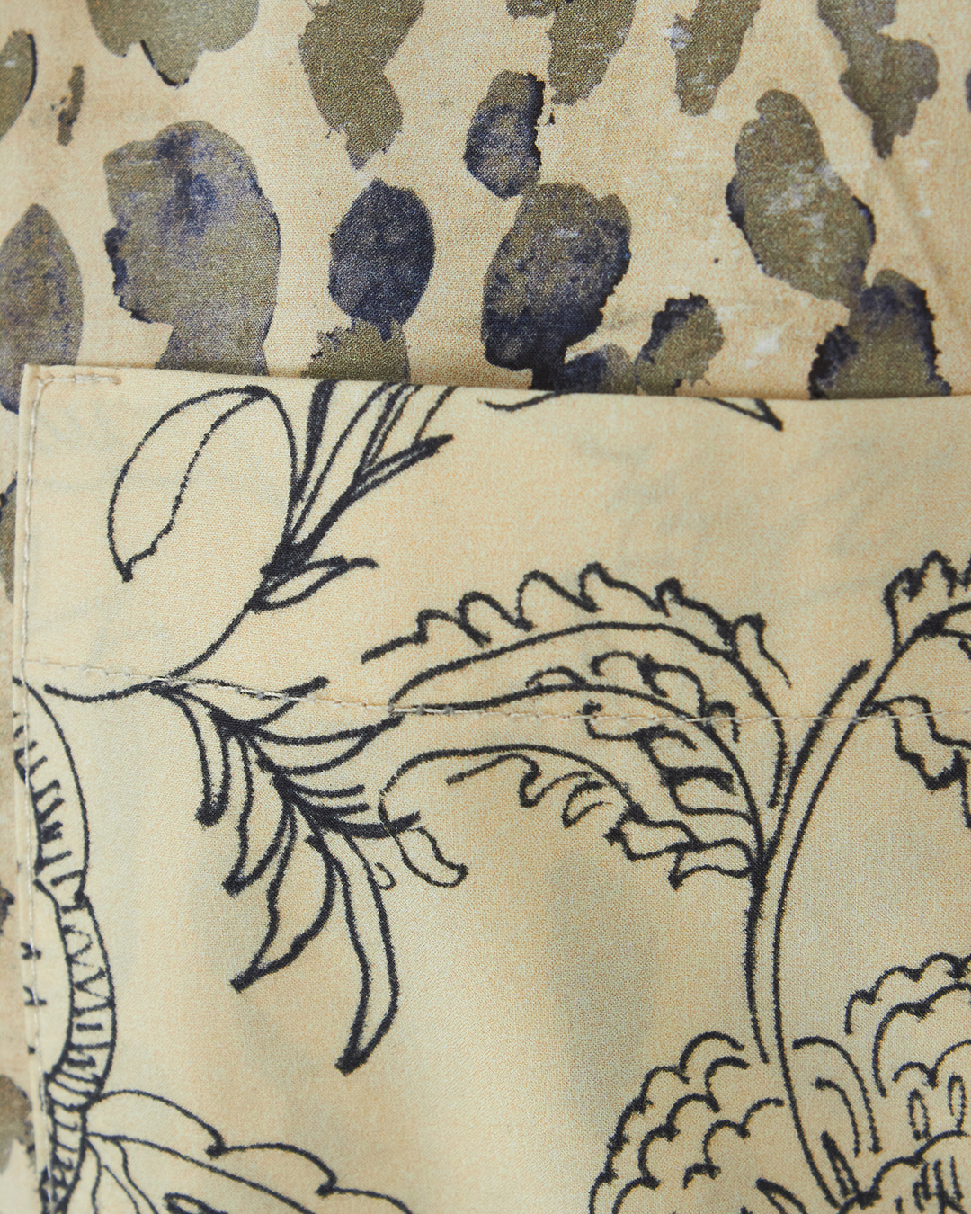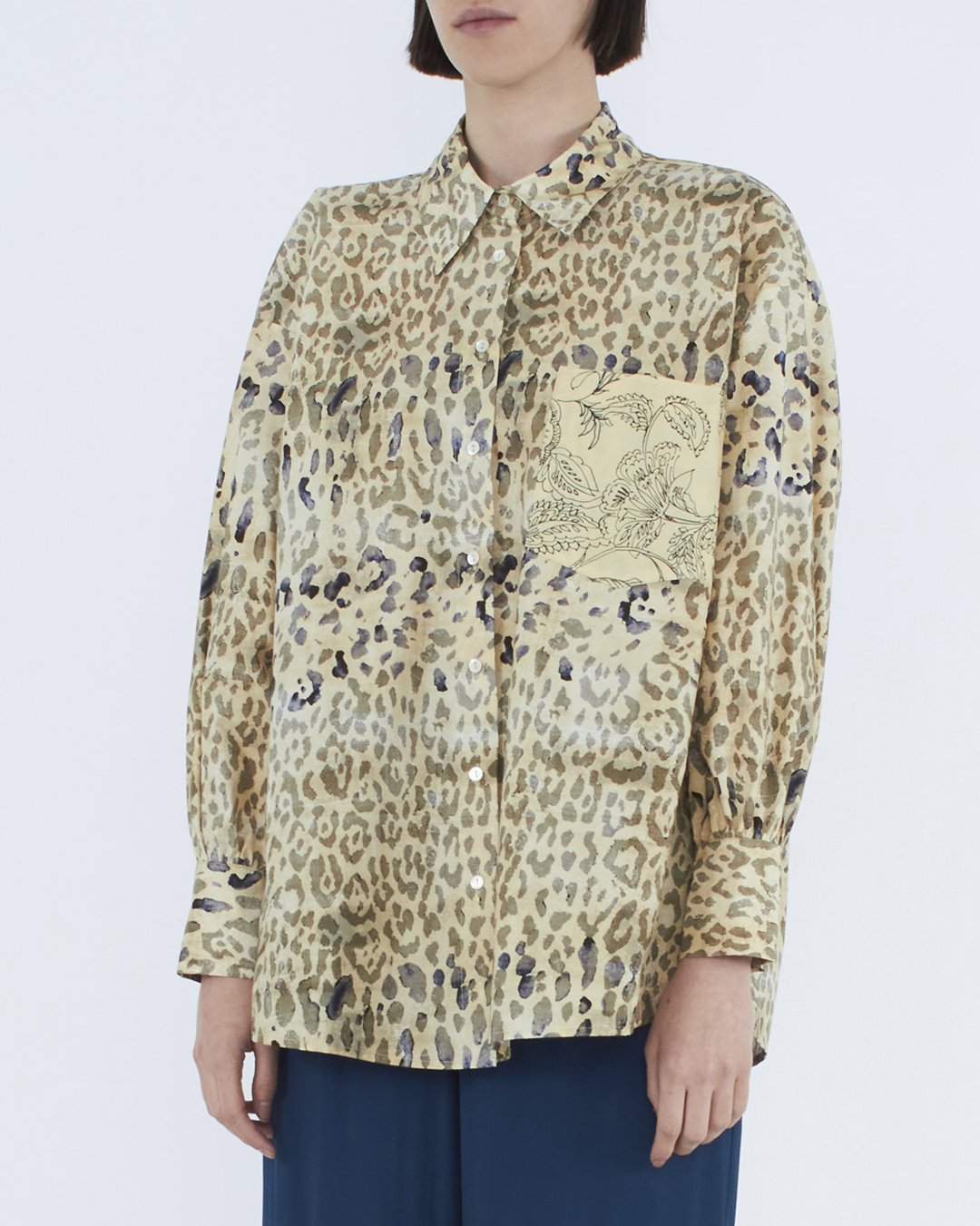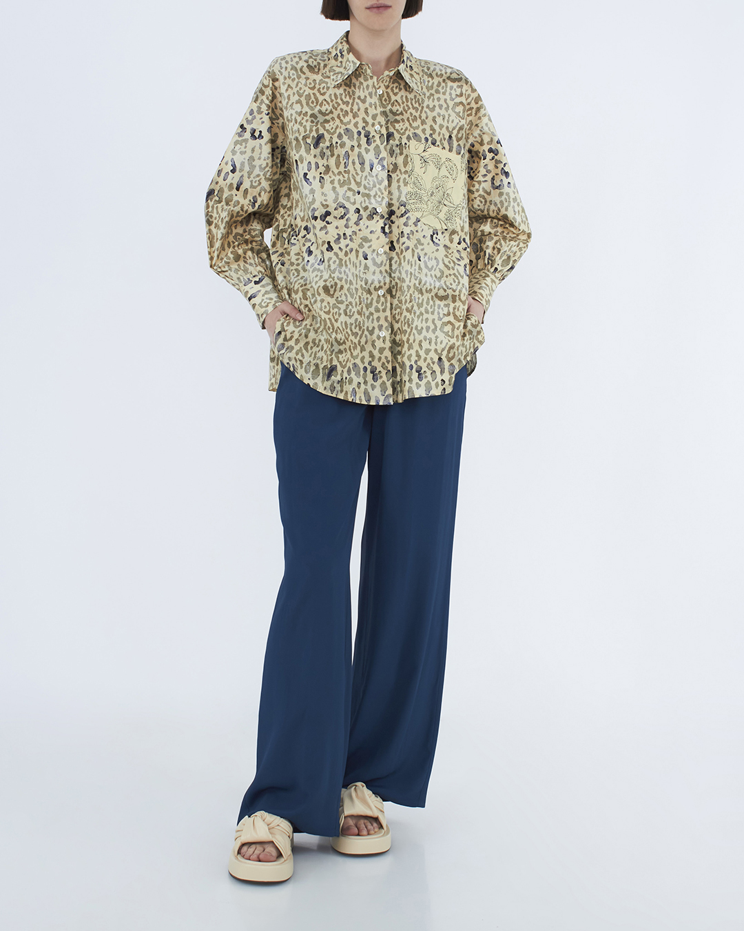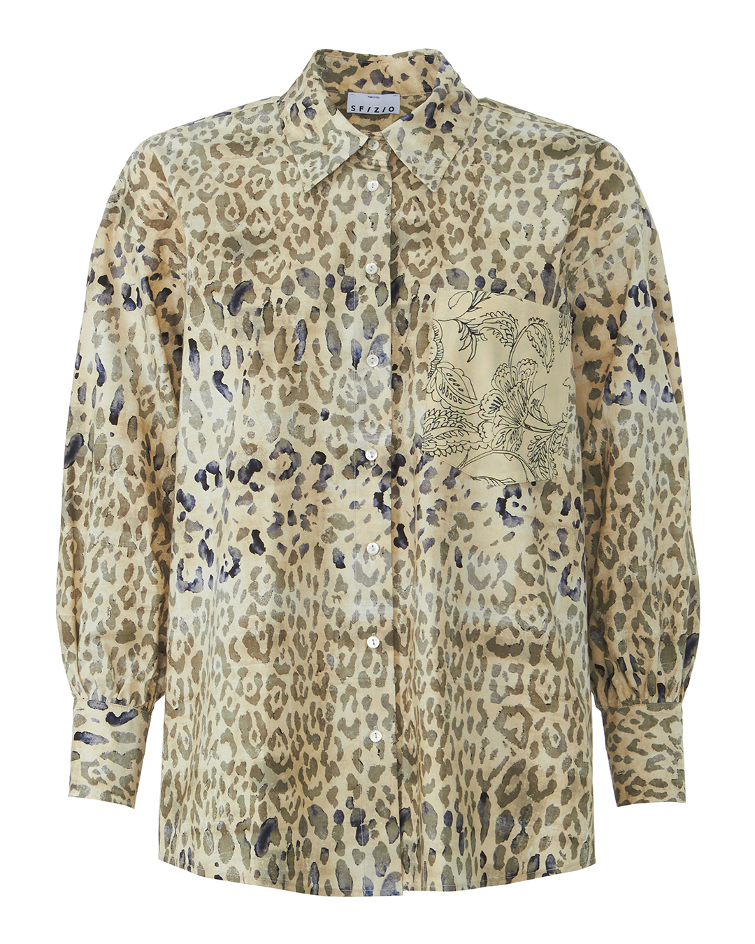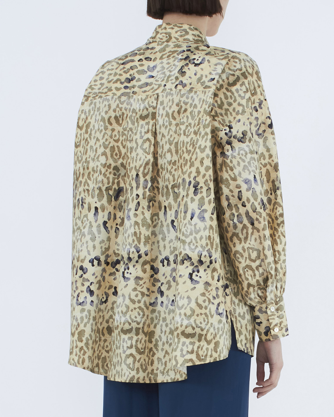 Блуза Sfizio из новой коллекции сезона весна-лето SS’22 сшита из тонкого хлопка с анималистичным принтом. Модель прямого свободного силуэта с застежкой на пуговицы и спущенной линией плеч с длинными рукавами.