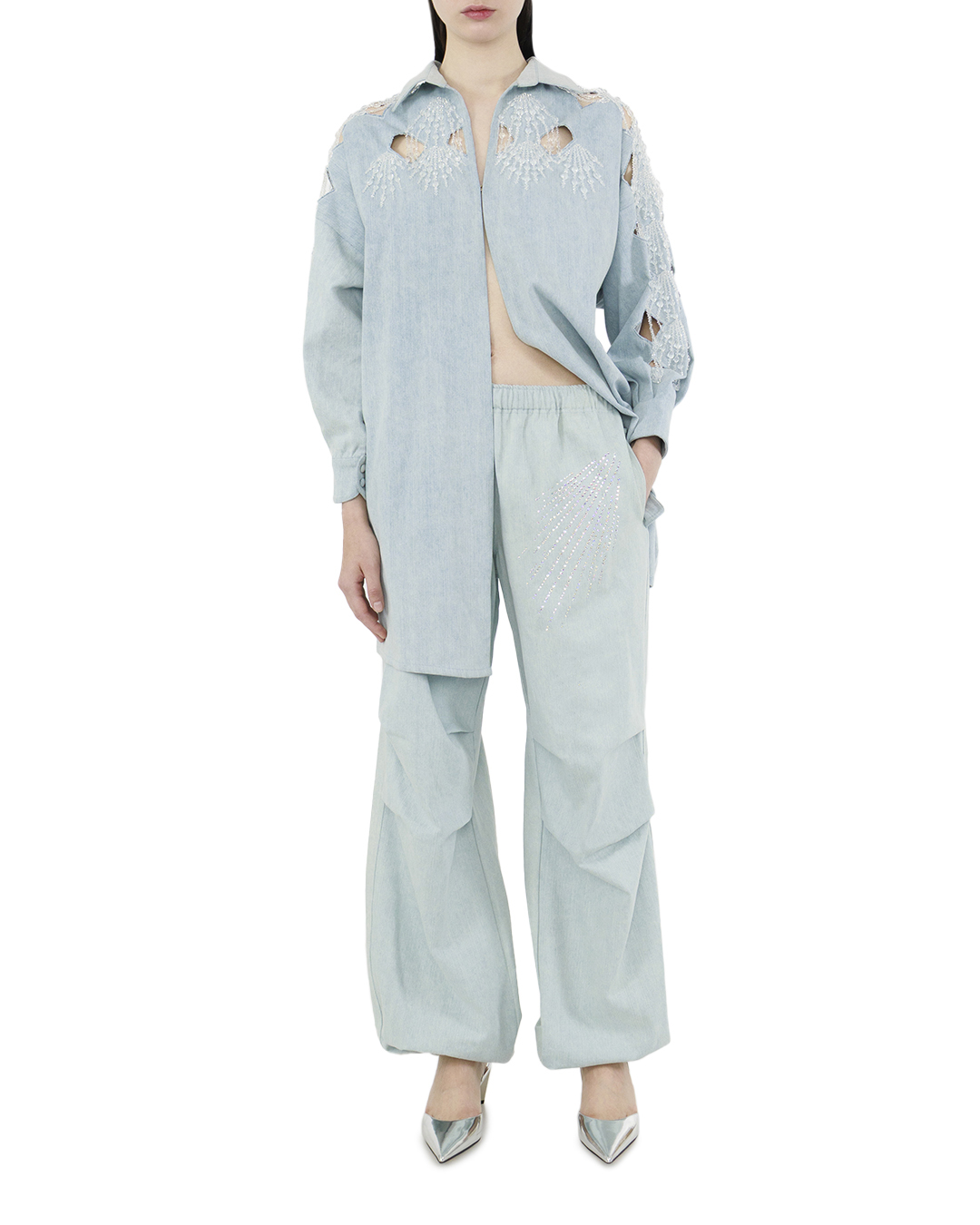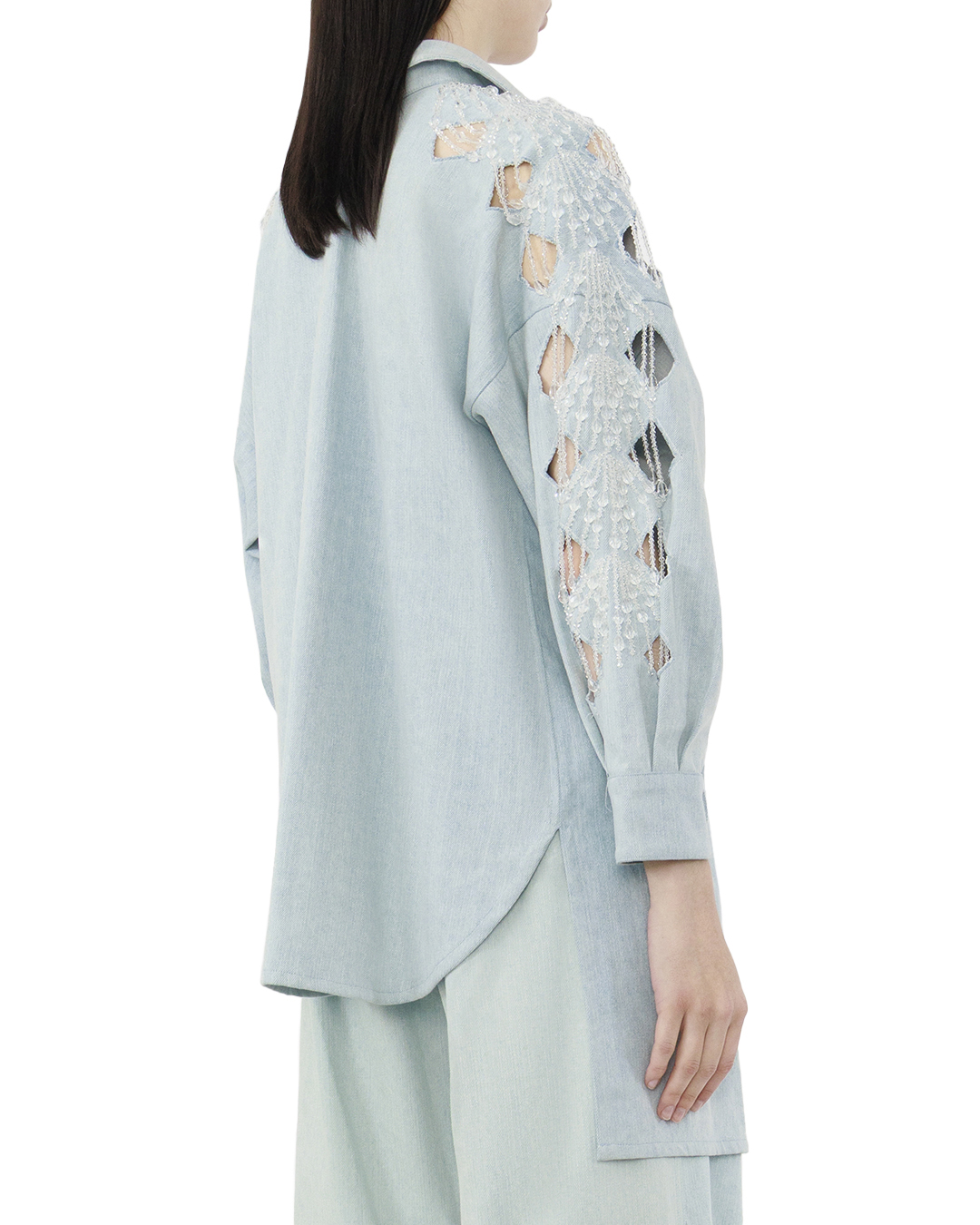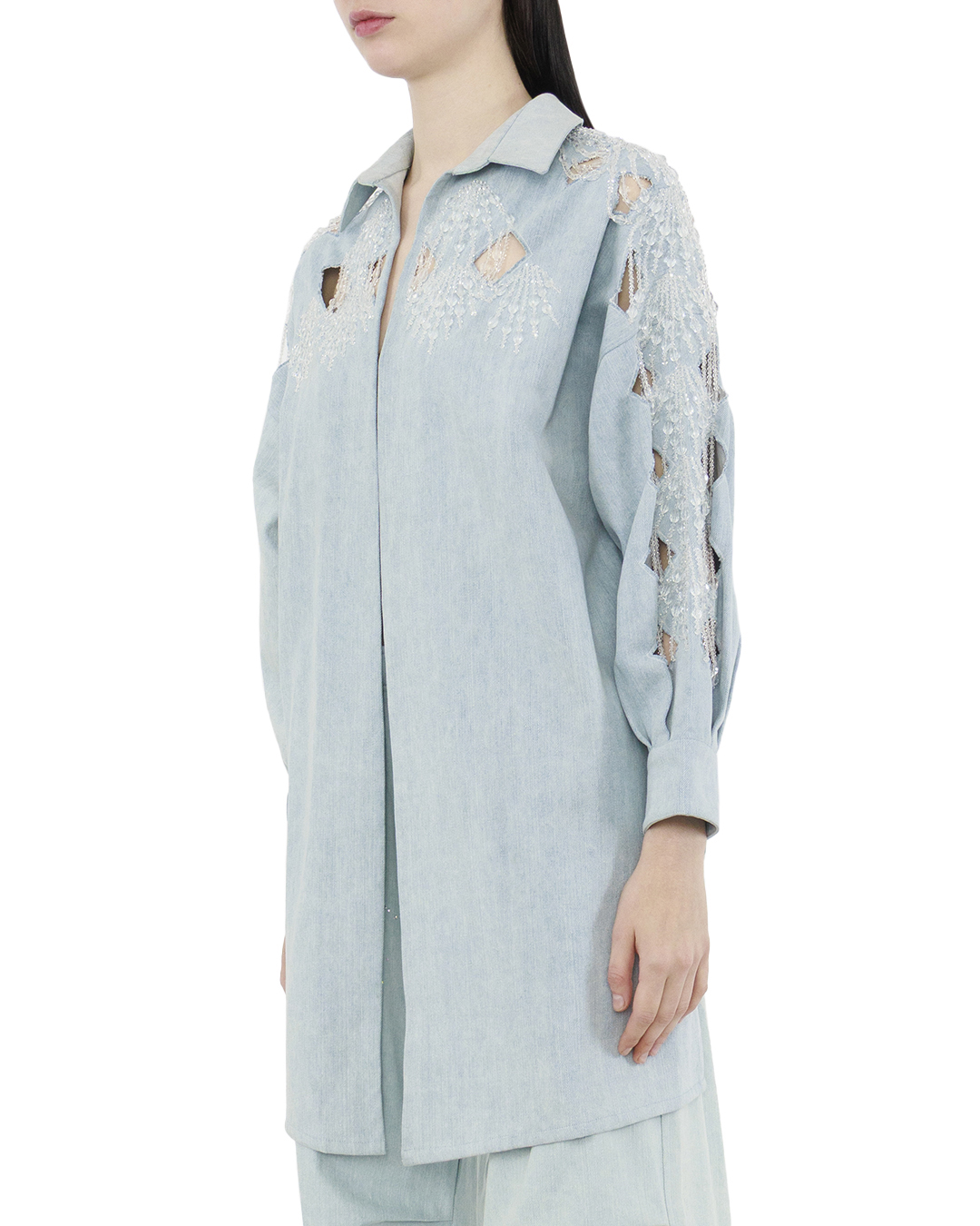 Эта рубашка — сочетание нежного шика и современной изысканности. Выполненная в изысканном светло-голубом оттенке, она придаёт образу свежести и лёгкости. Свободный крой обеспечивает комфорт и непринужденность, придавая образу расслабленную элегантность. Эта модель идеально подходит для создания модного многослойного наряда. Главной изюминкой рубашки являются вышивка и ажурные вырезы, которые расположены по плечевой линии и на рукавах. Тонкая вышивка добавляет элемент изысканной утонченности, а вырезы подчёркивают лёгкость и воздушность. Эти детали придают изделию романтическую нотку. Классический воротник и манжеты добавляют строгости, прекрасно контрастируя с декоративными элементами, создавая стильный баланс между формальностью и креативностью. Эта рубашка станет великолепным выбором для тех, кто хочет добавить в повседневный гардероб нотку индивидуальности и креативности, делая каждый ансамбль неповторимым и стильным.