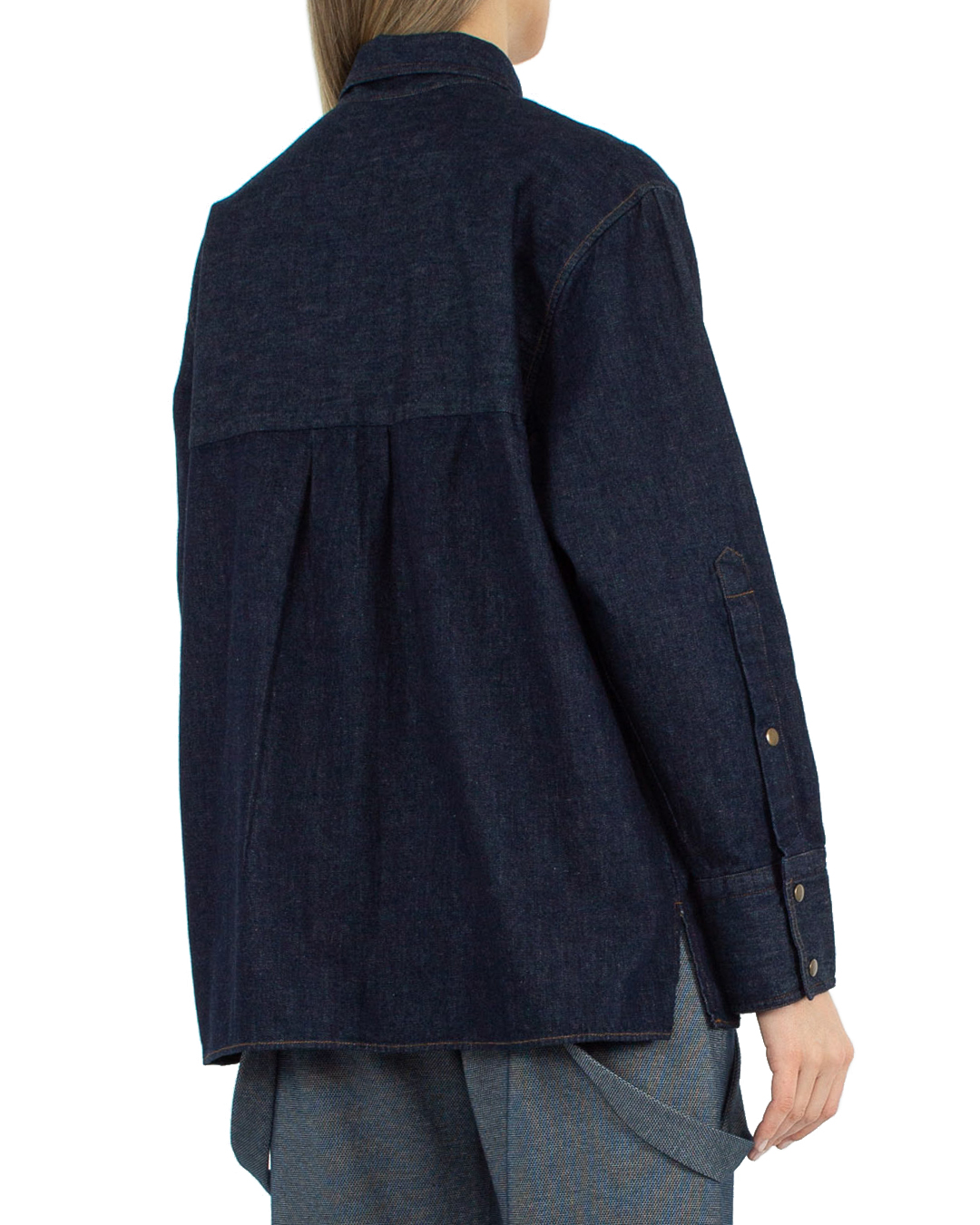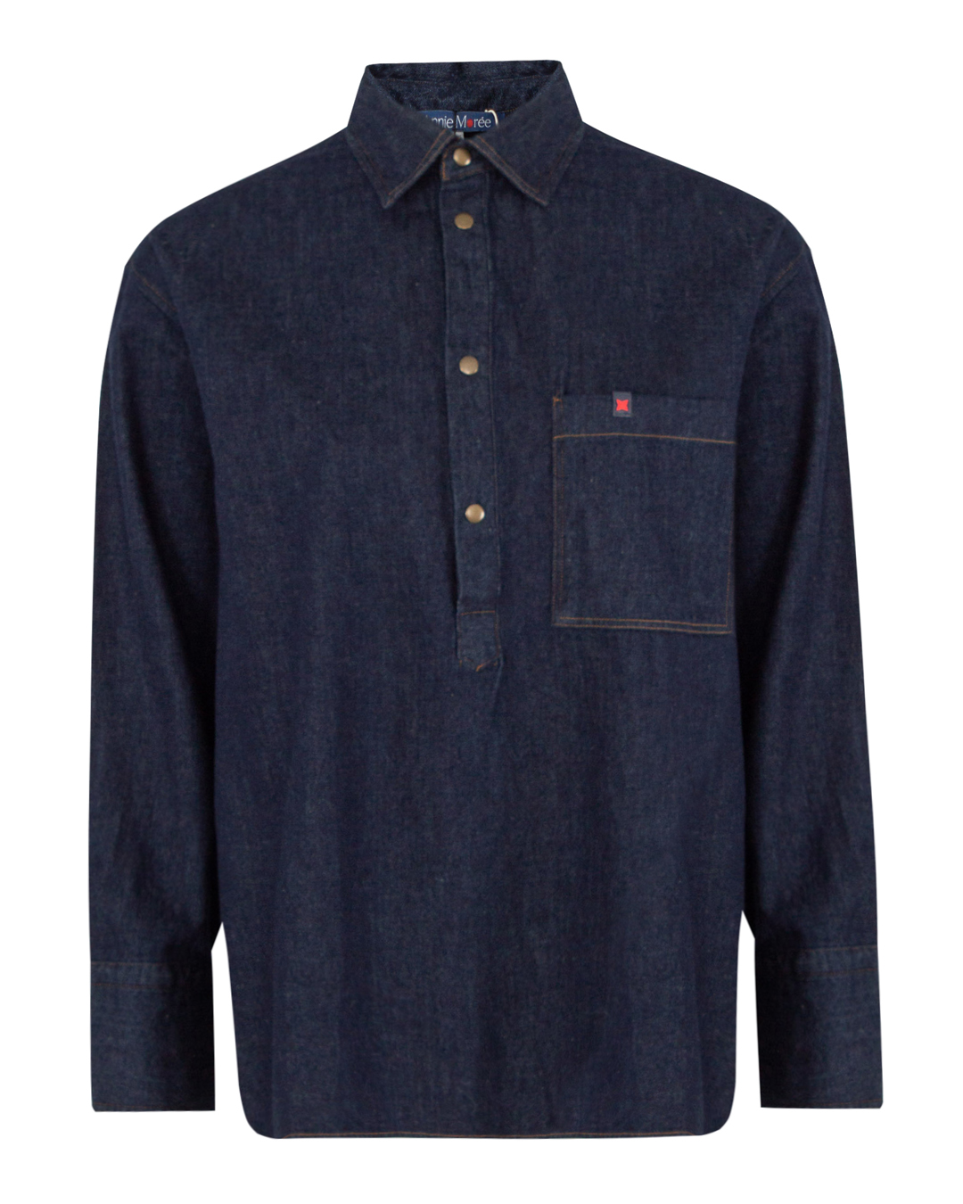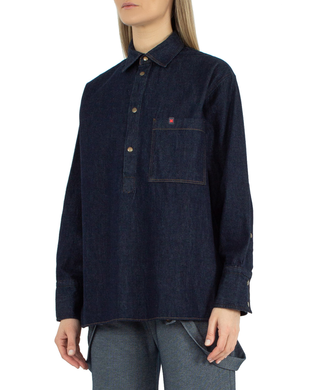 Джинсовая рубашка ANNIE MOREE из хлопкового денима темно-синего оттенка. Модель прямого силуэта с застежкой на кнопки, отложным воротником и нагрудным карманом.