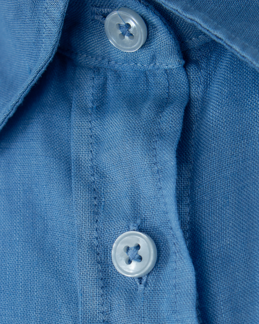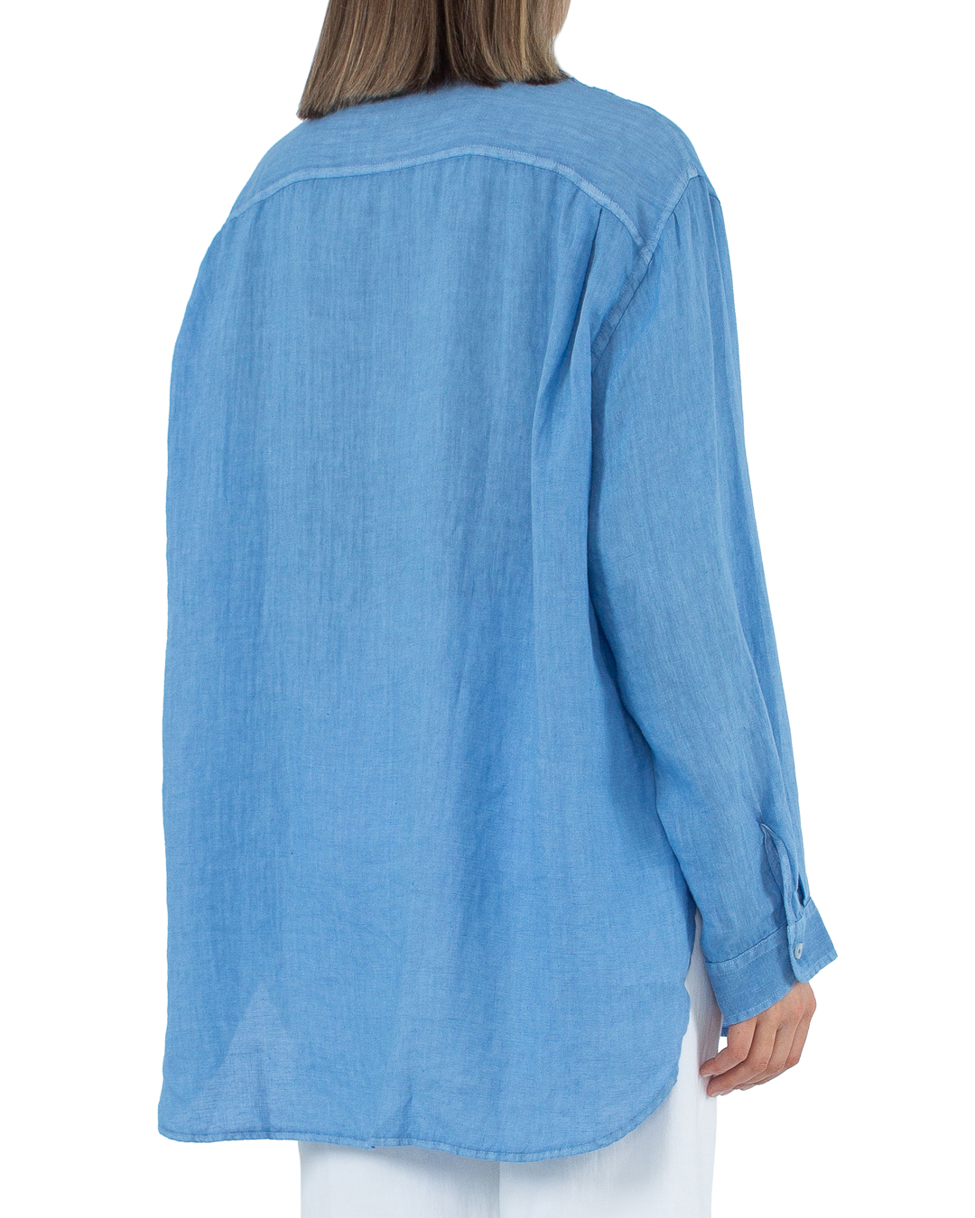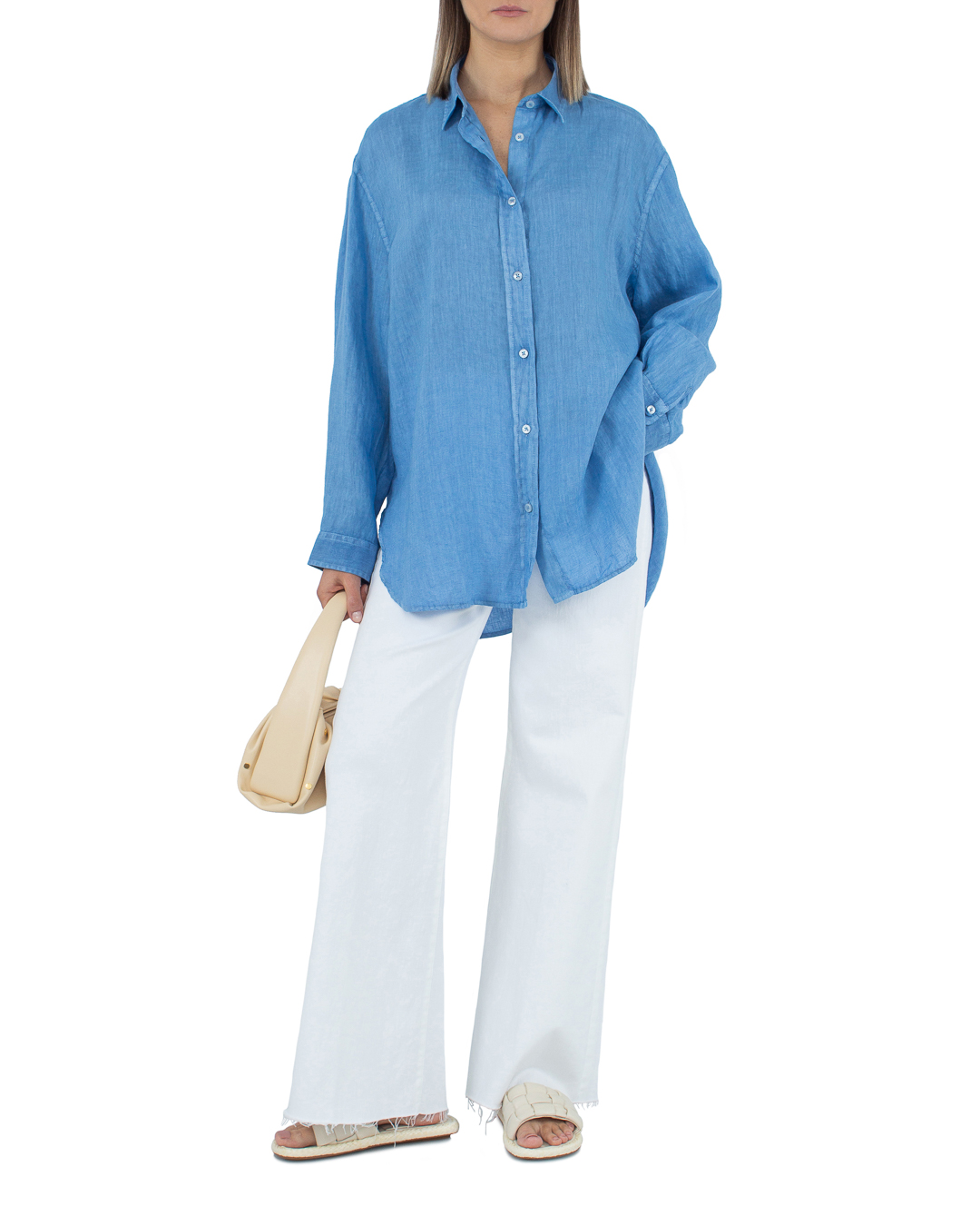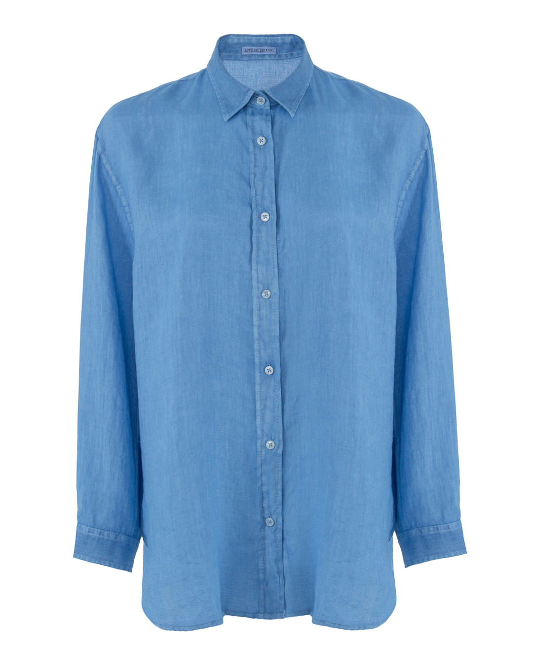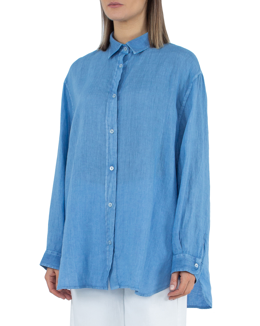Рубашка свободного силуэта сшита из натурального льна. Непринужденный крой дополнен застежкой на пуговицы, длинными рукавами и спущенной линией плеч. Модель с закругленной удлиненной линией спины.