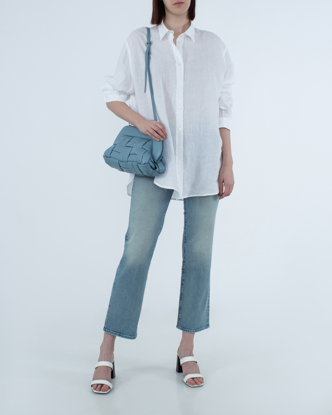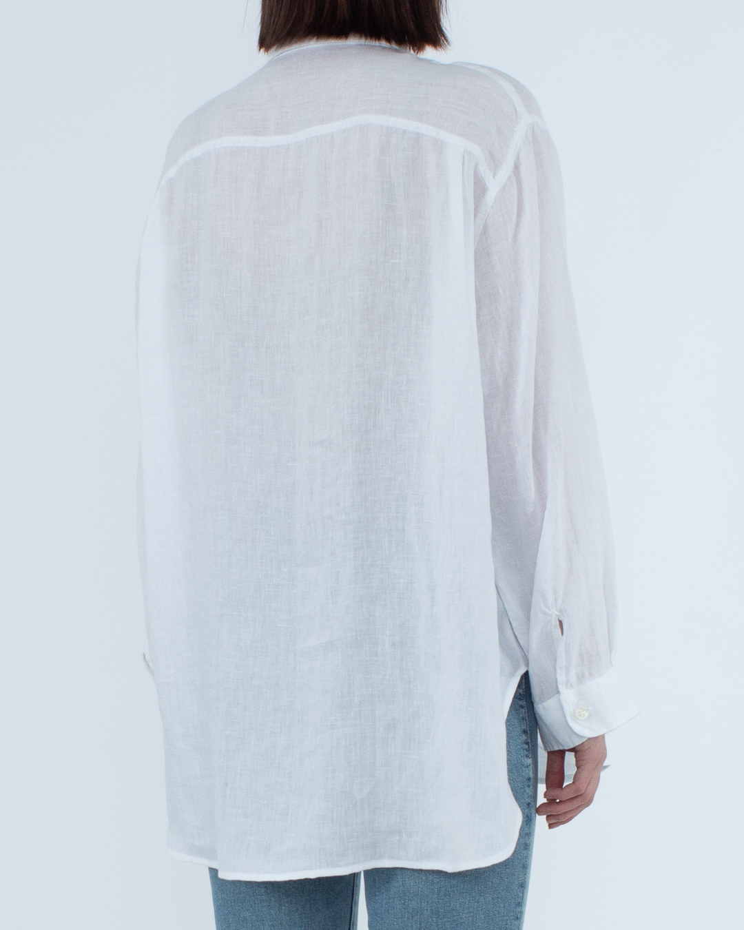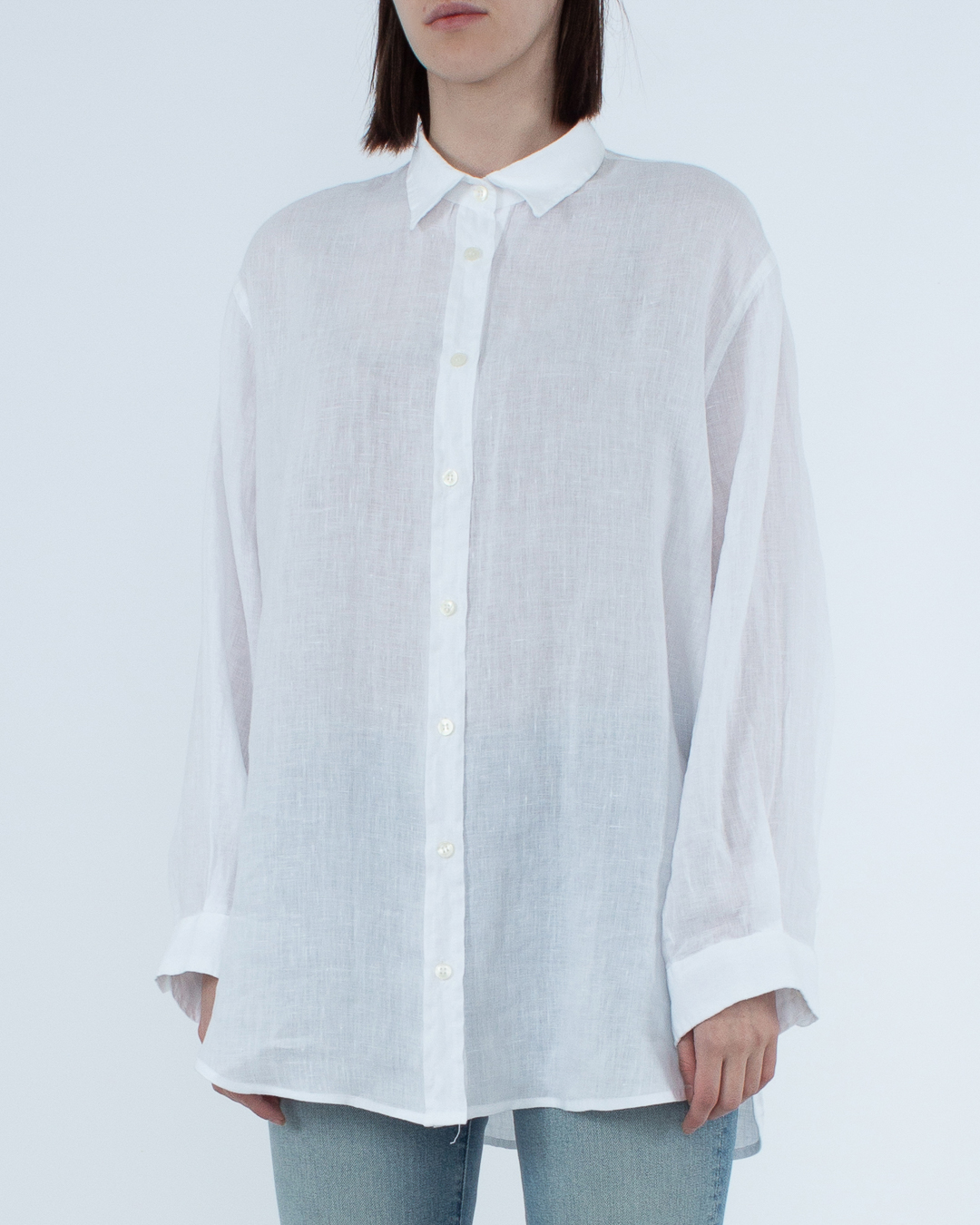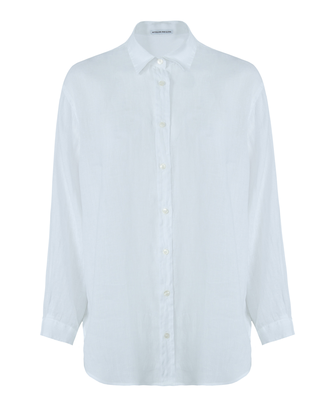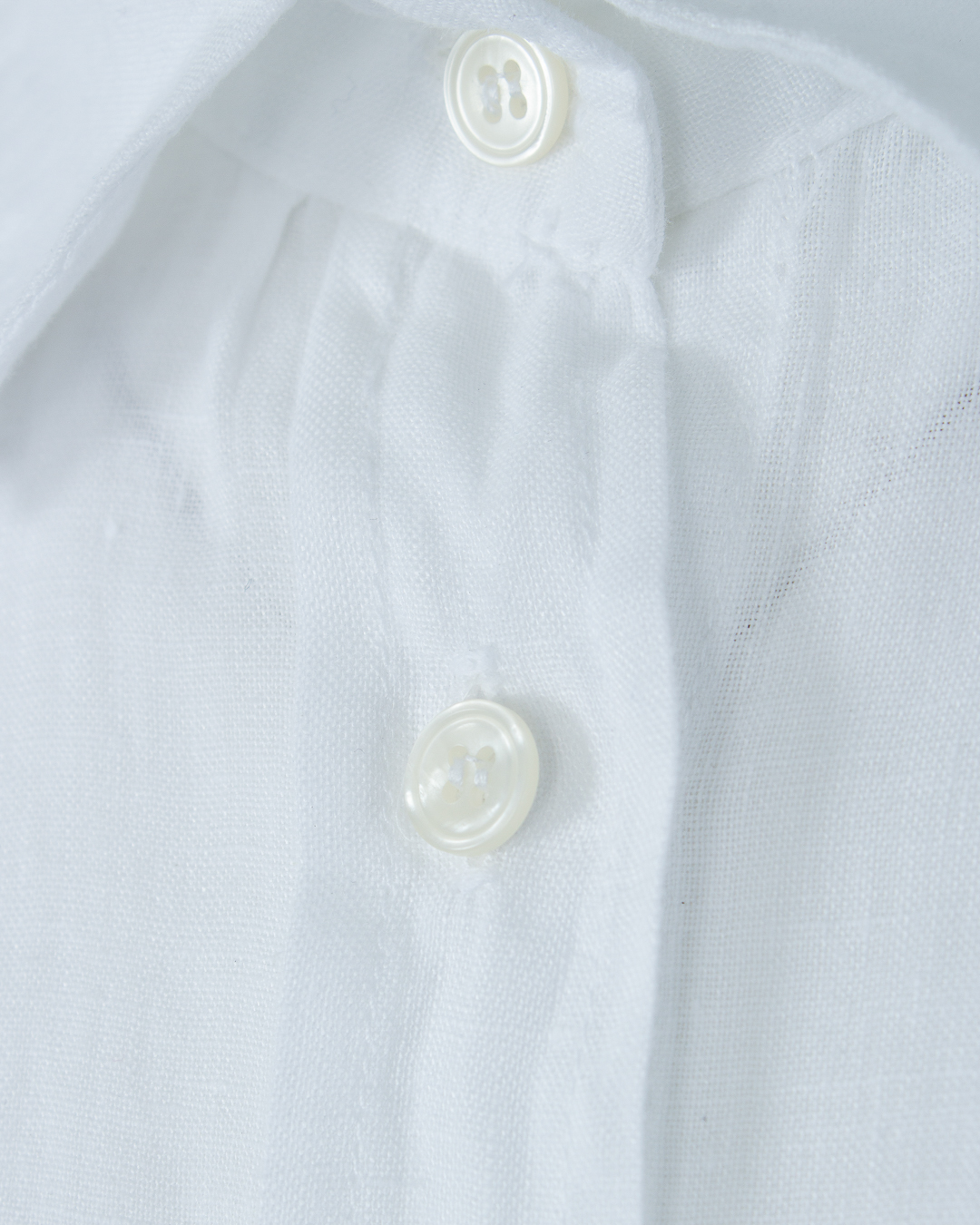 Рубашка сшита из тонкого льна. Удлиненное изделие свободного силуэта с застежкой на пуговицы дополнена отложным воротником и закругленной линией низа. Рубашка со спущенной линией плеч и длинными рукавами.