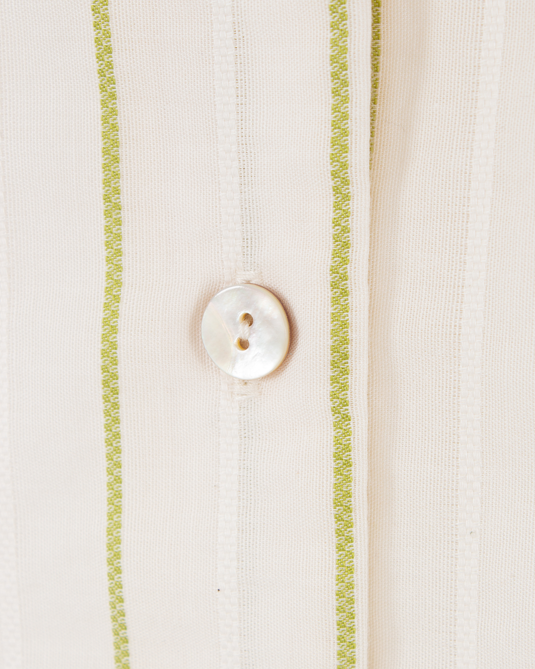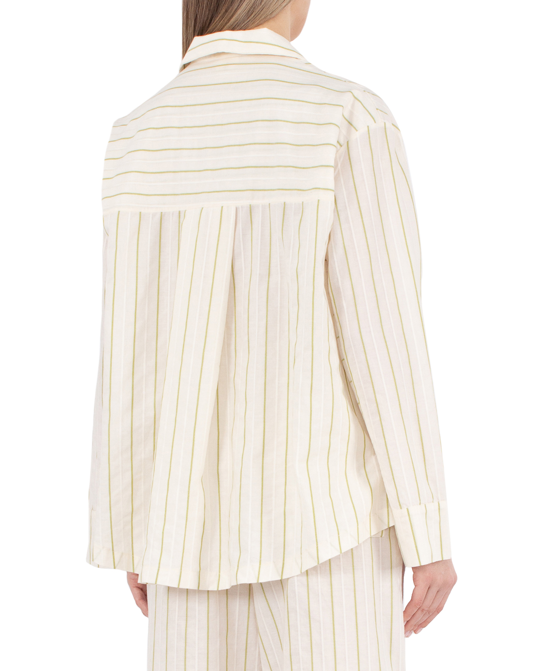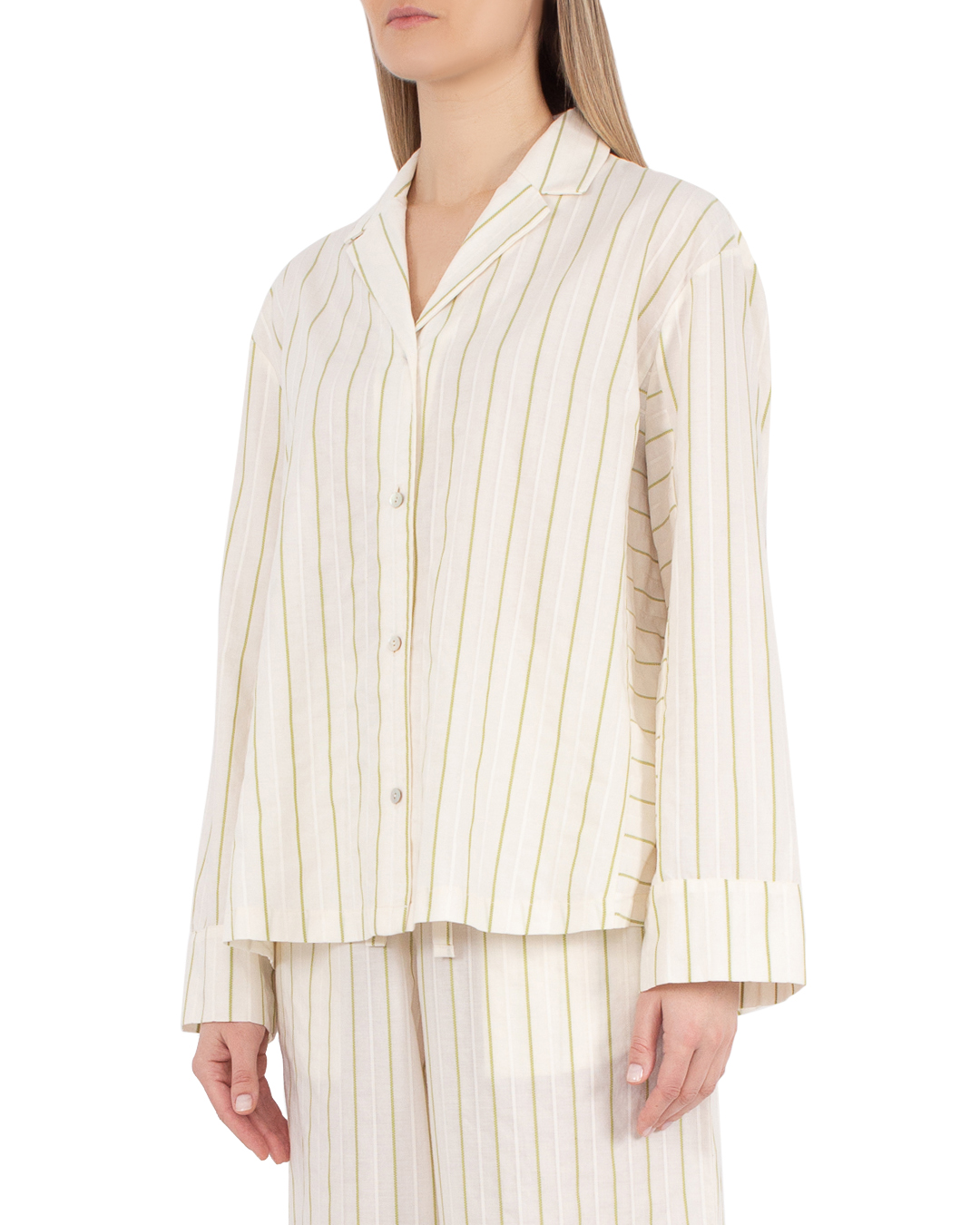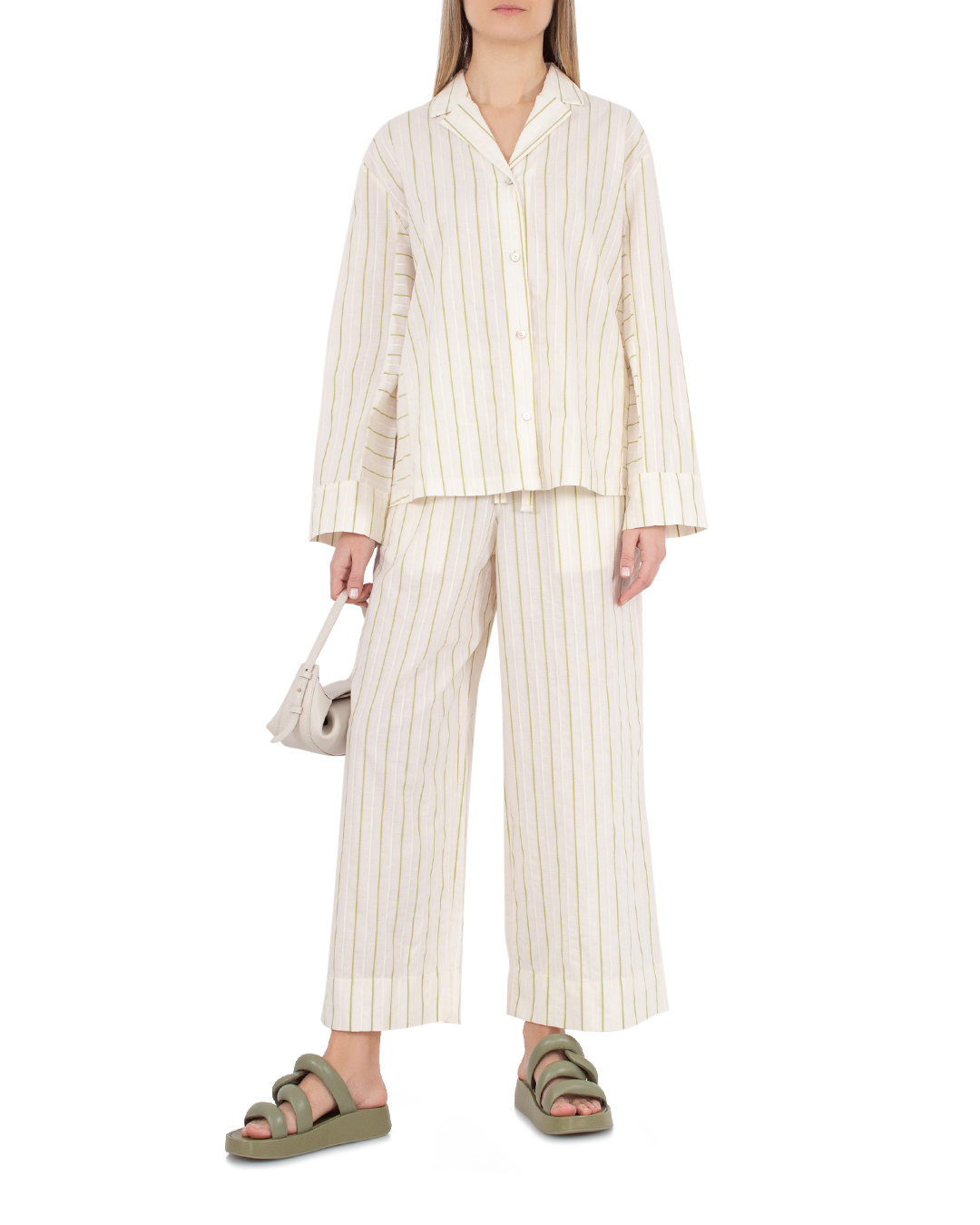 Рубашка ANTELOPE THE LABEL сшита из натурального льна в полоску. Модель в пижамном стиле с застежкой на пуговицы дополнена спущенной линией плечи и закругленной линией низа.