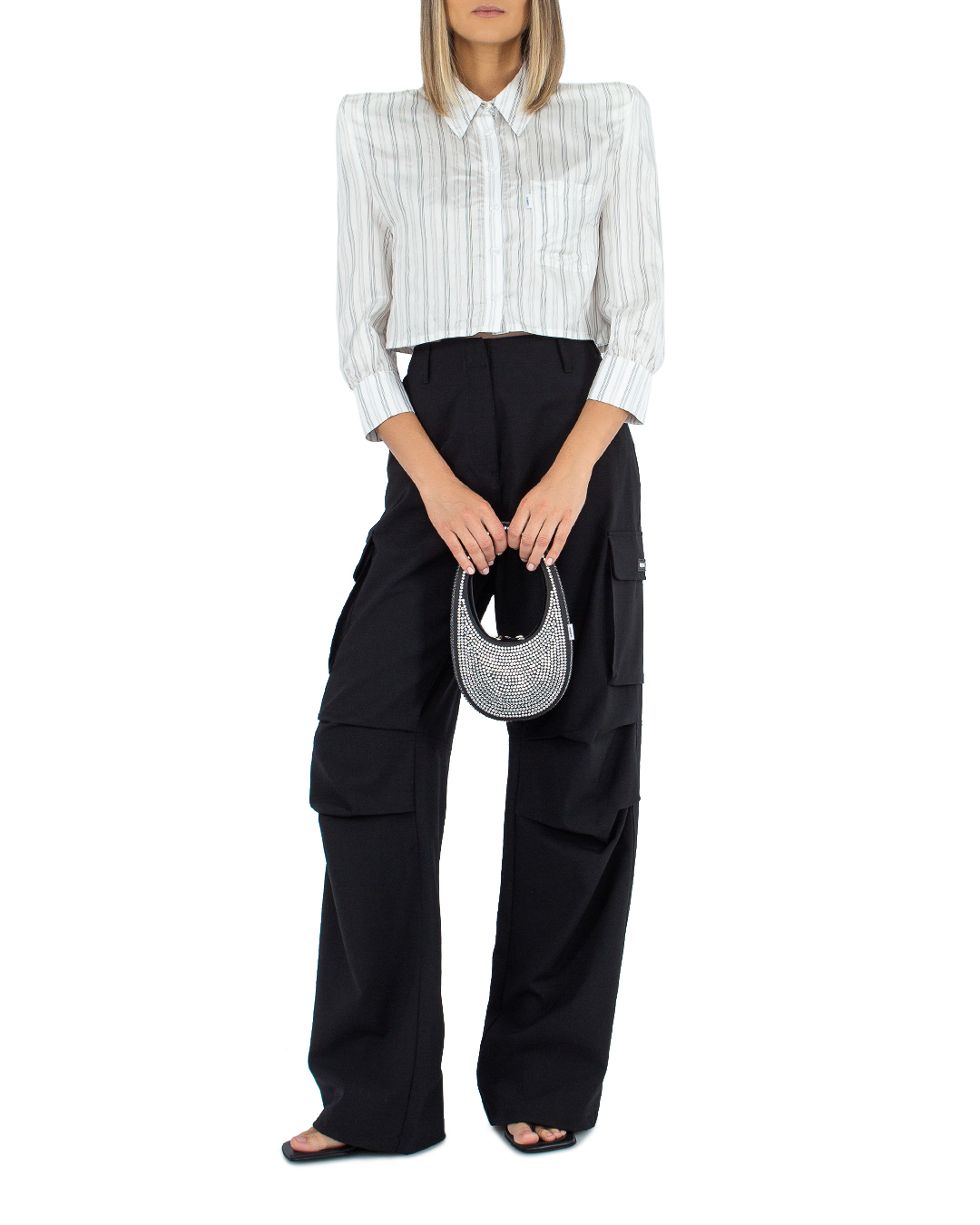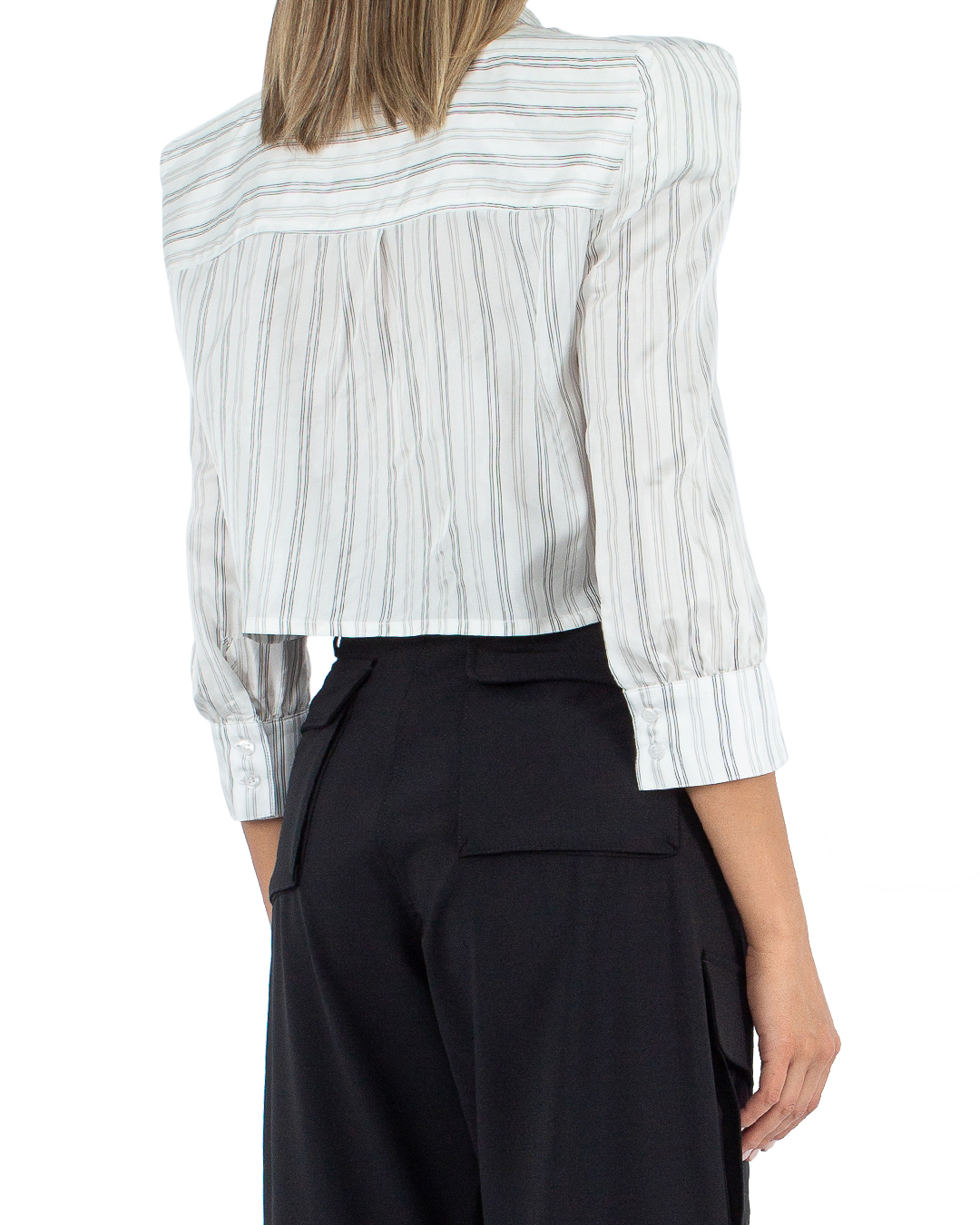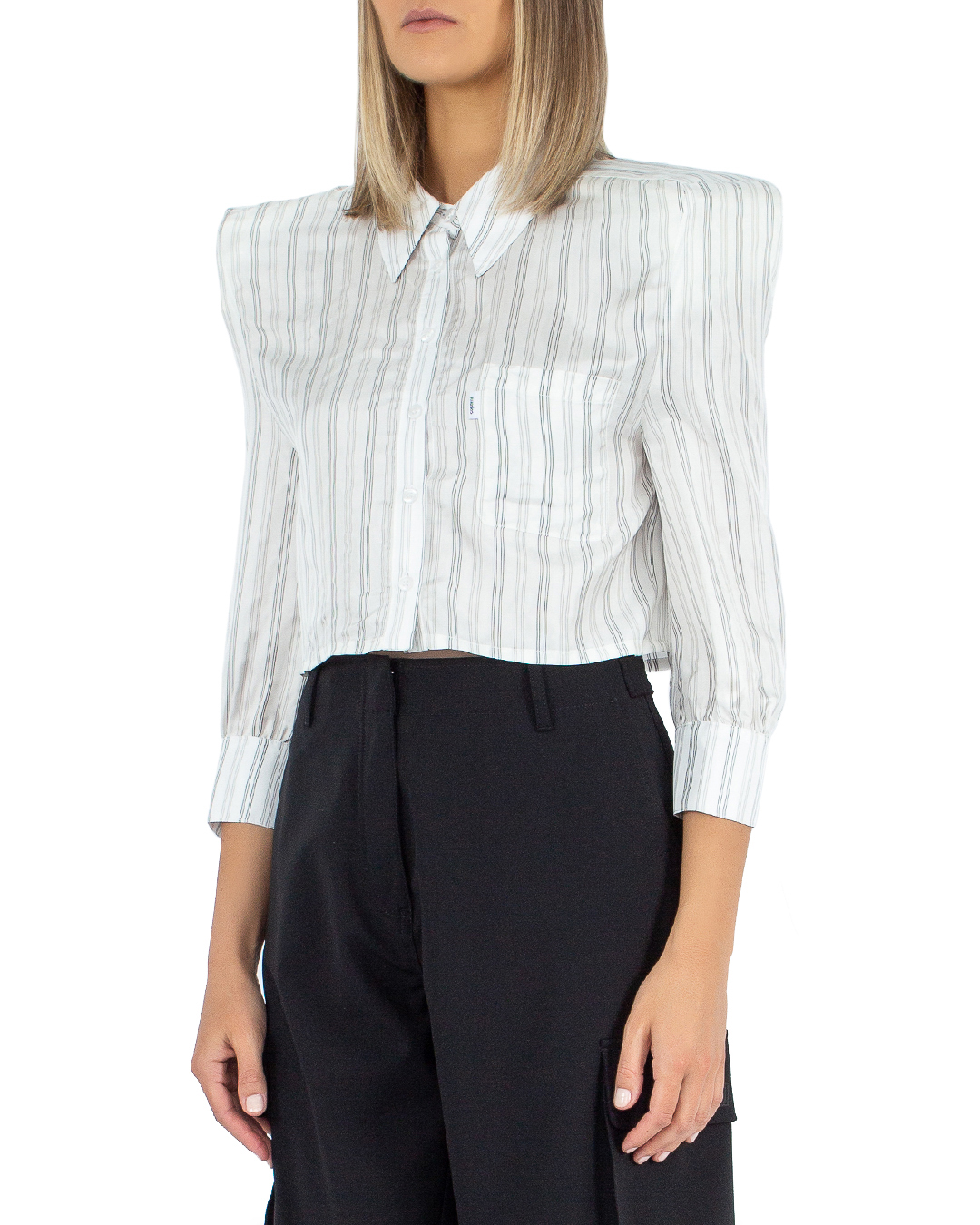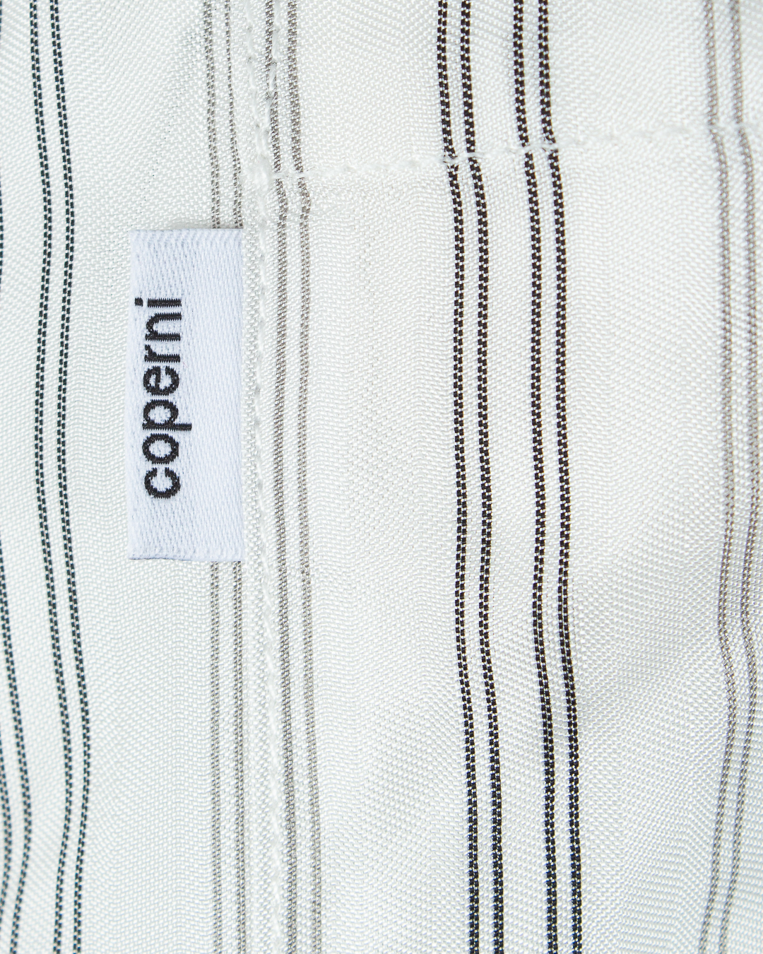Рубашка COPERNI выполнена из вискозы в полоску. Модель прямого укороченного силуэта с застежкой на пуговицы дополнена объемными плечиками и отложным воротником.