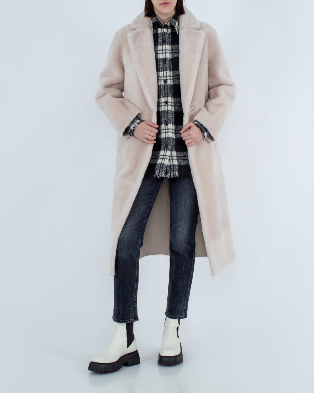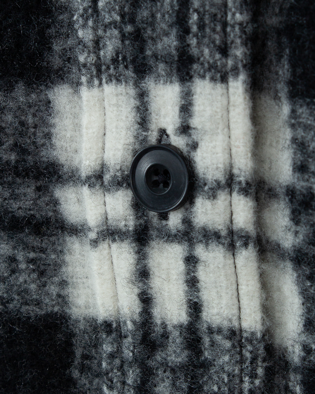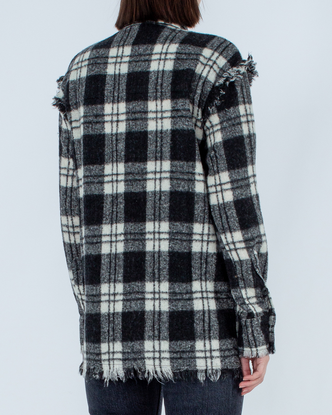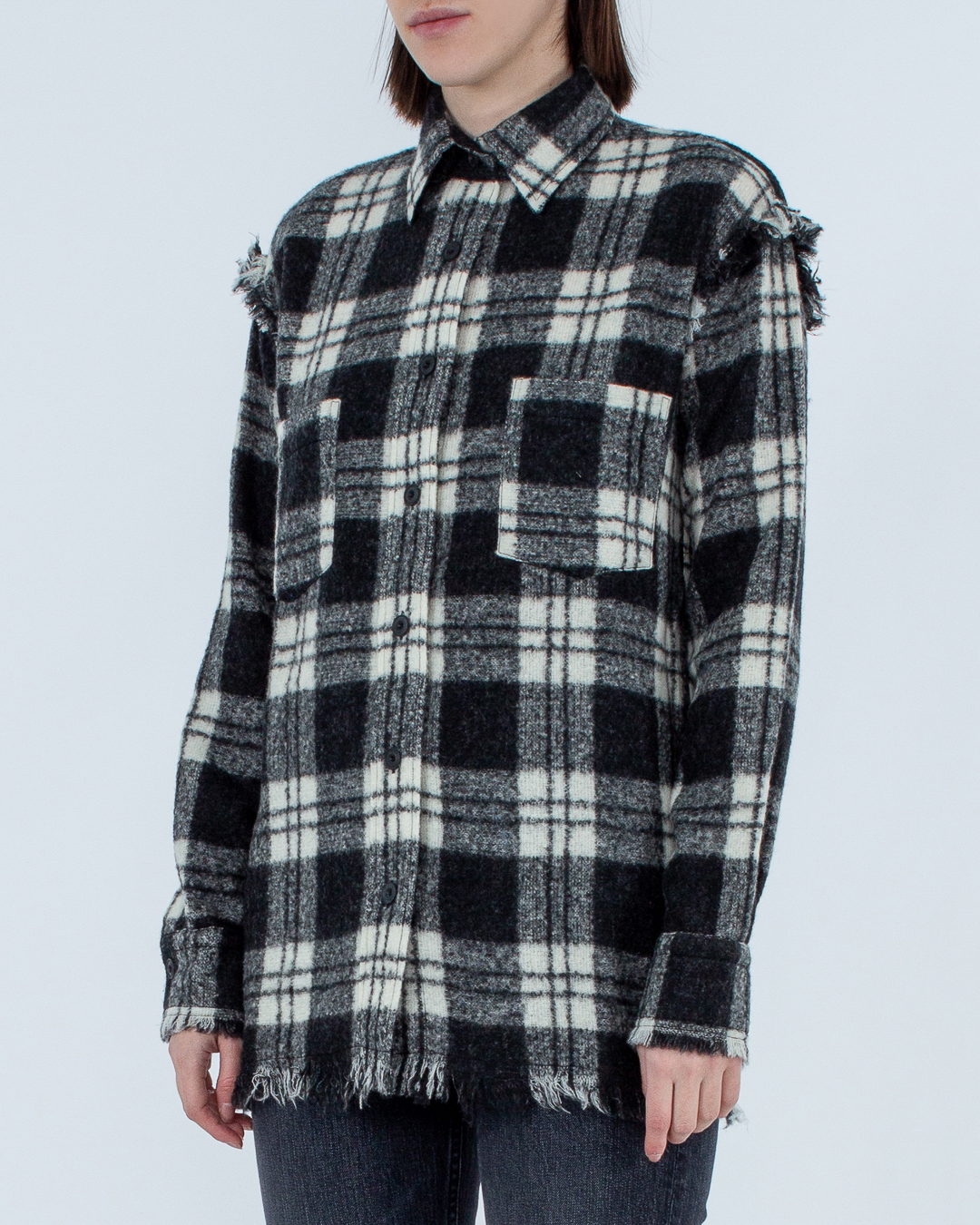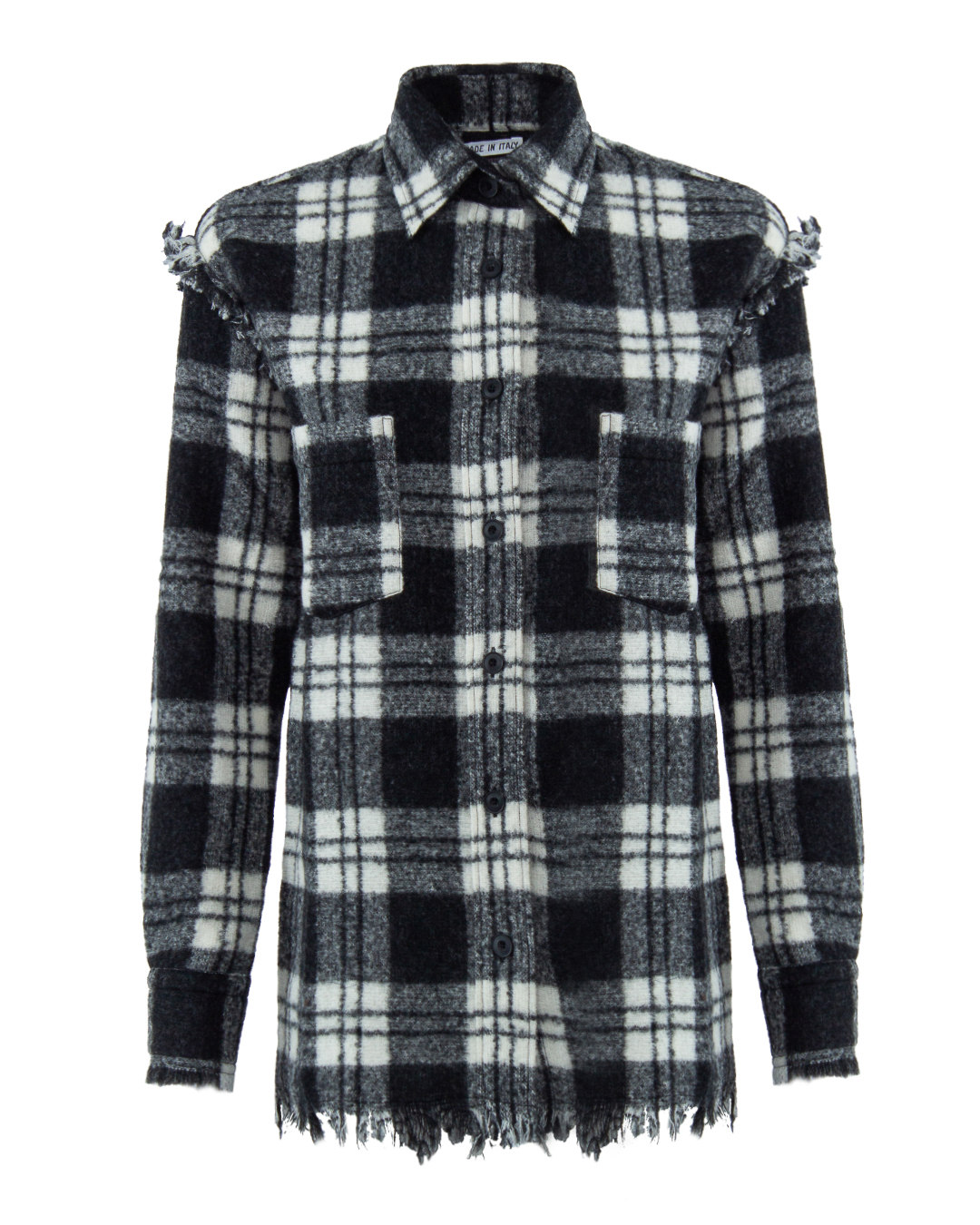 Рубашка из смесовой шерсти с добавлением кашемира и шелка в клетку. Модель прямого силуэта с застежкой на пуговицы и двумя накладными карманами дополнена бахромой.