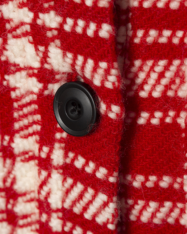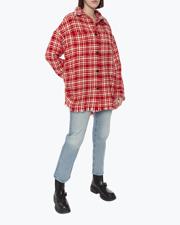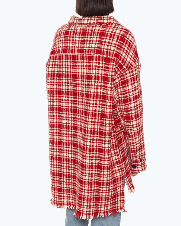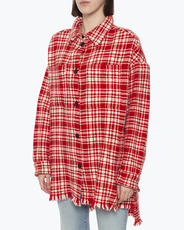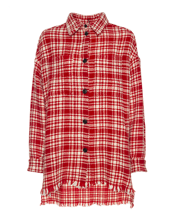 Рубашка из уплотненной шерсти с добавлением кашемира красного оттенка в клетку. Удлиненное изделие прямого свободного силуэта с застежкой на пуговицы дополнено спущенной линией плеч и длинными рукавами. Отложной воротник и необработанная линия низа.