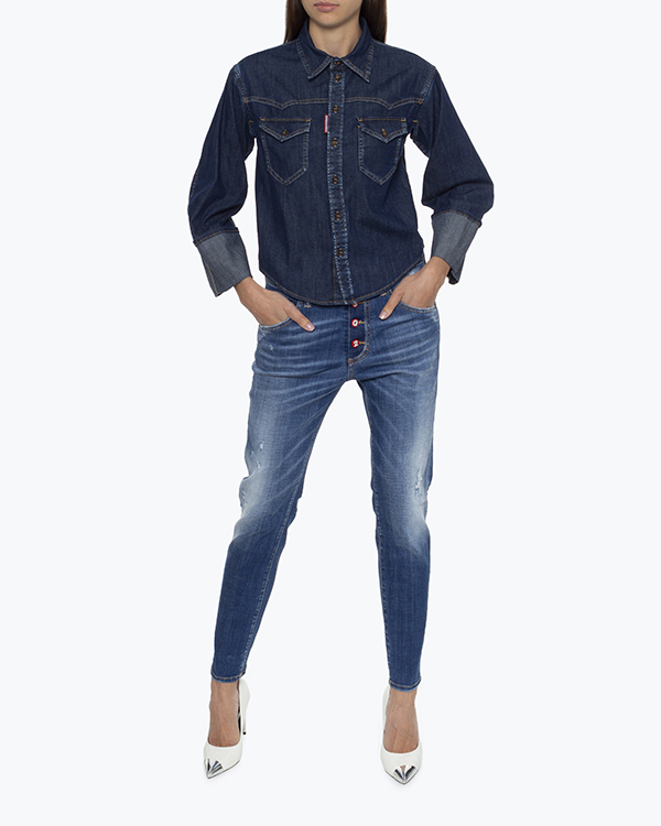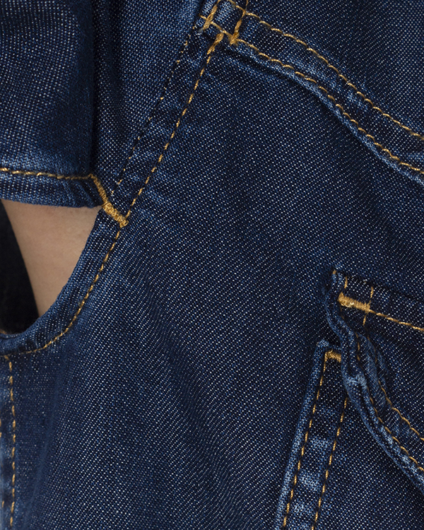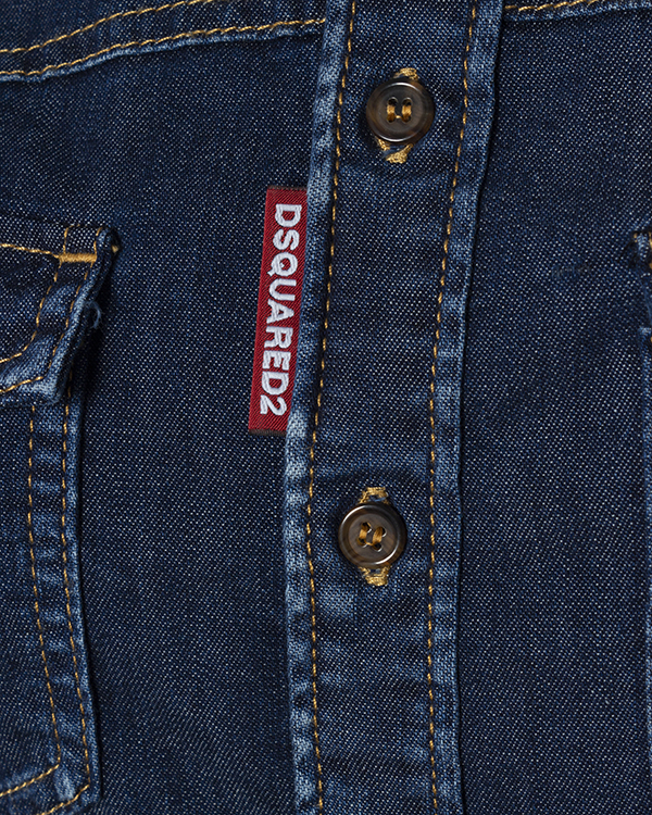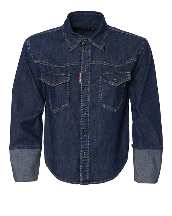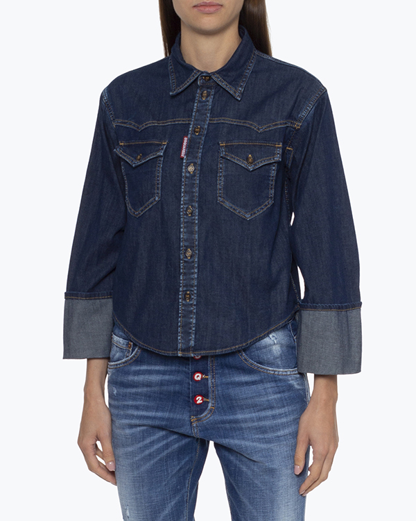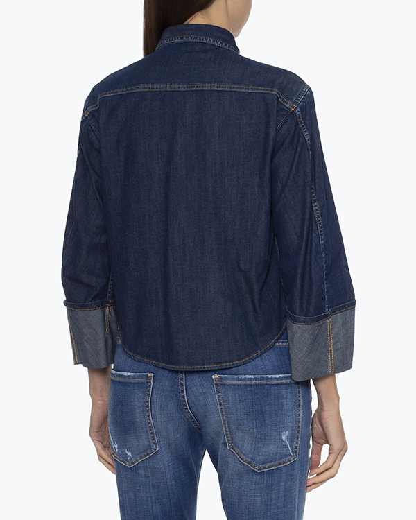 Рубашка из тонкого хлопкового денима темно-синего оттенка. Укороченное изделие прямого силуэта с застежкой на пуговицы и закругленной линией низа. Рубашка с прорезями под рукавами.