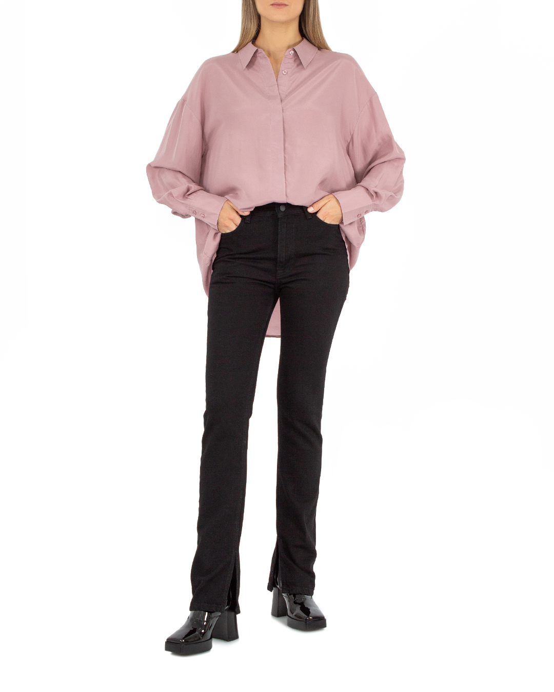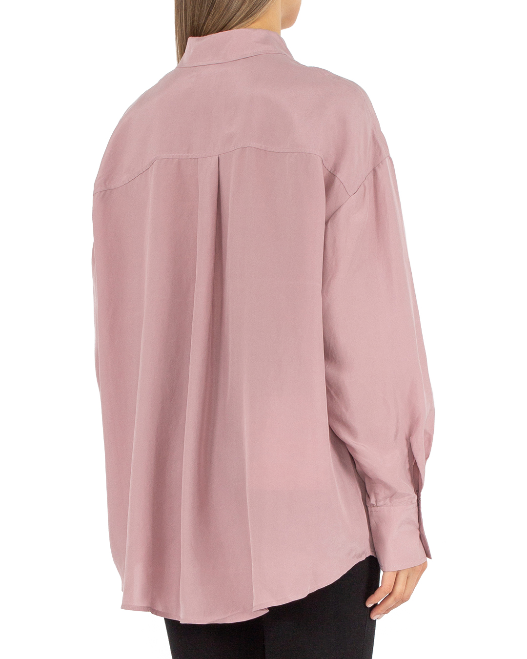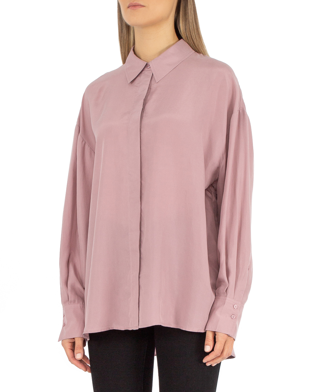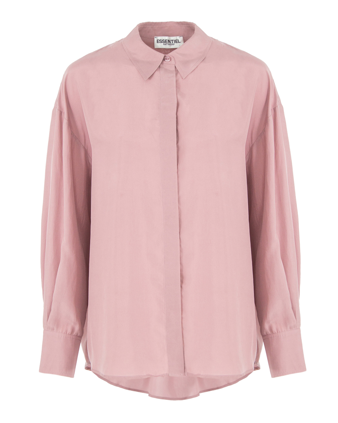 Рубашка Essentiel из шелка свободного силуэта. Модель прямого кроя с застежкой на пуговицы и планку дополнена отложным воротником и закругленной линией низа.