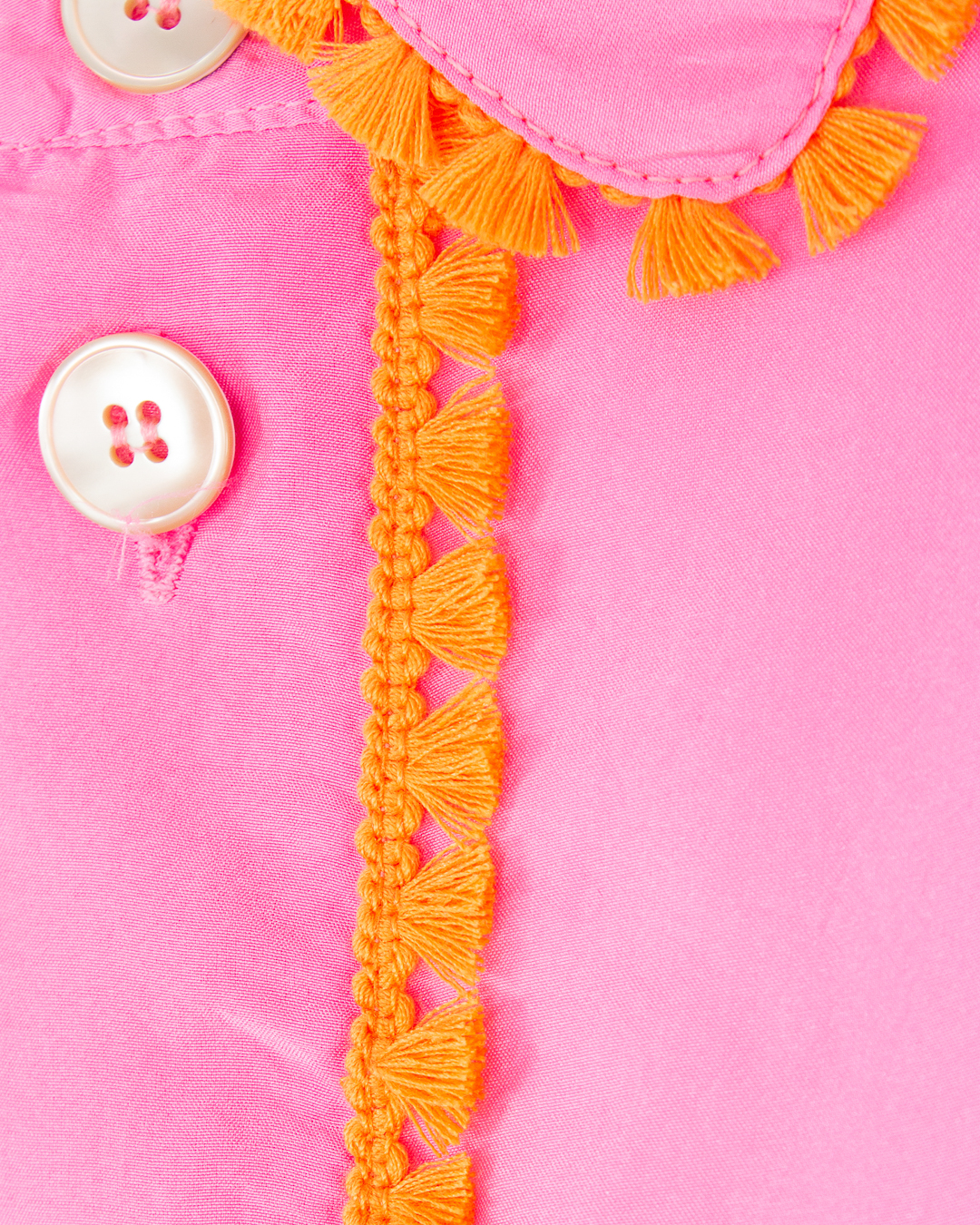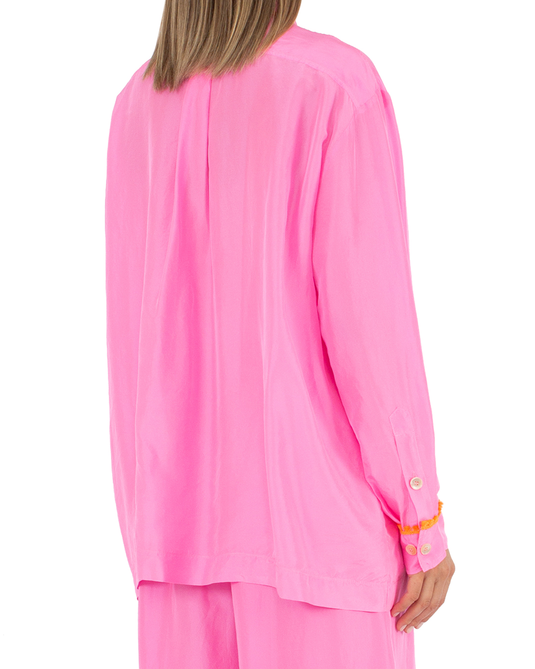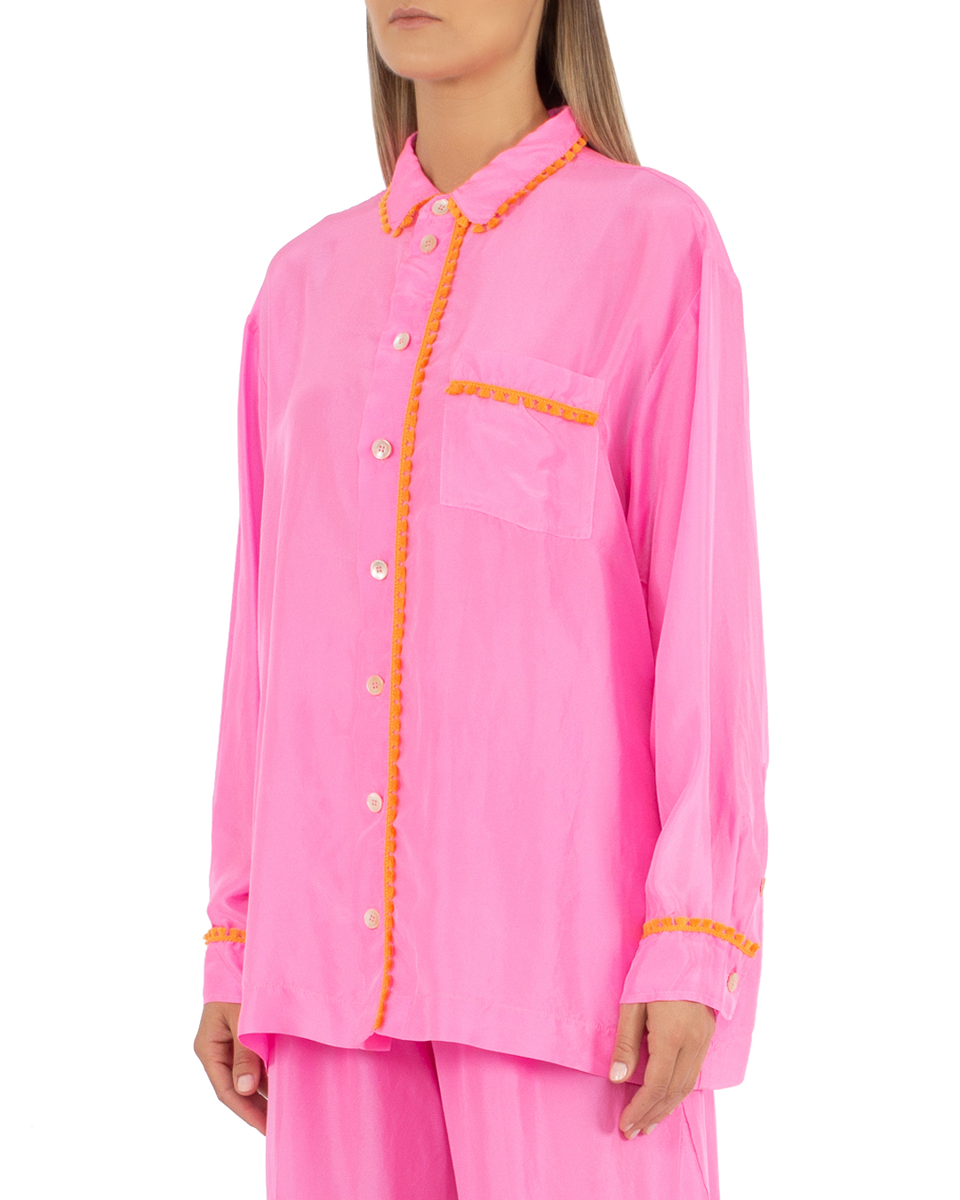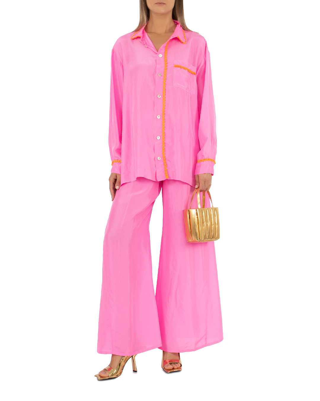 Блуза forte_forte сшита из шелка розового оттенка с отделкой тесьмой. Изделие прямого силуэта в пижамном стиле с застежкой на пуговицы и отложным воротником.