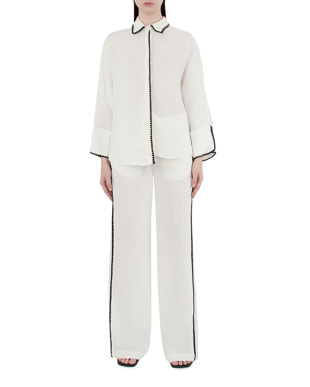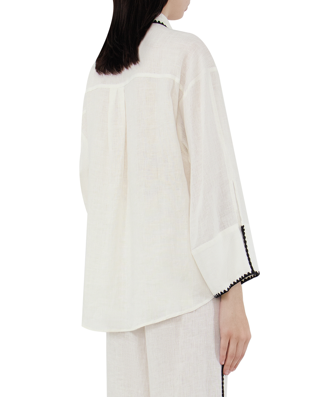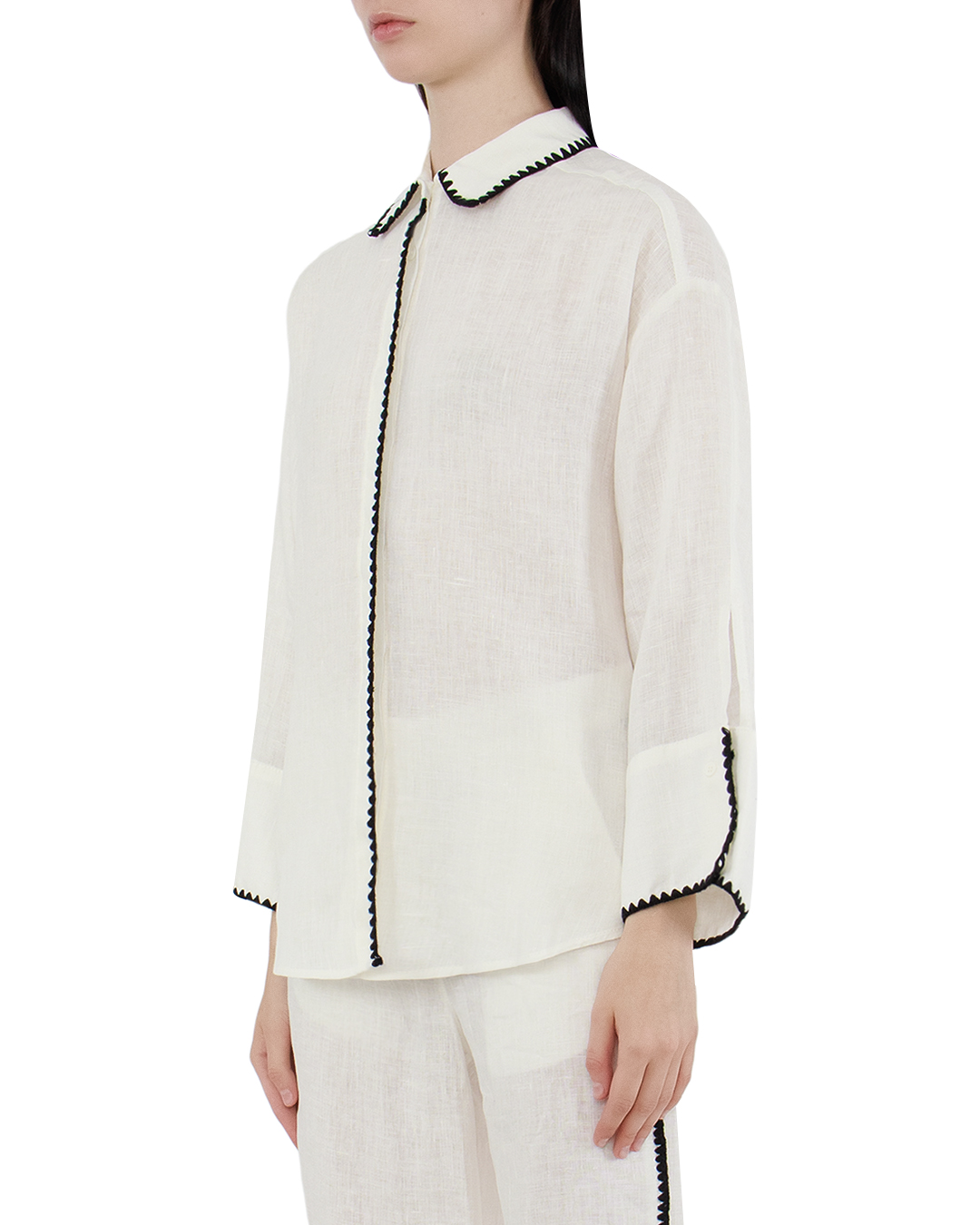 Эта рубашка — воплощение сдержанной элегантности с современным акцентом. Чистый белый цвет выступает идеальной основой для создания утонченного образа, который подходит и для деловых встреч, и для более непринужденных случаев. Отложной воротник придает изделию классическую строгость, в то время как контрастная отделка по краю воротника добавляет графичности и динамичного акцента. Такая же отделка проходит вдоль планки застежки и манжет, подчеркивая линейность дизайна и добавляя интересный визуальный элемент. Рубашка выполнена из легкой и дышащей ткани, что обеспечивает комфорт и позволяет коже дышать. Свободный крой и длинные рукава делают ее универсальной для любого времени года и способствуют созданию непринужденного силуэта. Детали отделки, выполненные с исключительным вниманием к качеству и деталям, подчеркивают высокий уровень мастерства и изысканности изделия, сохраняя при этом его практичность и современность. Эта рубашка станет стильным дополнением любого гардероба, привнося нотки шика и индивидуальности.